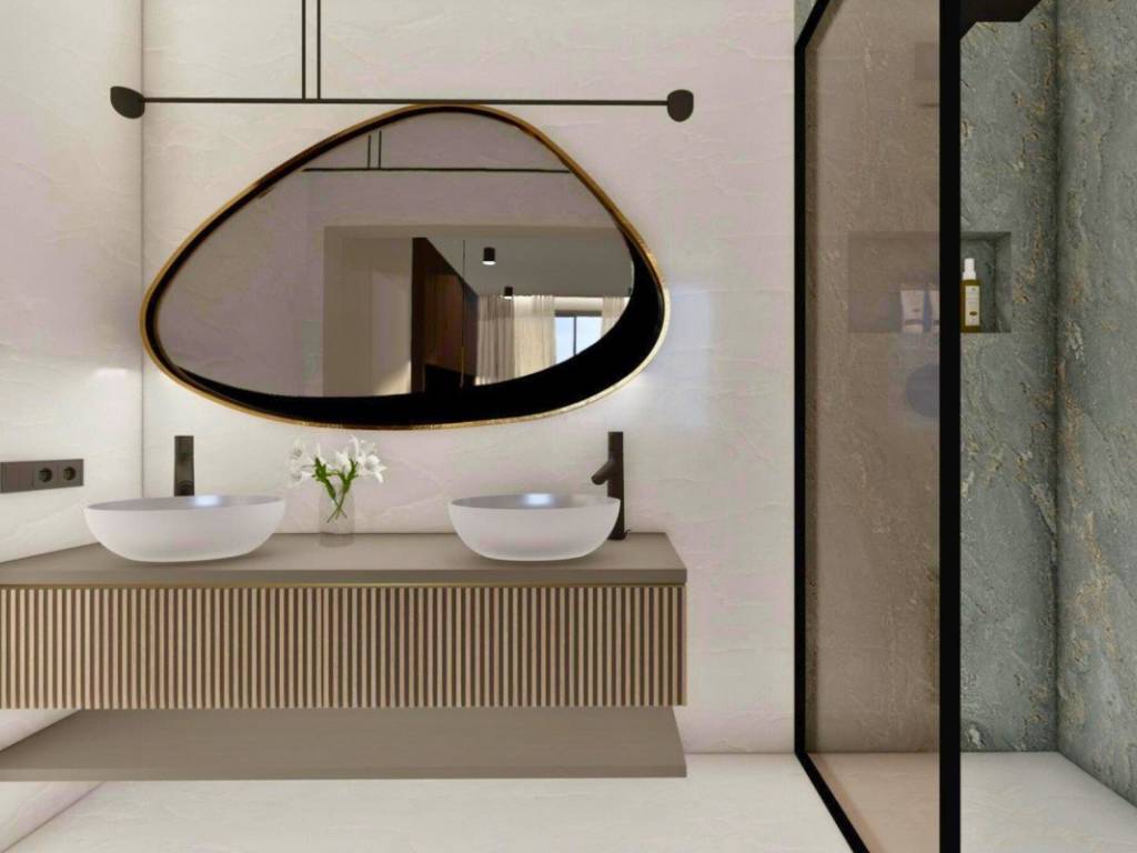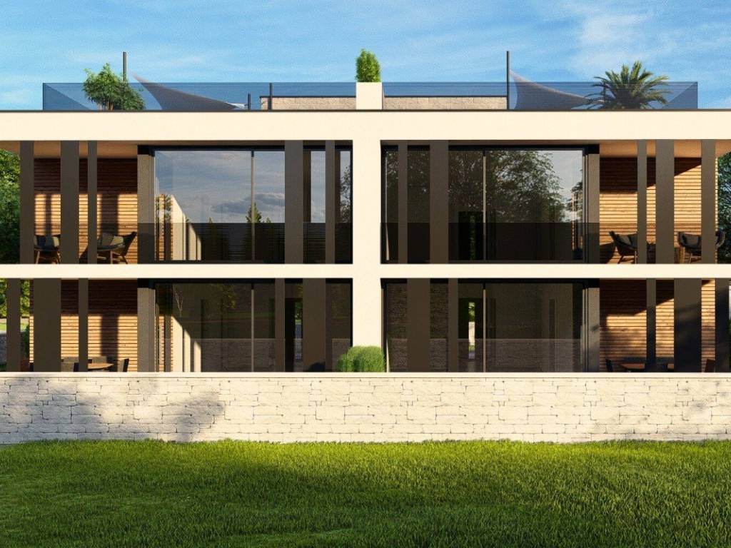 On the ground floor there are two apartments (each approximately 70 m) with two bedrooms, two bathrooms and an open-plan living room with kitchen and dining room. Each apartment has a covered terrace and a private garden with a swimming pool.