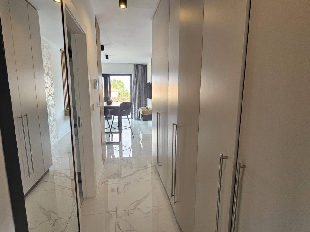 Nekretnini pripada uređena okućnica od 15 m te jedno parkirno mjesto u zajedničkom dvorištu zgrade. Oprema uključuje multisplit klimatizacijski sustav grijanja i hlađenja, podno grijanje, moderne sanitarije i podne obloge. Apartmani se prodaju potpuno namješteni kvalitetnim namještajem i električnim uređajima te su odmah useljivi. Nalaze se na mirnoj lokaciji, u blizini plaža i centra mjesta s potrebnim sadržajima.