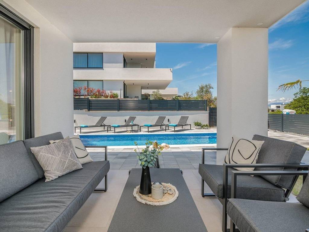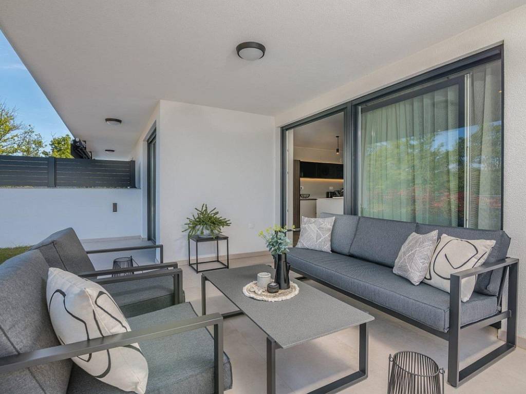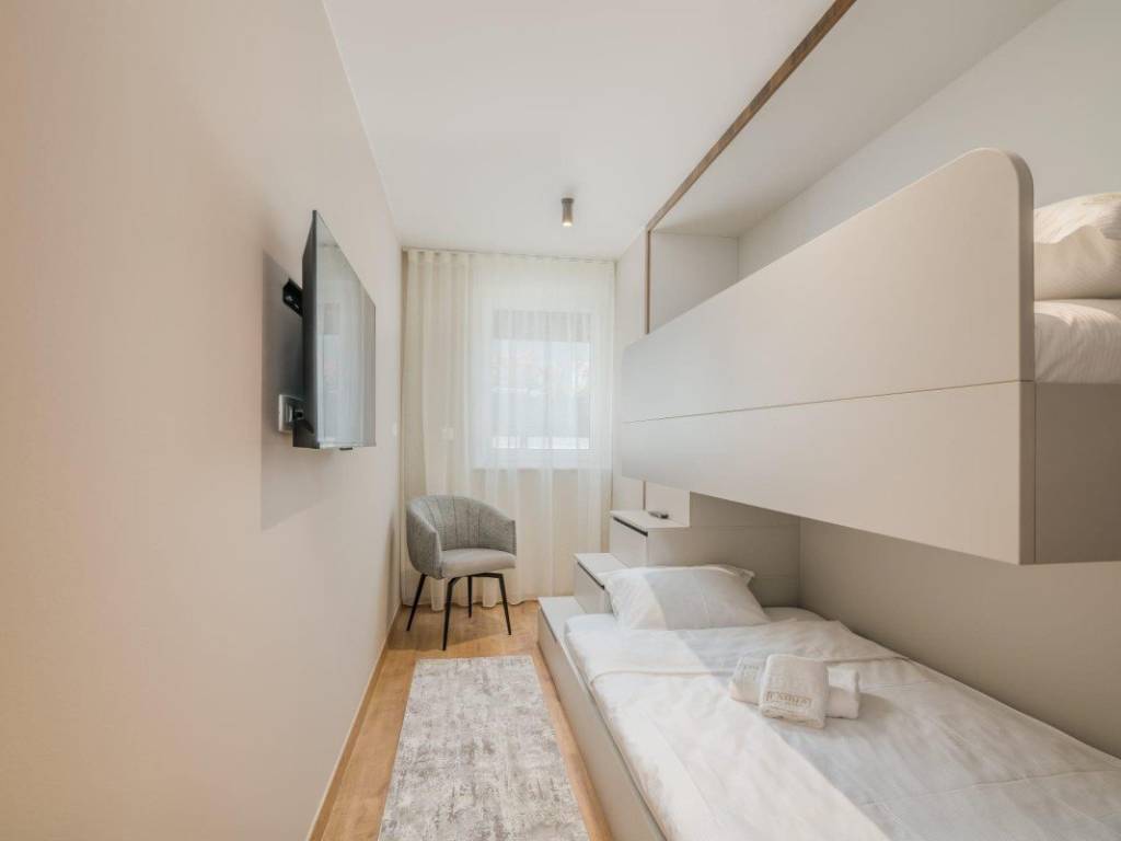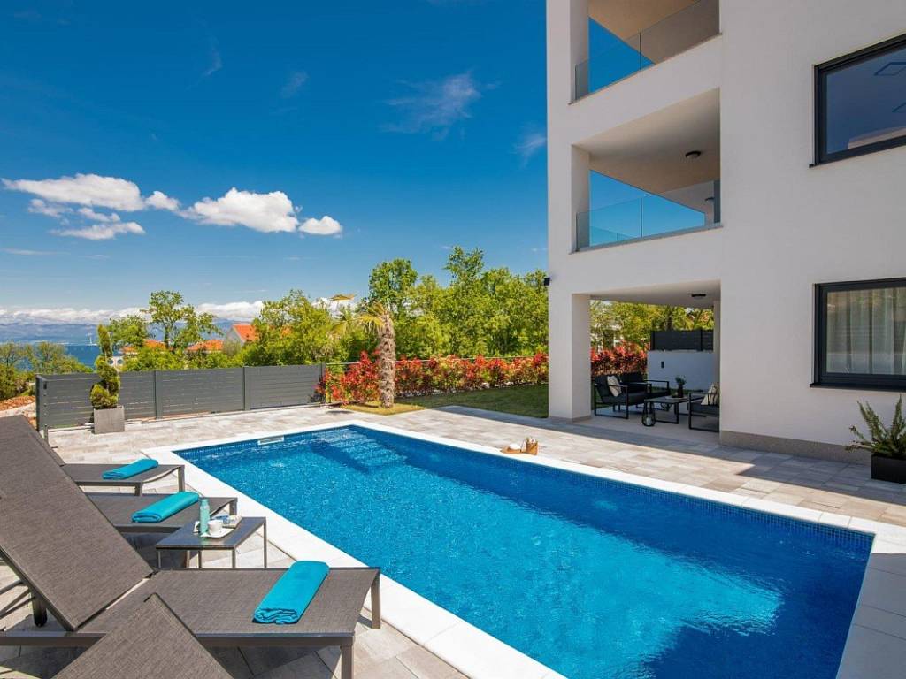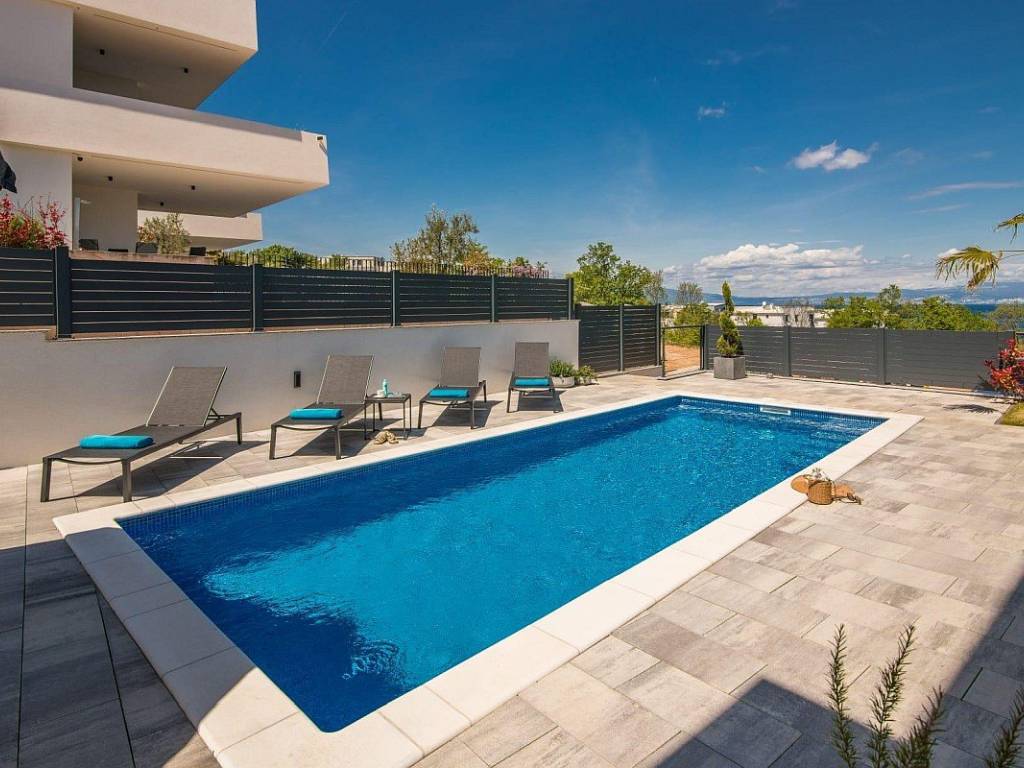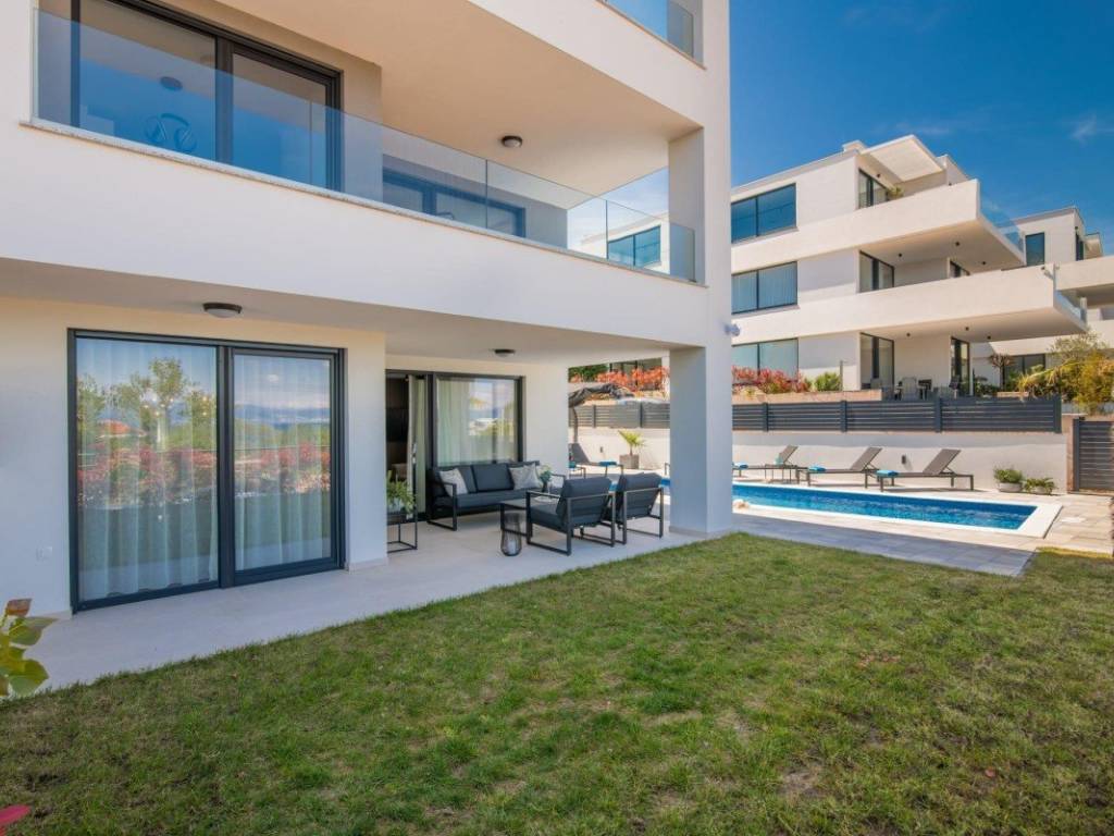 For sale is an apartment in Malinska, located on the ground floor of a new building with a garden and a swimming pool. The living area is 81 m, and consists of an entrance hall, toilet, three bedrooms, bathroom and kitchen, dining room and living room with access to a covered terrace. The 240 m garden is fenced and decorated and includes a 30.81 m swimming pool, sundeck, outdoor shower and summer kitchen, with a sea view.