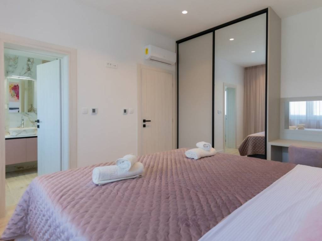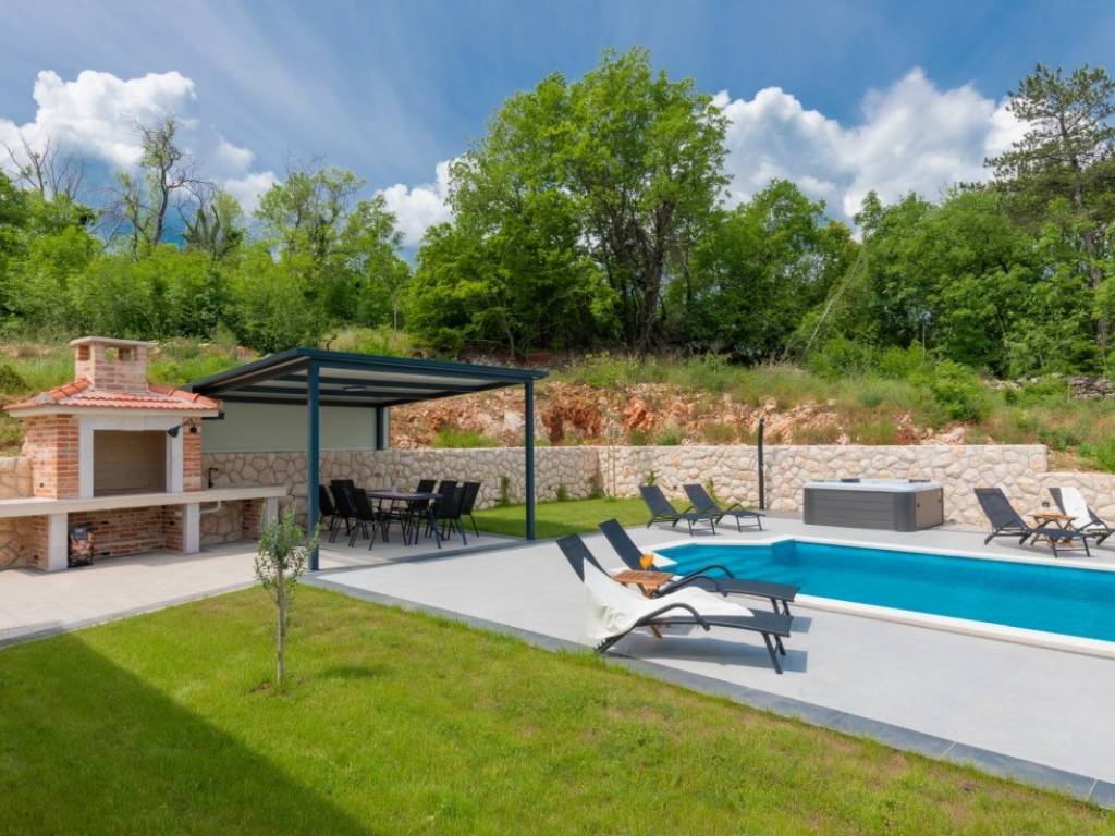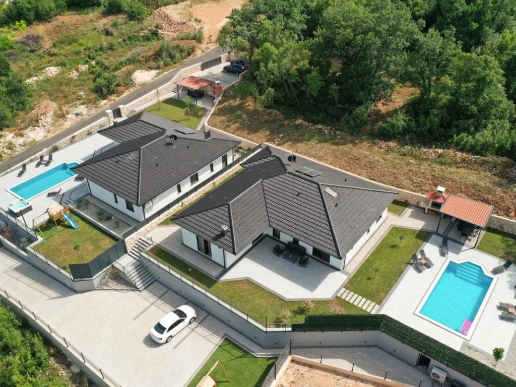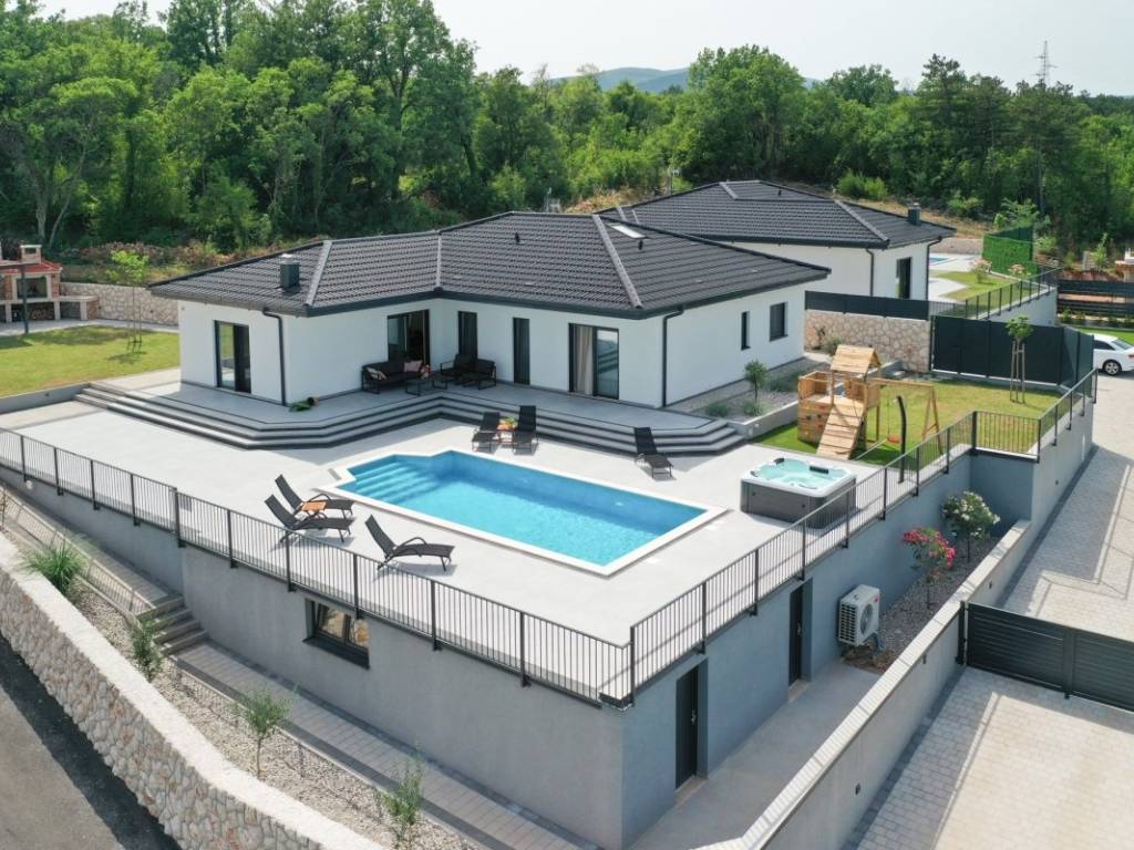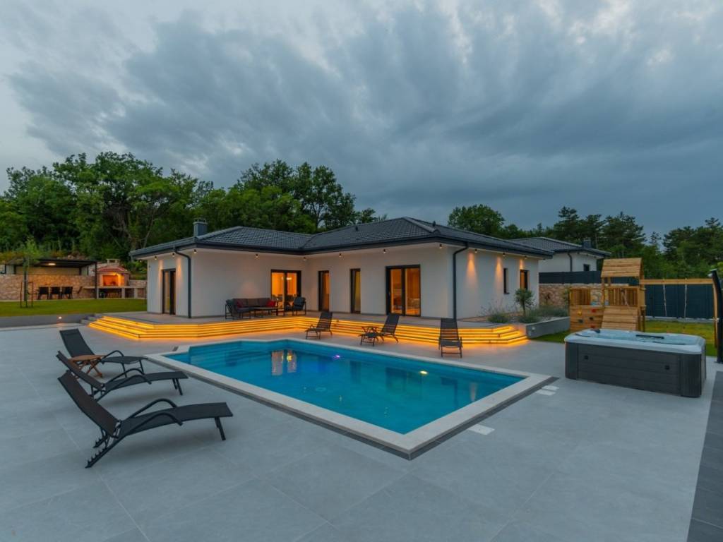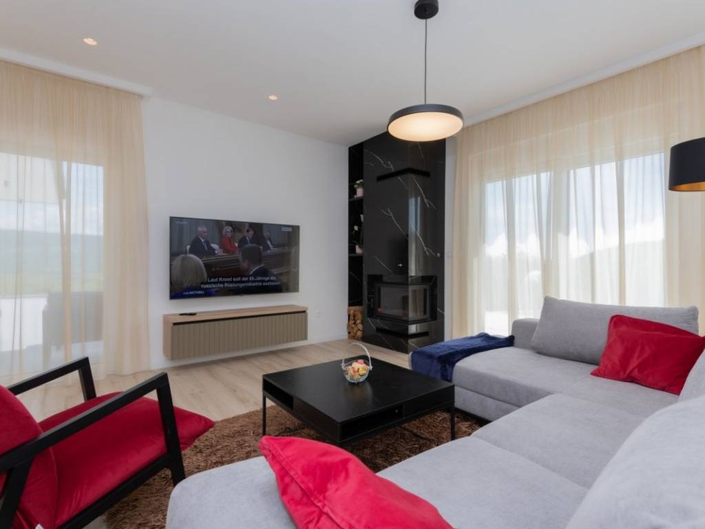The villa is spread over a plot of 1,040 m, with a net living area of 150 m. It is built of top-quality natural materials such as stone and wood, and is equipped with a modern smart system that allows for complete control over security, management and surveillance of the space. The interior includes a spacious open space living room with kitchen and dining room, three comfortable bedrooms, three modern bathrooms, an additional guest toilet and a wellness area with a sauna. The exterior features a jacuzzi, a carefully landscaped garden with a relaxation corner, a childrens playground and a fireplace area that further enriches the experience of staying there.