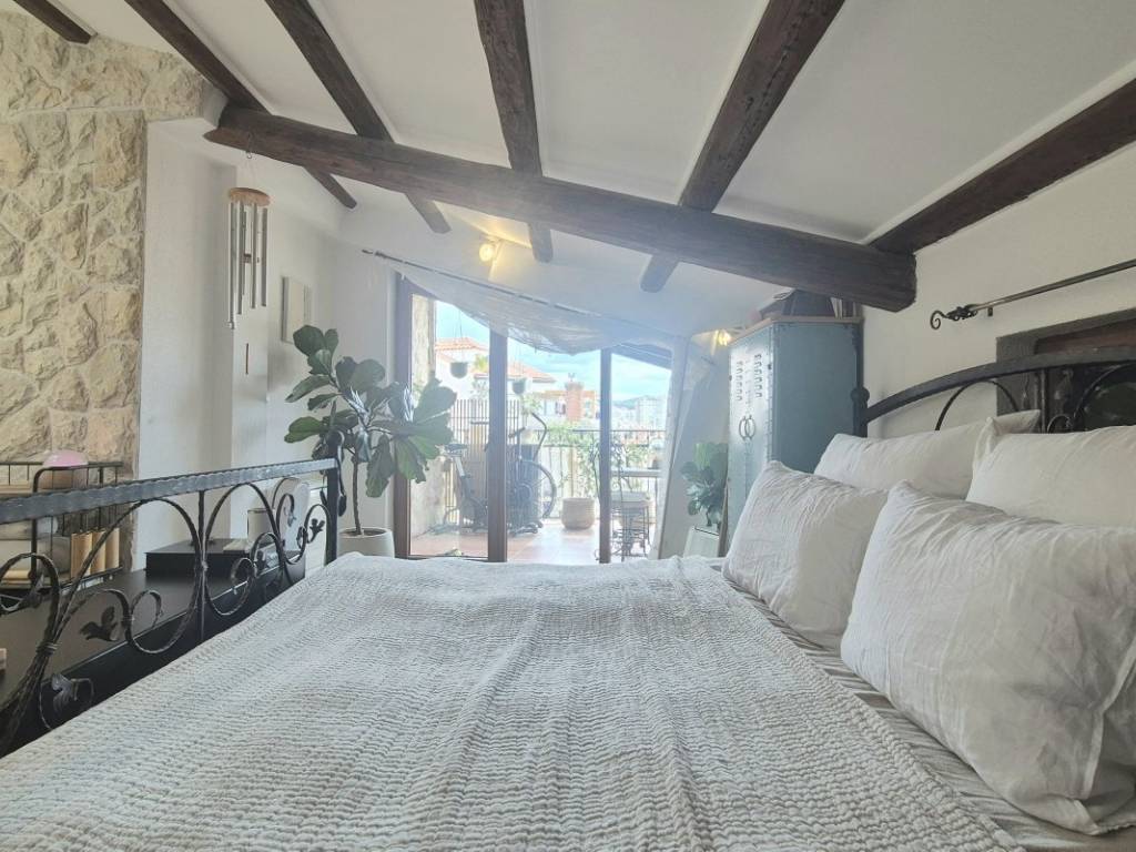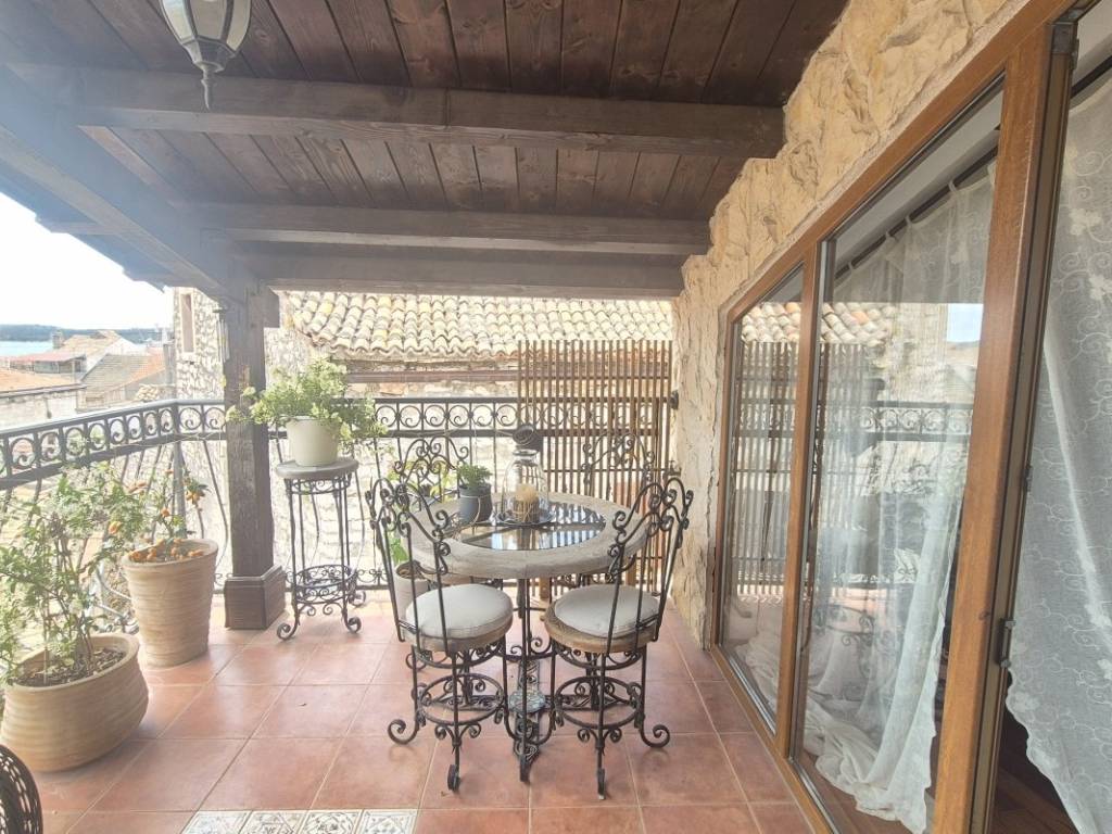 On the ground floor, there is a studio apartment with a separate entrance. Above it is an apartment spread over three levels. The first level includes a kitchen, dining area, and bathroom. The second level contains a living room and one bedroom, while the third has an additional bedroom and a terrace offering views of the old part of town and a partial sea view.