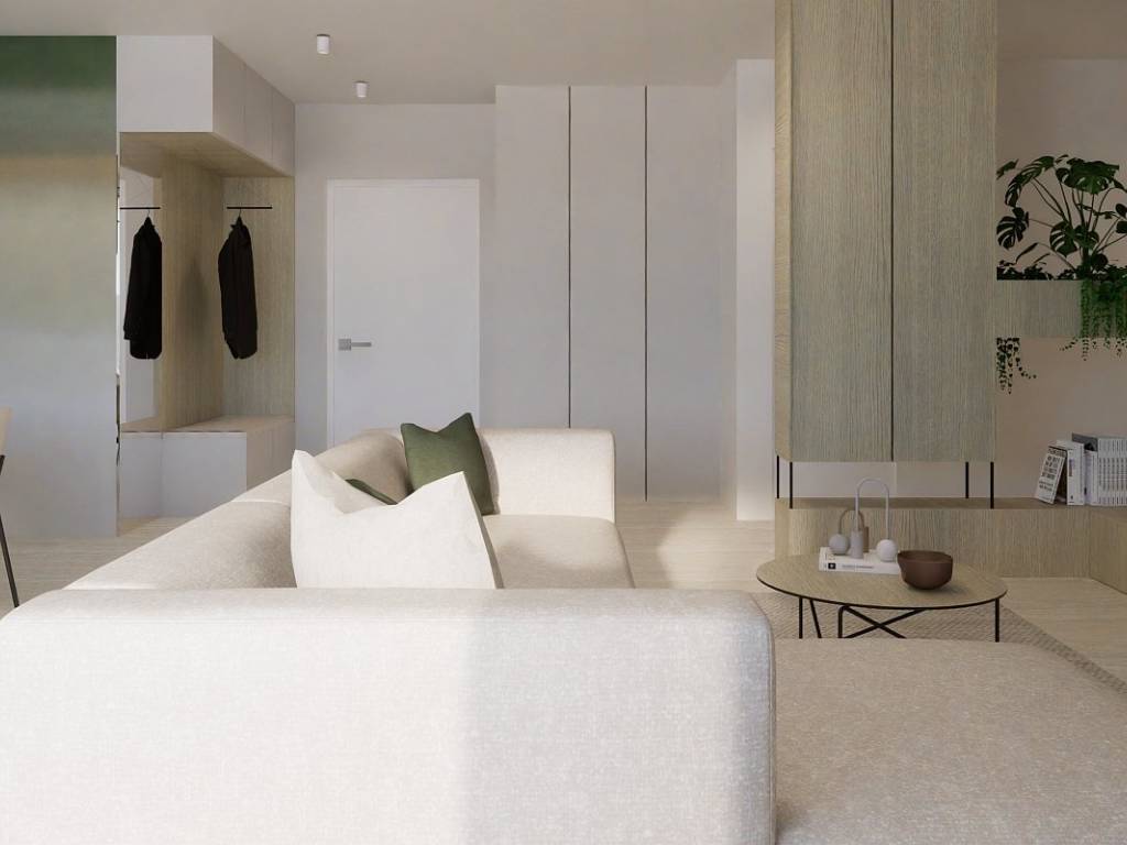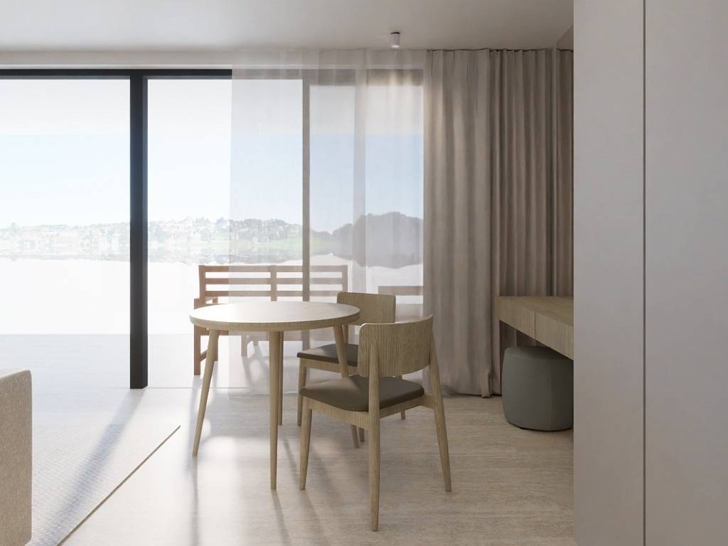 The apartment is accessed from a staircase and immediately from the main entrance there is a view of the sea from the kitchen, dining room and living room, all arranged in an open space concept.