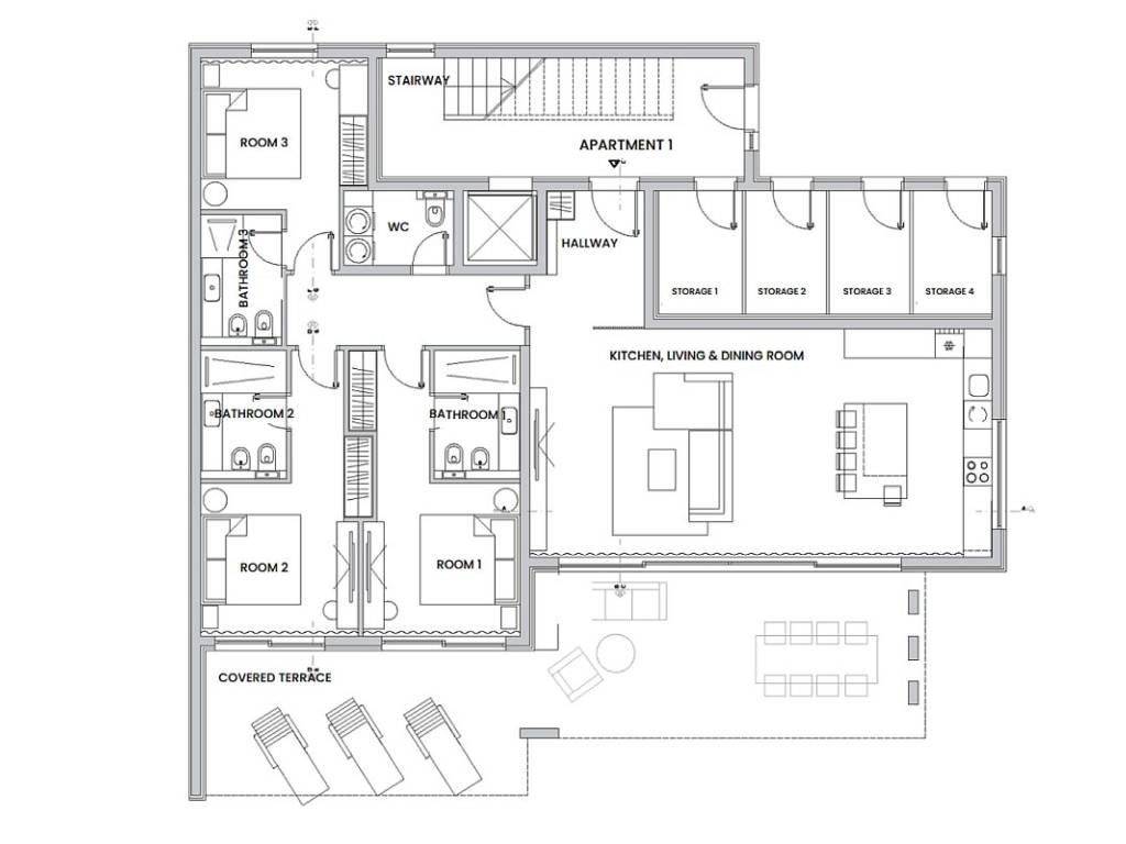 A hallway connects three bedrooms and a shared toilet with other rooms. Each bedroom has its own bathroom and access to a partially covered terrace, garden and sundeck with a swimming pool.