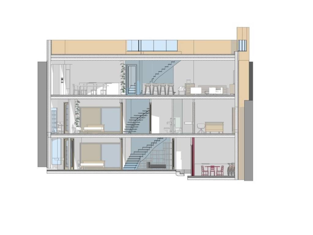 The first project envisages a functional layout with an entrance area on the ground floor with a hallway, bathroom, wellness room with sauna and two bedrooms, each with its own bathroom.