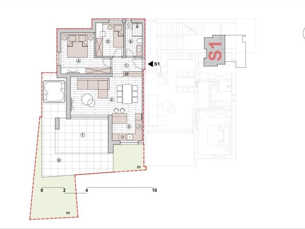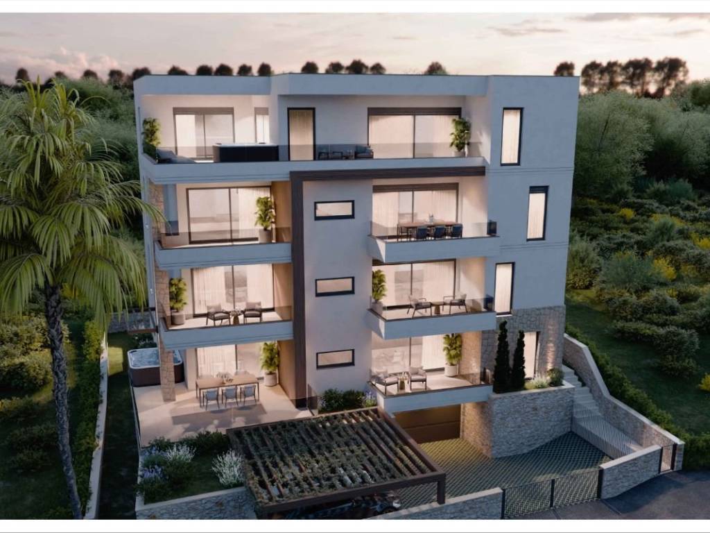 A luxuriously designed two-bedroom apartment located in a new building with a total of seven apartments, spread over four floors. This elegant apartment, located on the ground floor of the property, covers 69.64 m2 of living space, with the addition of an 18.25 m2 courtyard and a partially covered 38.17 m2 terrace, perfect for relaxing. The terrace has a jacuzzi, ideal for relaxing, as well as a comfortable corner for relaxing with a sea view.