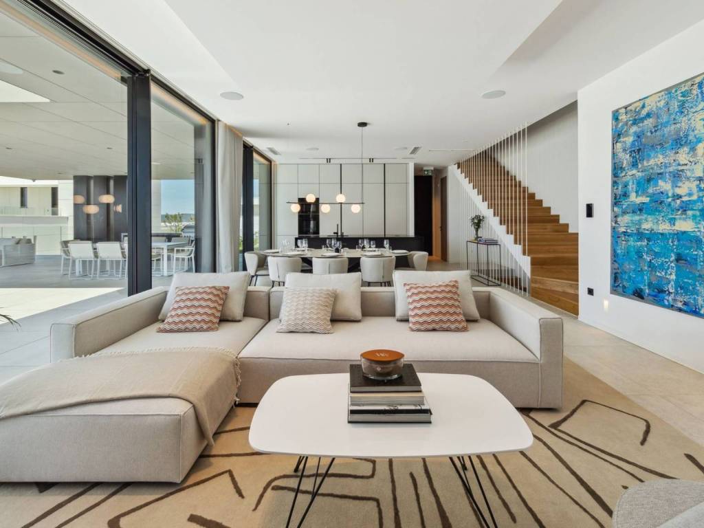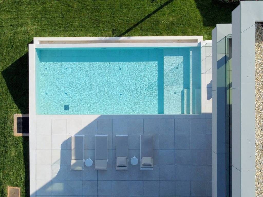 Large floor-to-ceiling windows fill the interior with natural light, seamlessly merging the modern kitchen and living areas with the stunningground-floor terrace. Perfect for both relaxation and entertaining, the villas courtyard includes aprivate heated swimming pool, a lushgarden, a summer kitchen, a two convenientoutdoor parking spaces.
