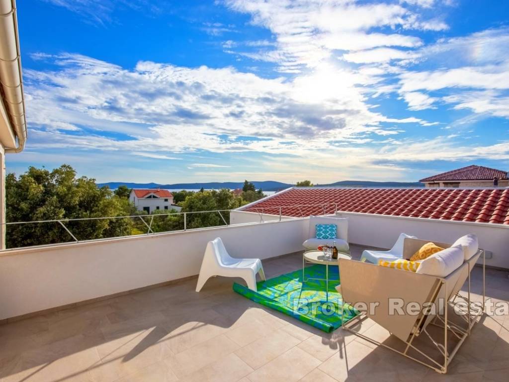 Internal stairs lead to the second floor, which contains 3 rooms, each with its own bathroom and a large terrace with a view of the sea.