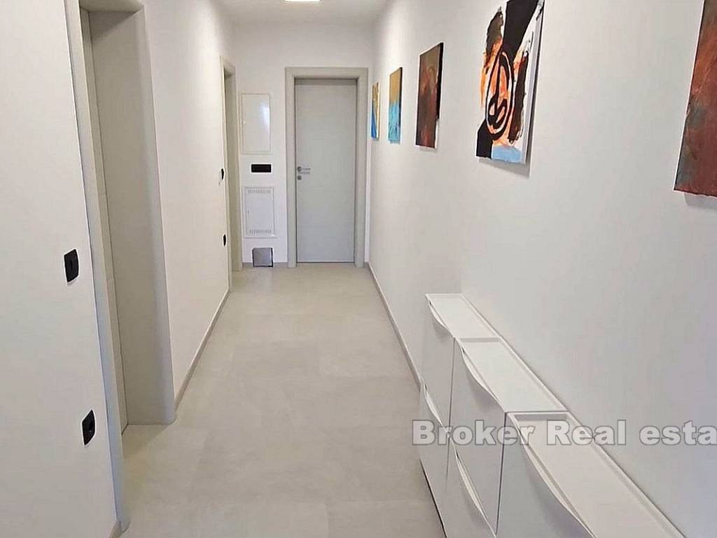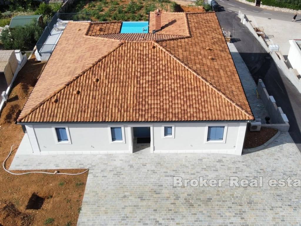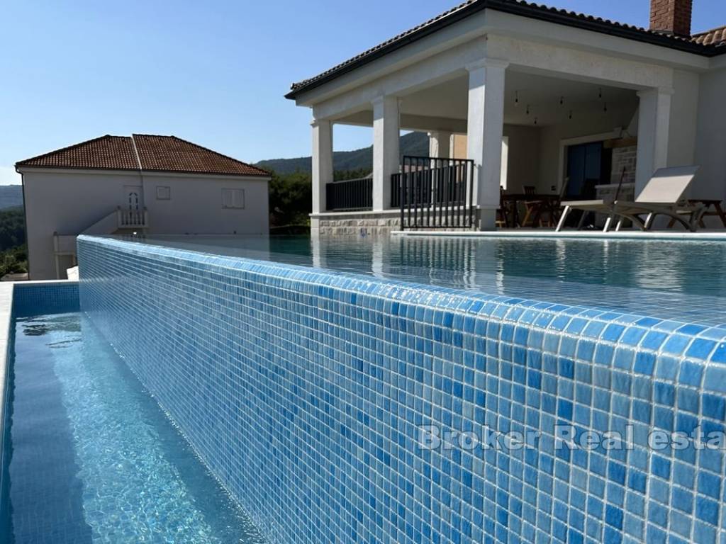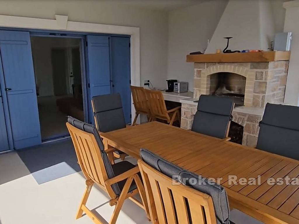 On the first floor, there is an open space consisting of a living room, a dining room and a kitchen, and three bedrooms, each of which has its own bathroom and a separate exit to the terrace. In the garden there is a large terrace with a pool and a summer kitchen with a barbecue.