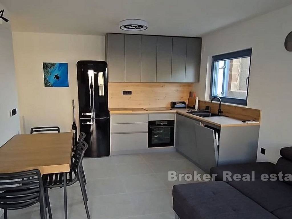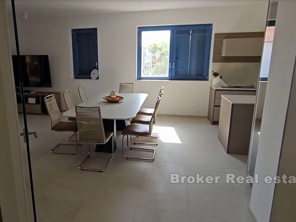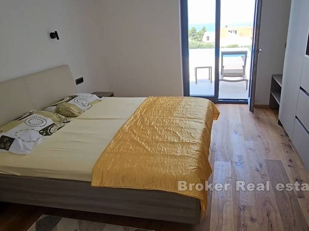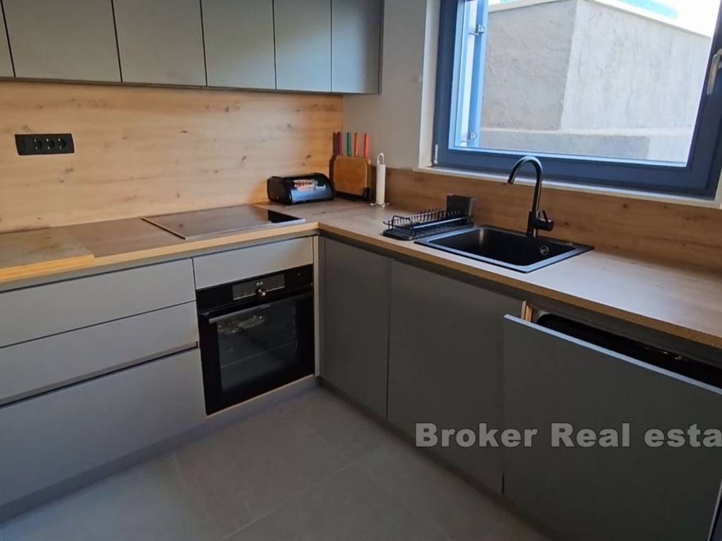On the first floor, there is an open space consisting of a living room, a dining room and a kitchen, and three bedrooms, each of which has its own bathroom and a separate exit to the terrace. In the garden there is a large terrace with a pool and a summer kitchen with a barbecue.