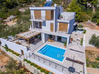 In the small town of Sveta Nedjelja on the southern coast of the sunny island of Hvar, there is an elegant newly built villa with a living area of 240 m2, a 343 m2 garden, with a swimming pool, two parking spaces and a boat mooring in the nearby commercial marina.