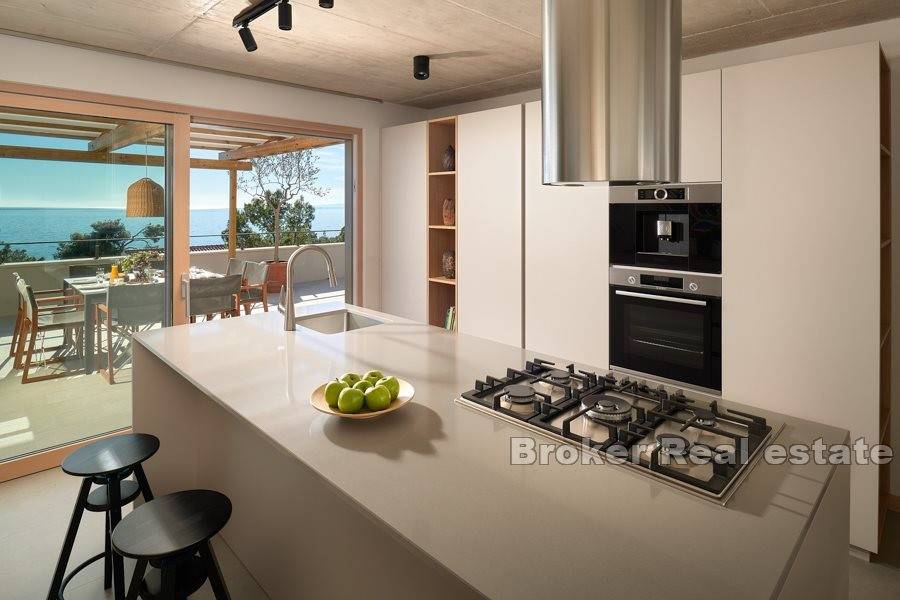 Thanks to large sliding doors, the ground floor, as well as the remaining floors, are always sunny and full of daylight and very pleasant to stay in. All floors are air-conditioned, and the villa itself is equipped with elegant designer furniture (Prostoria sofa, Artisan dining table and lamps, Unopiu garden furniture, Villeroy and Bosch dishes, built-in coffee machine and kitchen appliances, wine refrigerator) and is made of the highest quality materials (oak floors in the rooms, external insulation of 10cm rock wool, underfloor heating in the bathrooms, including the shower, wooden and aluminum joinery, cedar shutters)