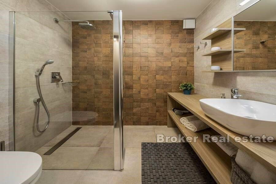 The first floor consists of three bedrooms, each with its own bathroom and access to the south-facing terraces, which offer a panoramic view of the sea and the surrounding nature.