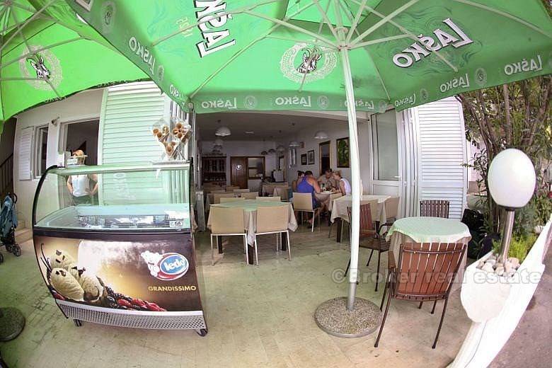 Hotel nudi prostranu terasu ispred koja se koristi kao kafić. Terasa je u potpunosti prekrivena hladovinom koju pružaju borovi.
