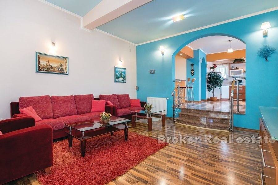 On the basement level of 50 m2, there is a storage room, a billiard room and a fitness room. The ground floor of 150 m2 consists of a living room, a kitchen with a dining room, a toilet, a laundry room, one bedroom with an attached bathroom and a wardrobe, with the possibility of arranging two more bedrooms. From the living room there is access to the covered terrace that leads to the swimming pool. An internal staircase leads to the first floor, where there is a kitchen with a living room, three bedrooms, three bathrooms and three terraces (one covered), two of which have a view of the sea and the town.