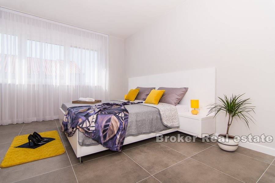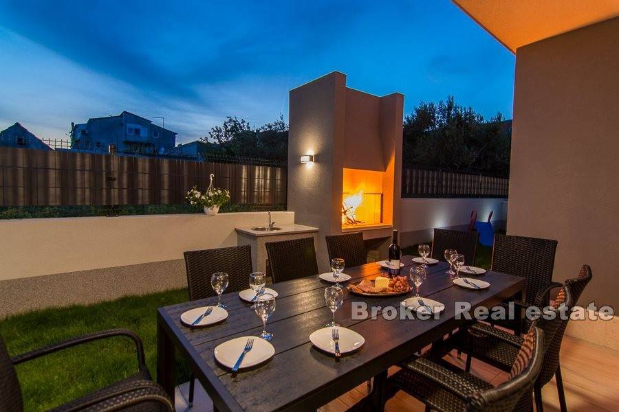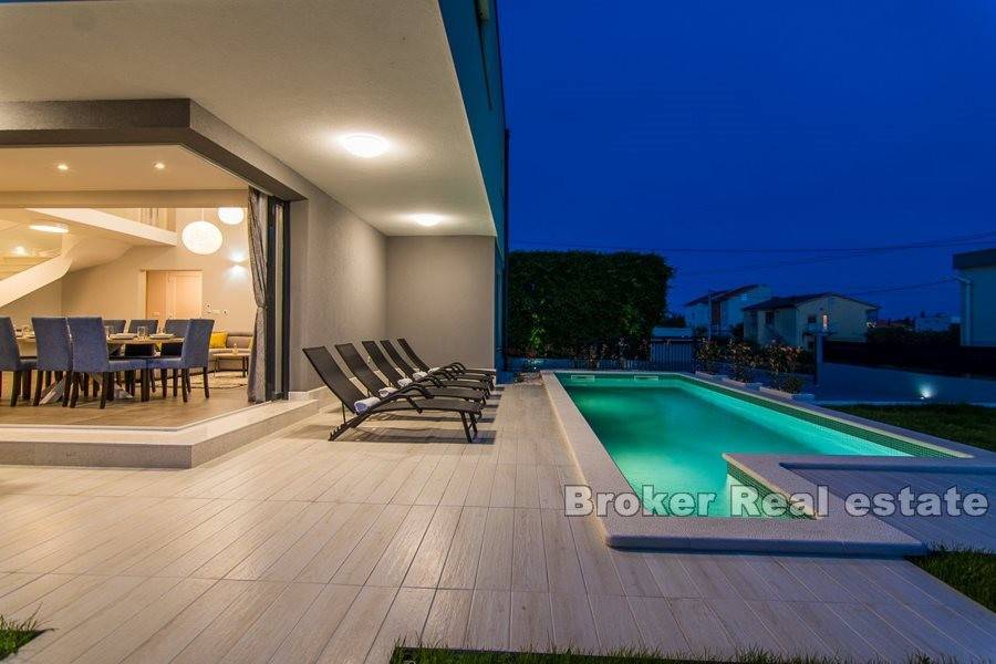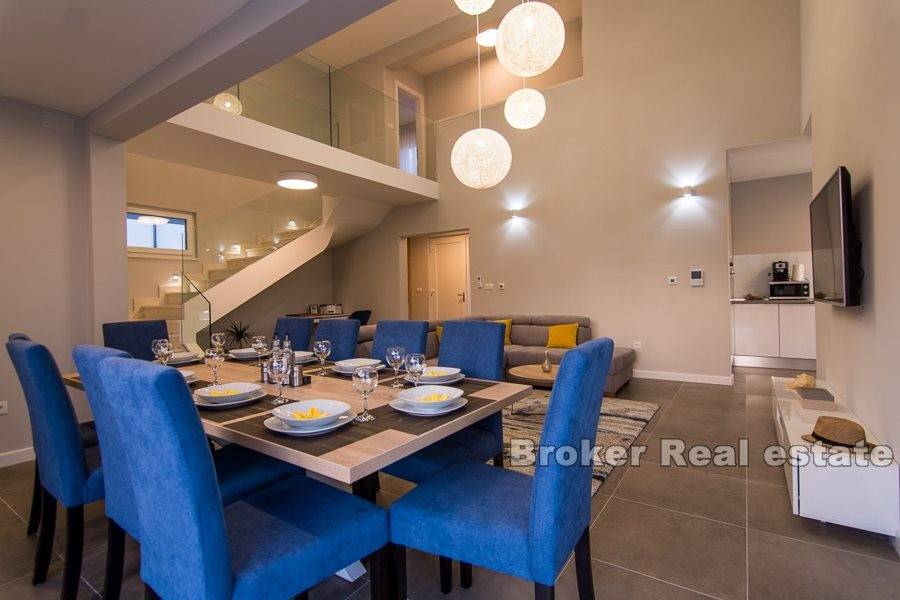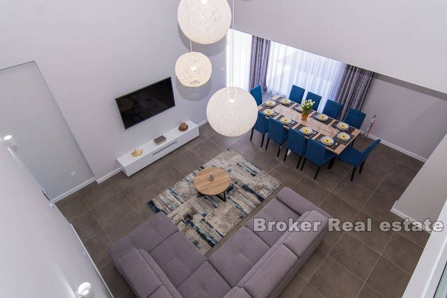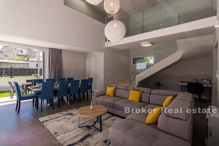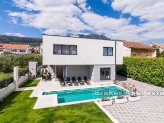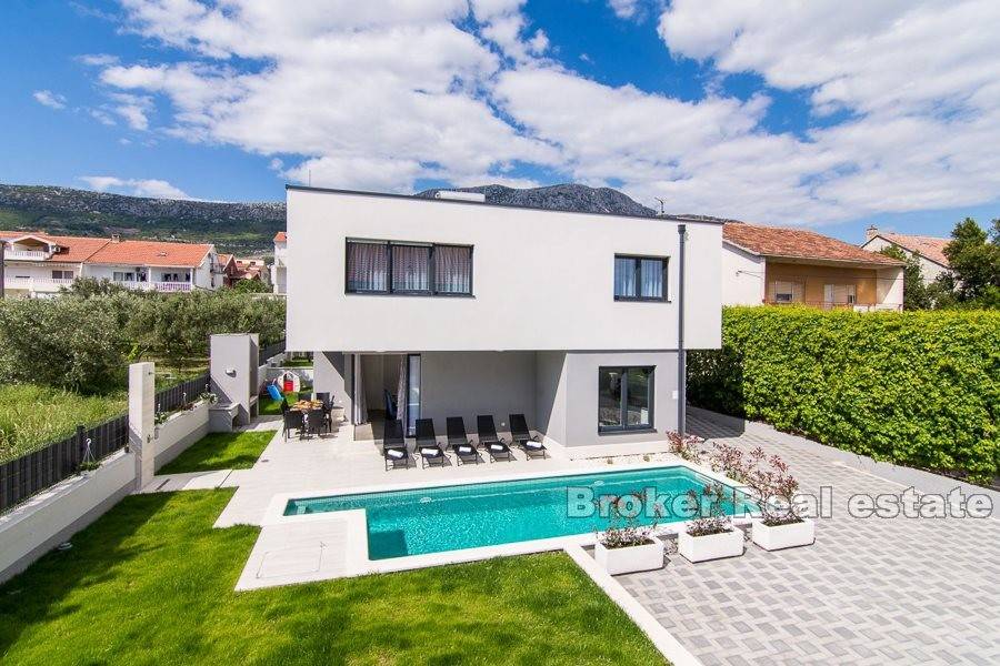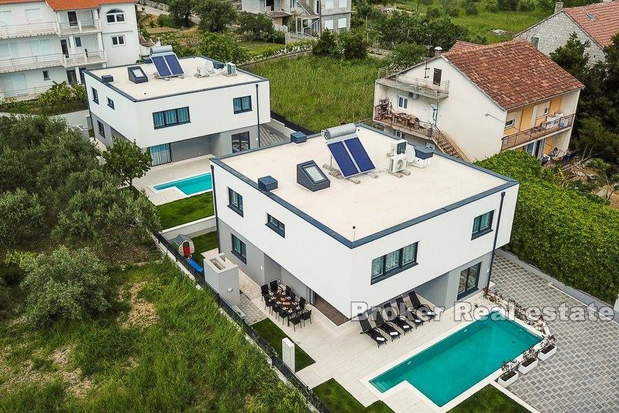 Complex of two villas located in Kastela, at a distance of 350 m from the sea. The villas are built according to the project in a modern and functional architectural solution. Each villa consists of 202 m2 of living space with a garden of 433 m2. It spreads over two floors. It consists of 5 spacious bedrooms, 5 bathrooms, kitchen, hallway, gallery and a spacious living room with dining area with total area of 43m2 (height 6m). The floors are connected by an internal staircase. Given the height of the interior space and the use of large glass sliding walls, the space is filled with natural light. The garden of each villa contains a swimming pool of 25 m2, outdoor grill and a covered outdoor space organized for socializing. The villas are under video surveillance. Possibility of parking for 8 cars (4 for each villa). Nearby are all the facilities needed for a comfortable stay.