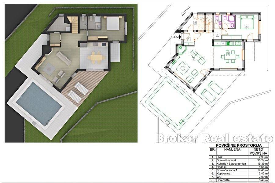 An elegant small villa with a swimming pool, for sale, located near the Solaris hotel complex and the town of Šibenik. The villa is a newly constructed, located on a plot of 480 m2, with a total living area of 200 m2.