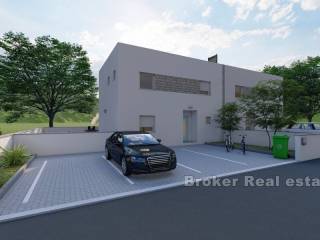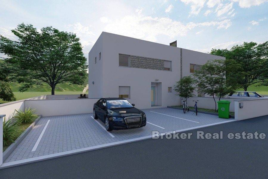 The ground floor has a kitchen with dining area, living room, bathroom, storage room and one bedroom, while the first floor has two bedrooms with private bathroom and storage 8m2, with all necessary connections for washing machine and dryer.