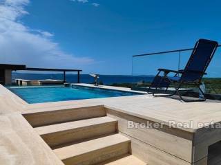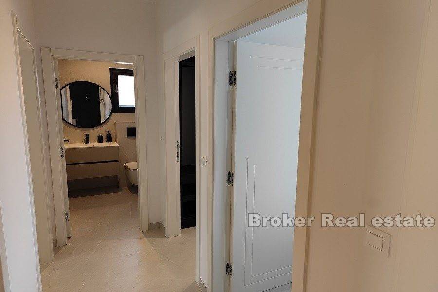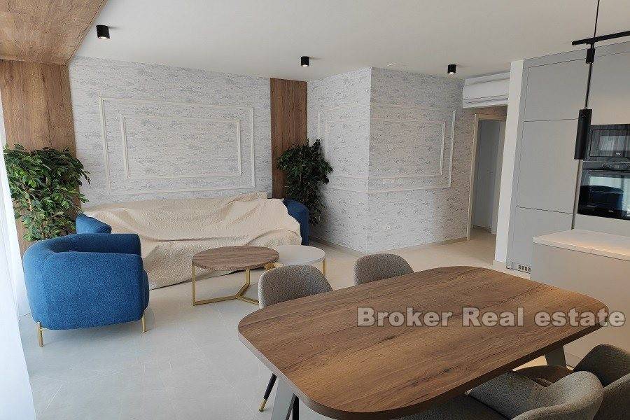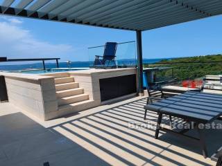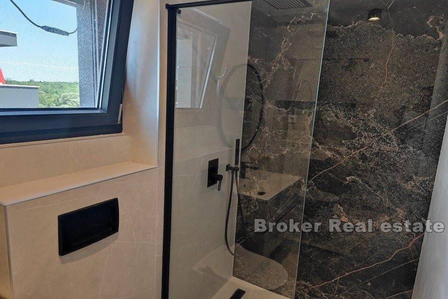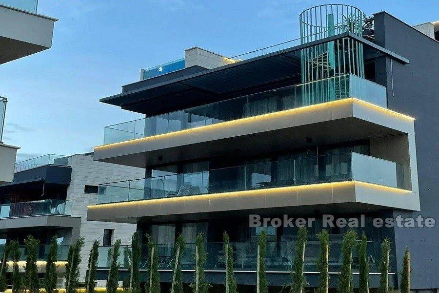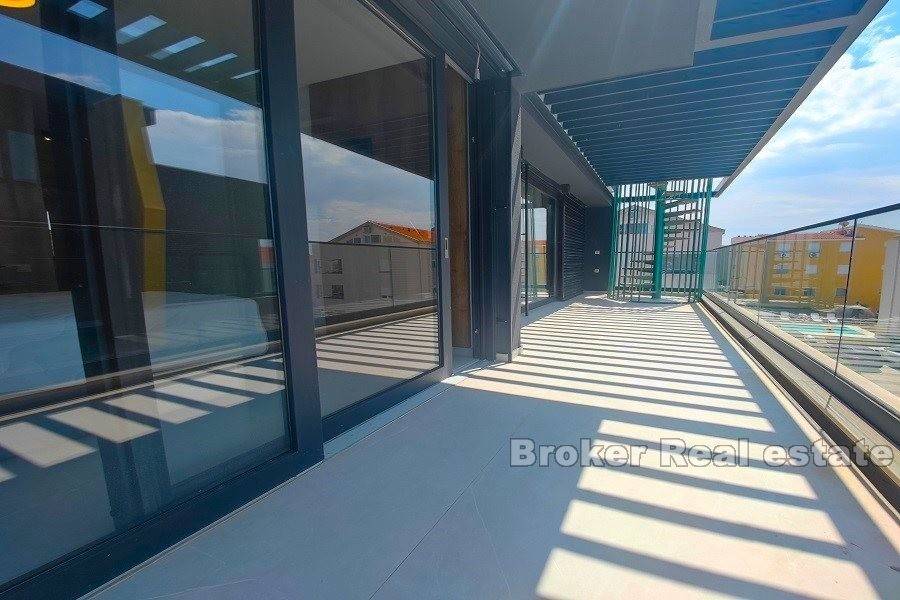 Zadar penthouse with pool. The penthouse is located in a new building of a high construction standard, in an elite part of the Zadar area. It consists of two floors On the lower floor there is a comfortable three-room apartment consisting of a living room with a kitchen and dining room, a large loggia, a hallway and 3 bedrooms, each with its own bathroom. On the upper floor there is a roof terrace with a view of the sea. On the roof terrace there is a swimming pool, a summer kitchen with space for family gatherings and a jacuzzi. The apartment also has two parking spaces. Residential location, close to all amenities, as well as close to the airport and highway.