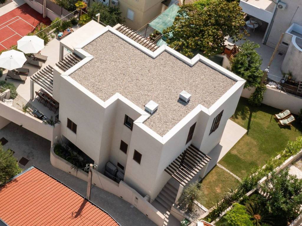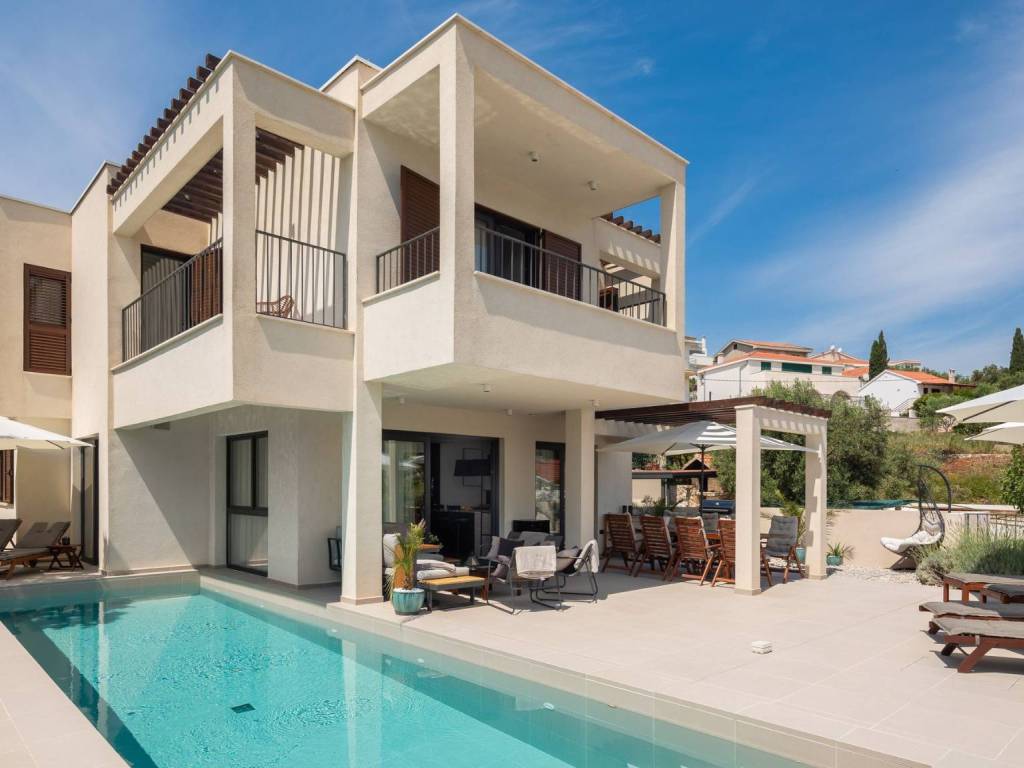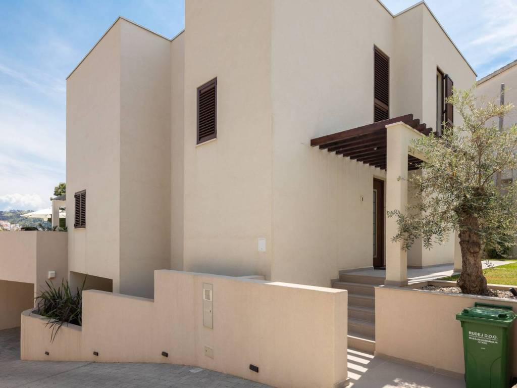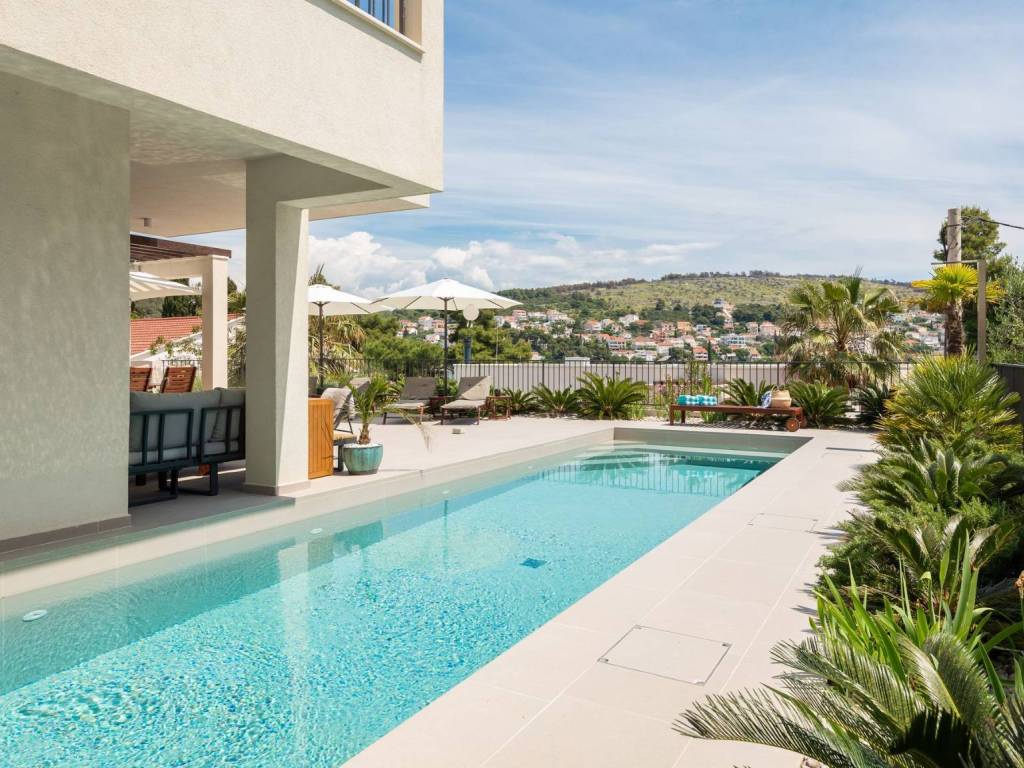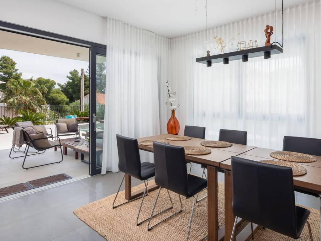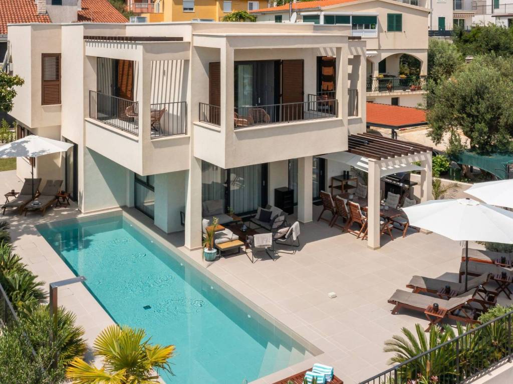New modern villa with a pool in the second row to the sea in Čiovo. Villa with a landscaped garden of 500m2 located only 50m from the sea in a beautiful pebble bay. The villa has 280m2 equipped with high-quality equipment, installations and luxury furniture. On the ground floor: a bedroom with a bathroom and an entrance hall (small living room), a garage for two cars, and an engine room for the swimming pool. On the first floor: a large living room with a modern kitchen and a spacious dining room and an exit to a large terrace and a covered lounge area with a heated pool and sun deck. On the second floor: three bedrooms with built-in wardrobes and private bathrooms and a balcony with an open view of the sea. The villa is sold fully furnished. Equipped with alarm system and cameras, automatic garden irrigation system, fire alarm, wifi internet network, underfloor heating in all bathrooms, fully air-conditioned.