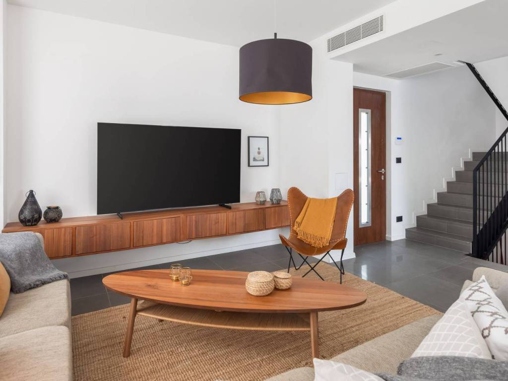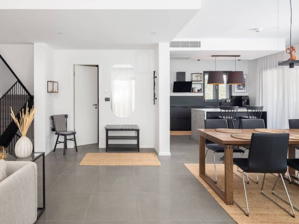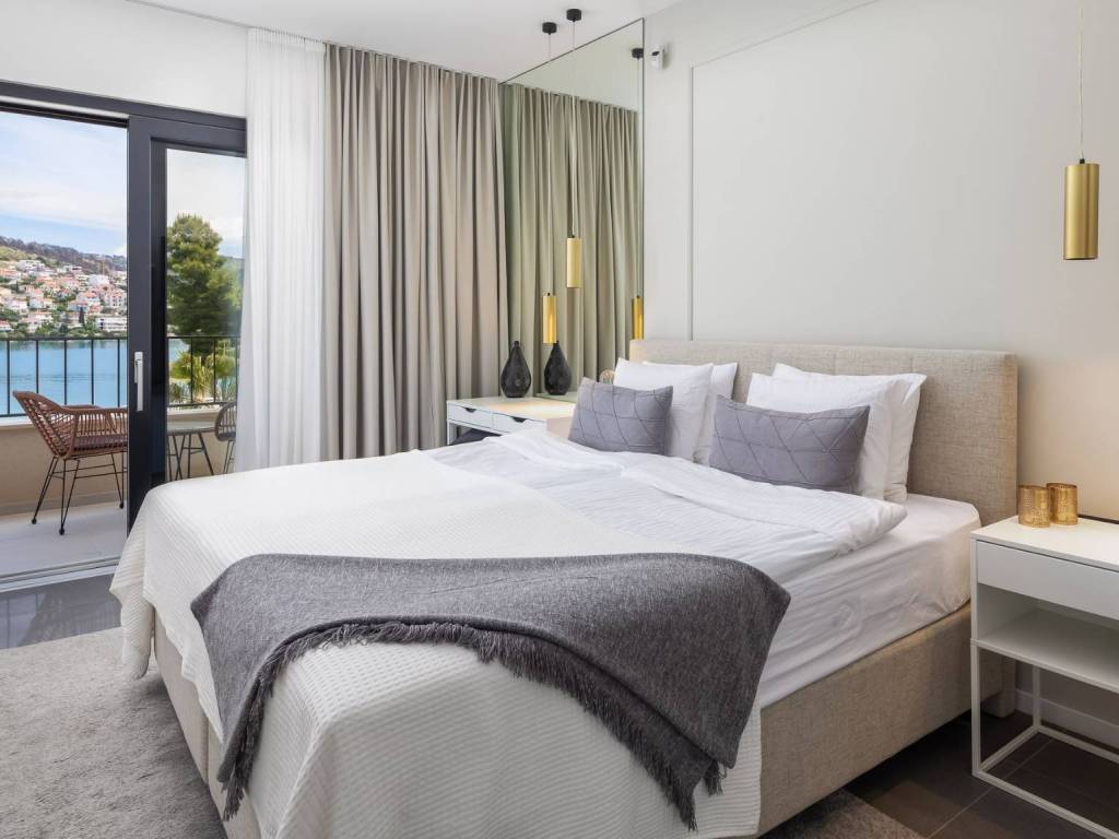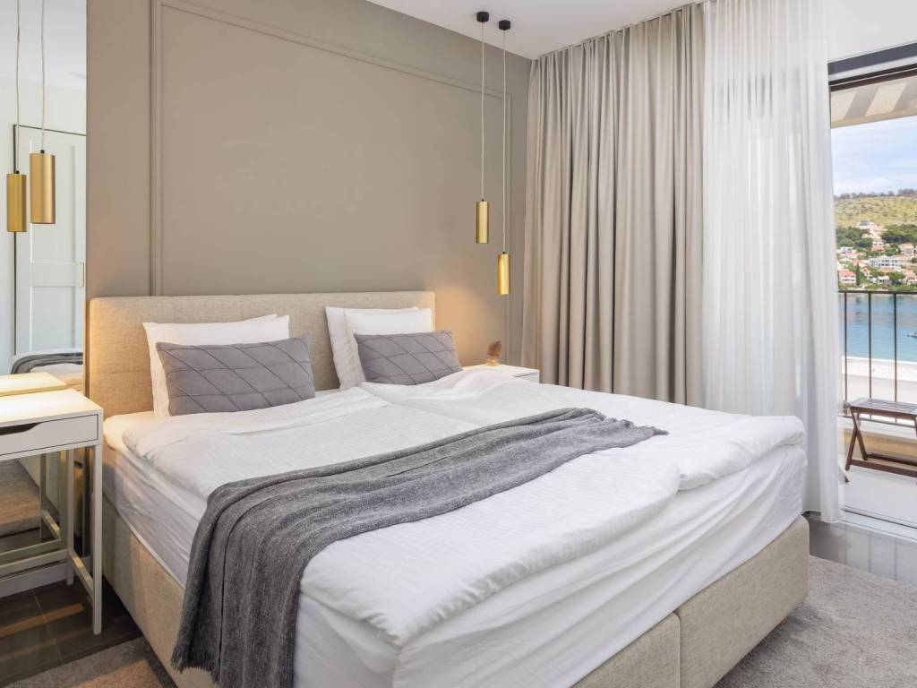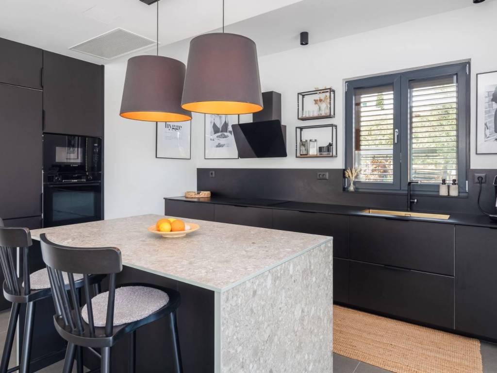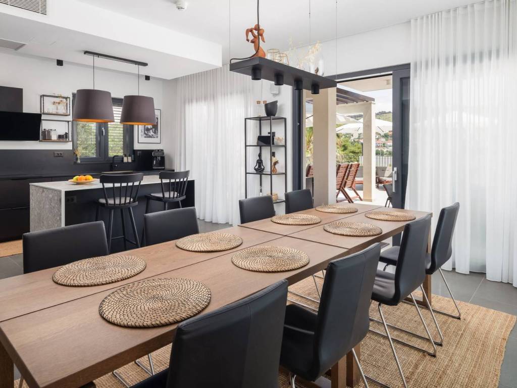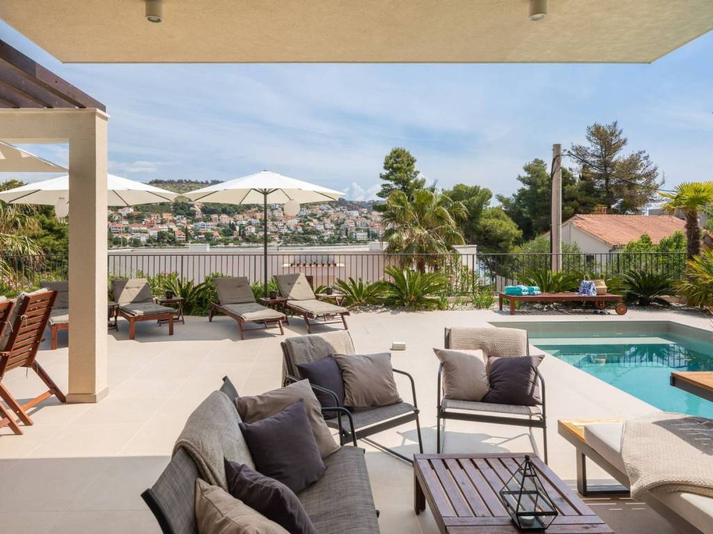 New modern villa with a pool in the second row to the sea in Čiovo. Villa with a landscaped garden of 500m2 located only 50m from the sea in a beautiful pebble bay. The villa has 280m2 equipped with high-quality equipment, installations and luxury furniture. On the ground floor: a bedroom with a bathroom and an entrance hall (small living room), a garage for two cars, and an engine room for the swimming pool. On the first floor: a large living room with a modern kitchen and a spacious dining room and an exit to a large terrace and a covered lounge area with a heated pool and sun deck. On the second floor: three bedrooms with built-in wardrobes and private bathrooms and a balcony with an open view of the sea. The villa is sold fully furnished. Equipped with alarm system and cameras, automatic garden irrigation system, fire alarm, wifi internet network, underfloor heating in all bathrooms, fully air-conditioned.