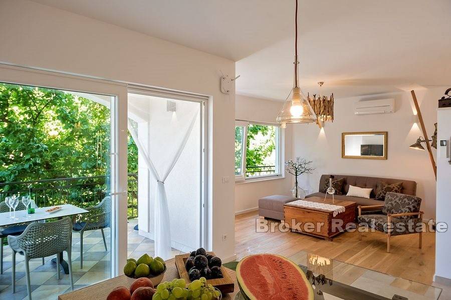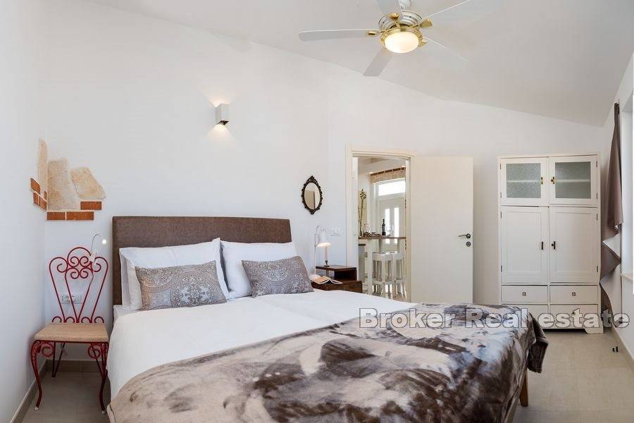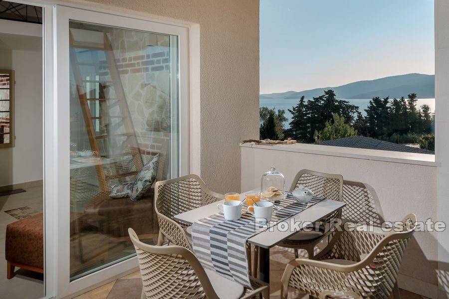 There are two apartments on the attic floor. Both apartments consist of two bedrooms, a bathroom, a kitchen and a living room, as well as access to a balcony with a view of the sea.