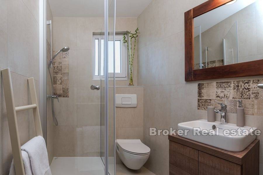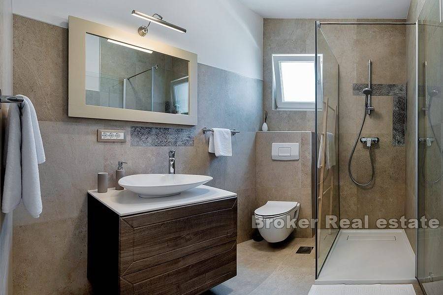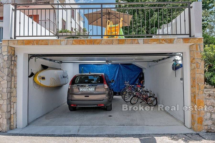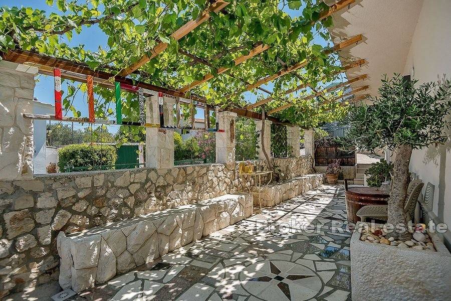 An interesting detached house with a total living area of 282 m2, built on a plot of land of 467 m2. Located in a small tourist town near Trogir. It consists of 3 floors.