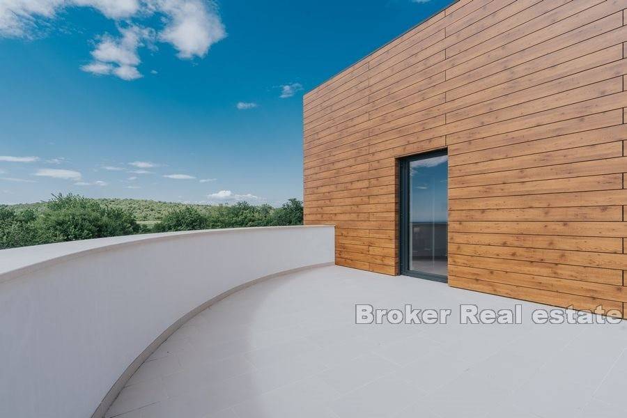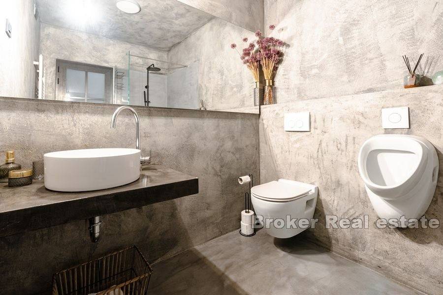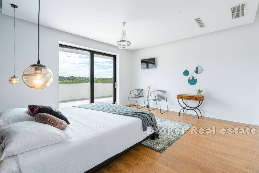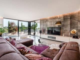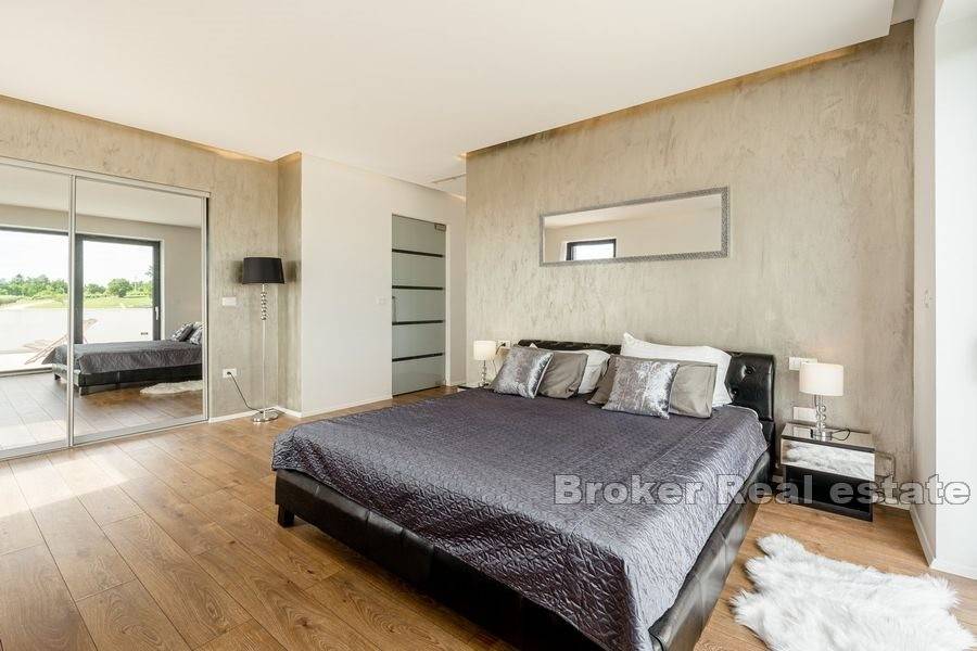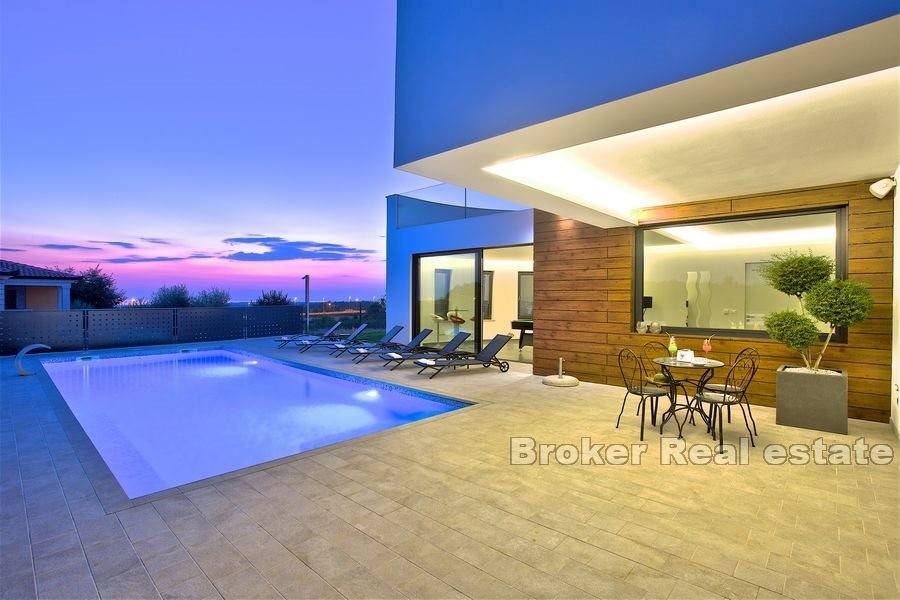 Modern villa with pool located in a quiet location in Poreč. The villa has a total living area of 270 m2 and is located on a plot of land of 627 m2. It covers the basement, ground floor and first floor. In the basement there is a boiler room, storage room, toilet and a tavern equipped with a kitchen and a pool table and a wine cellar.
