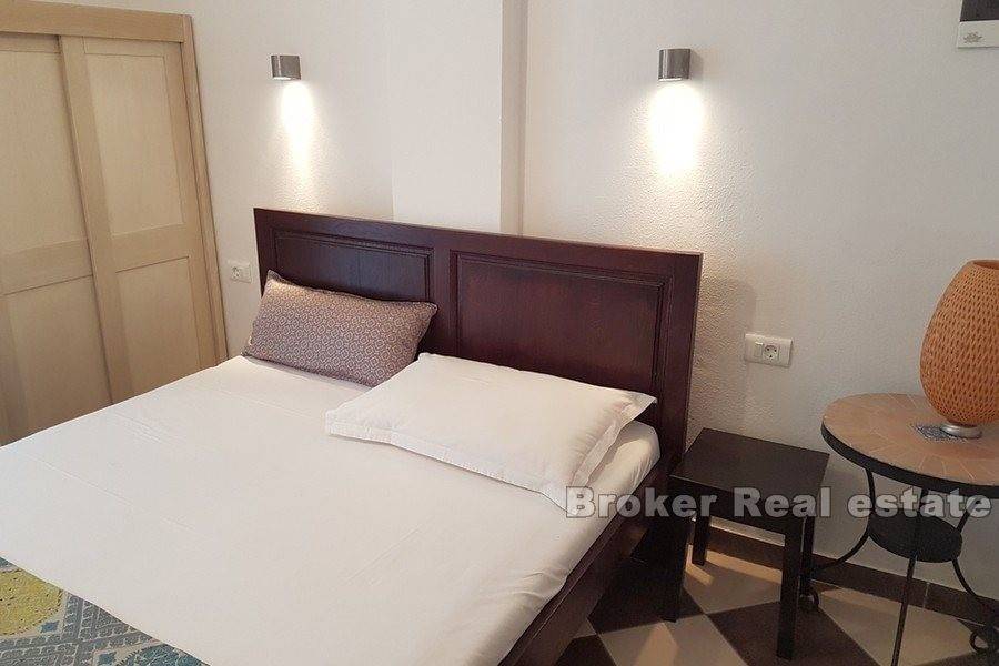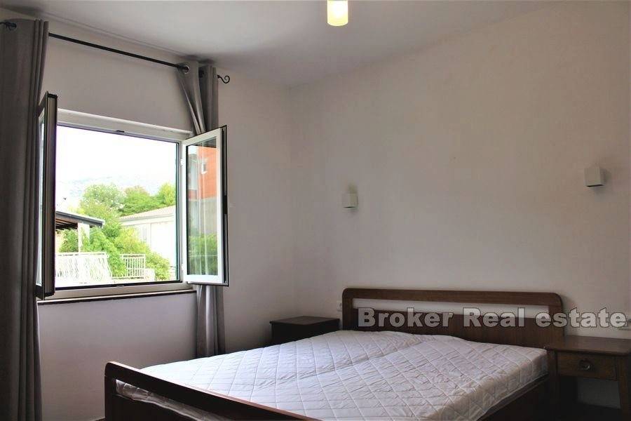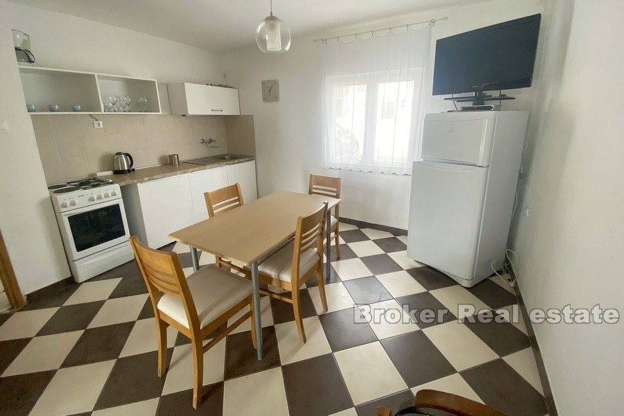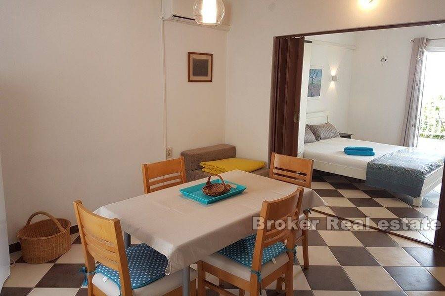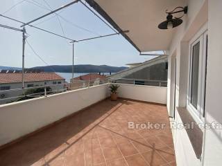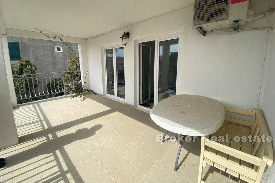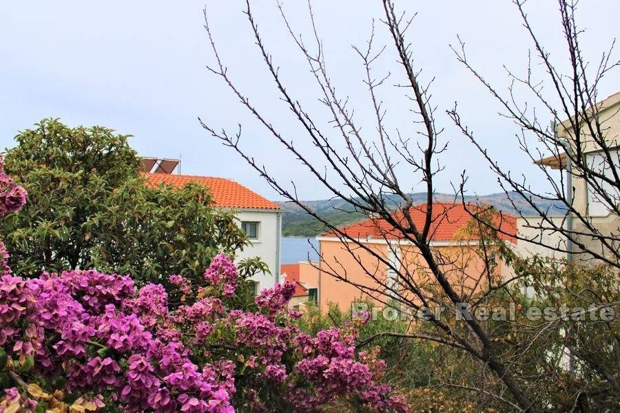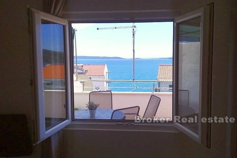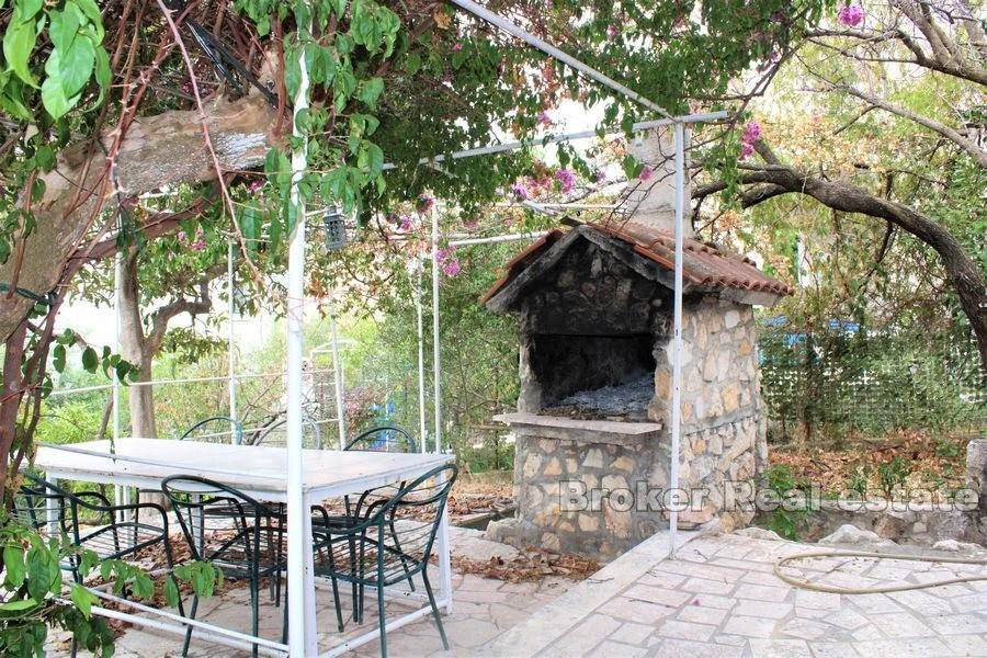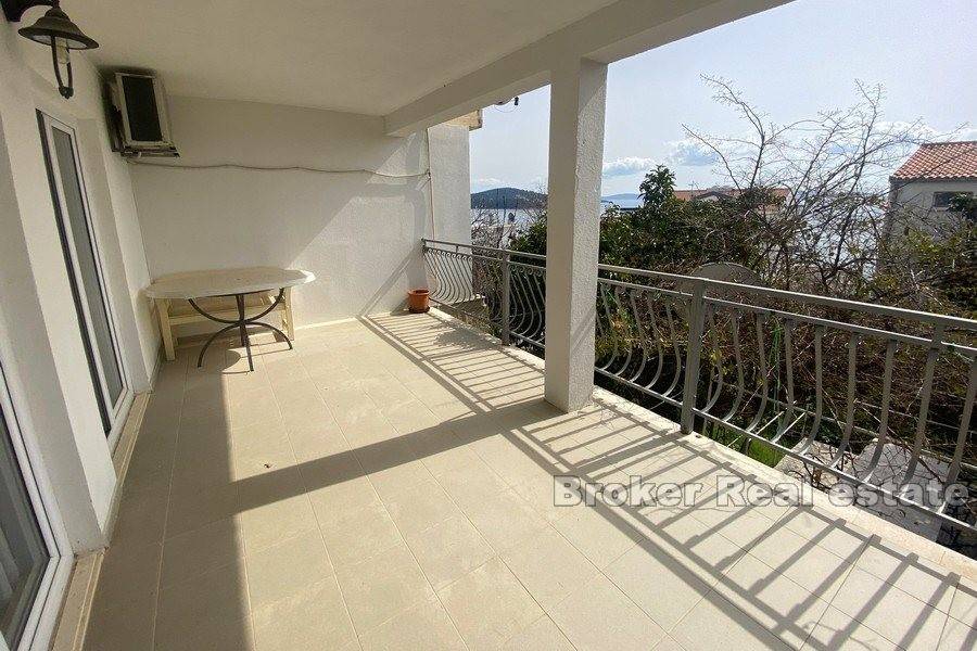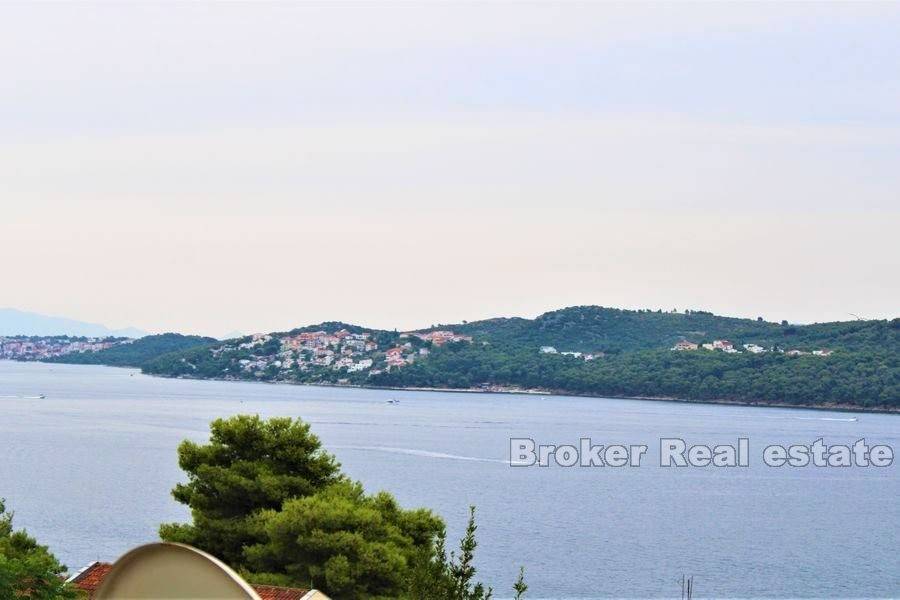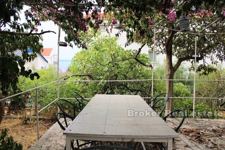 Beautiful house with open view of the sea and islands. The house is 120m from the sea. Located in a cul de sac of southern orientation near the town of Trogir. The building was built in 1989 on a plot of land with a total area of 306m2, with a garden of 215m2. The building consists of three floors (ground floor and two floors), and the total living area is 214m2. The ground floor has one bedroom, kitchen with dining room and bathroom. The apartment has access to a spacious garden with barbecue. In the garden there is a space that can be used to install a swimming pool. On the first floor there are two bedrooms, a kitchen with a dining room and a bathroom. The apartment has access to a balcony of 18m2 overlooking the sea and islands. On the second floor there is one bedroom, kitchen with dining room and bathroom. The apartment also has a balcony of 18m2 with a beautiful view of the sea and islands. The attic is currently in an unfinished condition, and upon completion of the works can be connected to the second floor and thus get a duplex apartment. In front of the house there are three parking spaces. It is located near the beach, shops, cafes and the airport. It is ideal for tourist rental but for personal use.
