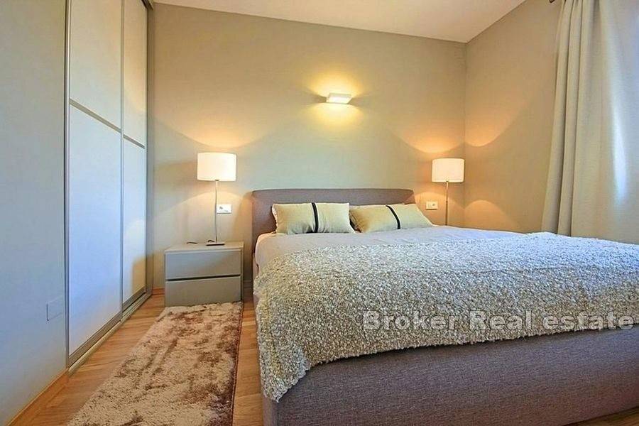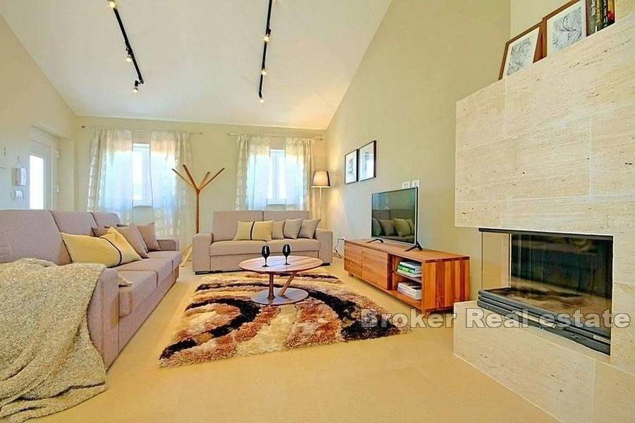From the living room, there is access to the terrace that leads to the landscaped garden with a swimming pool, sun deck and barbecue.