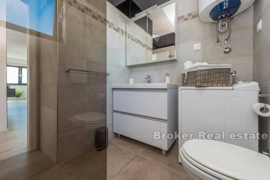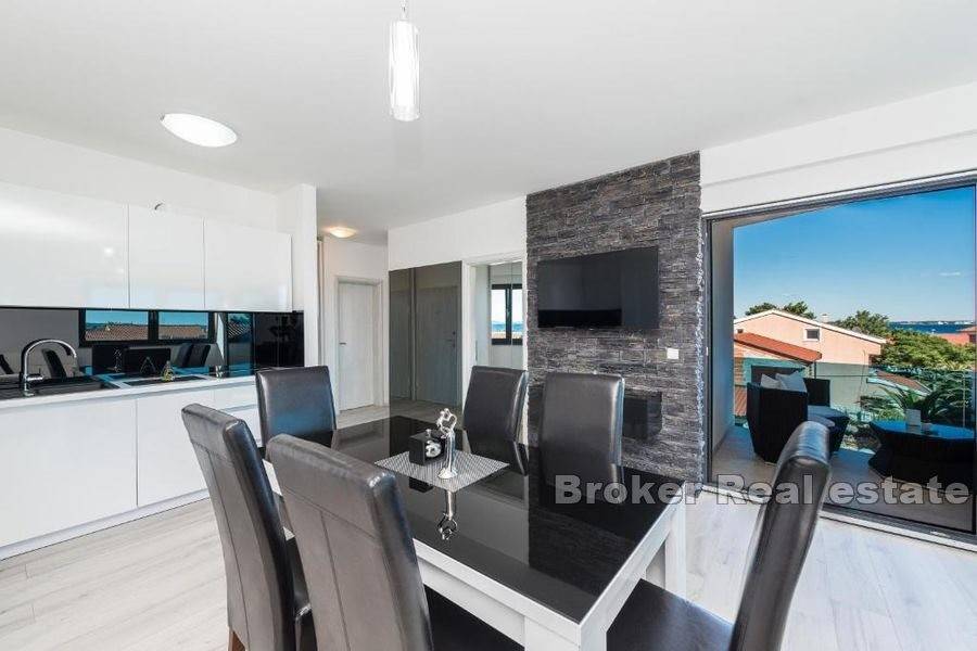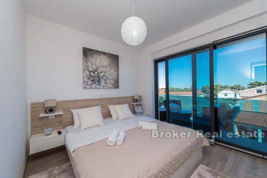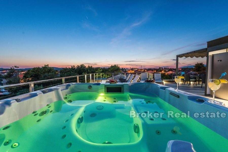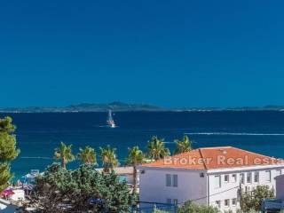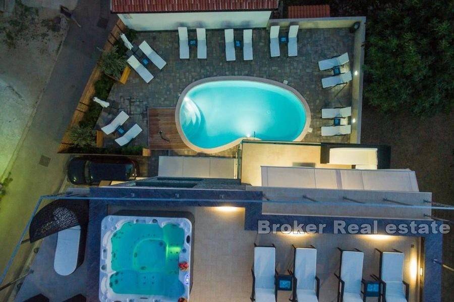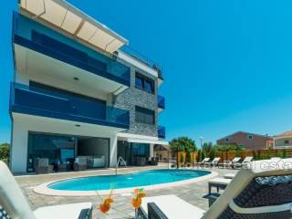 Luxury villa with pool and roof terrace located in an attractive location, 100 m from the beach and the center of the island of Vir. The property with a living area of 550 m2 consists of six luxuriously furnished apartments and is spread over three floors. There are two two-room apartments on each floor. The apartments are split-level and each has its own meter, and they consist of two bedrooms, one bathroom, kitchen with dining room, living room, terrace or balcony.