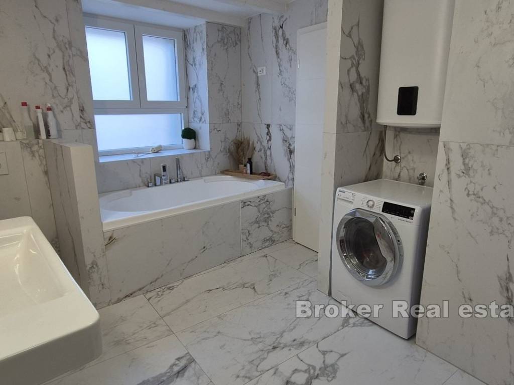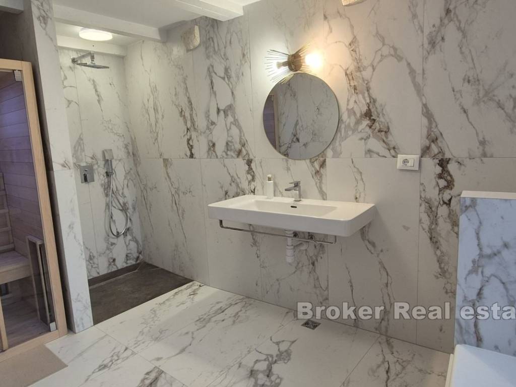 The house is spread across three floors: the ground floor features a luxurious bathroom equipped with a sauna and jacuzzi, ideal for relaxing after a day at the beach; the first floor includes a spacious living room and kitchen, thoughtfully designed for comfortable family gatherings; and a bedroom in the attic provides a peaceful, private retreat. Perfectly positioned close to the sea and various amenities, this property represents an excellent investment opportunity in Kaštelas tourism market.