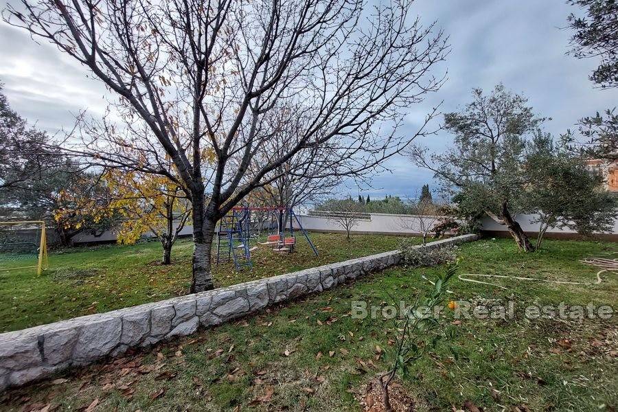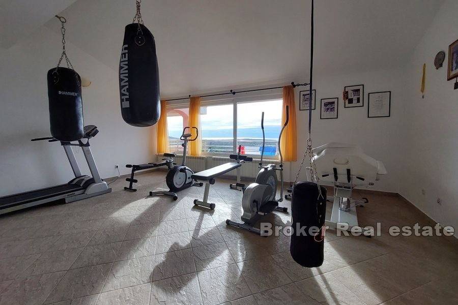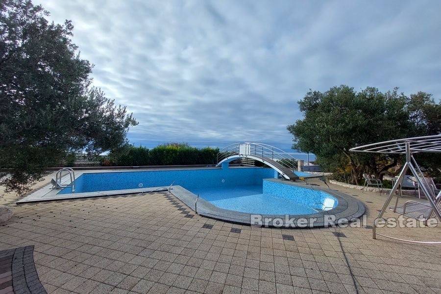 On the first floor and the attic there are two two-room apartments with balconies offering a view of the sea. There is also a fully equipped gym on the first floor. The entire house has solar and oil-fired central heating. In the yard there is a swimming pool of 125 m2, two toilets and a shower. Next to the pool there is a closed tavern, bar and grill. Behind the house there is a room for solar heating and a laundry room. It has six covered parking spaces. At a distance of 1500m from the sea and the center of the town, the nearest shop is at a distance of 400m.