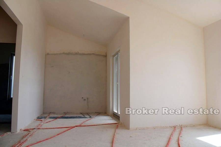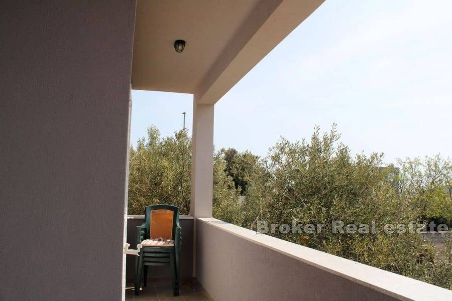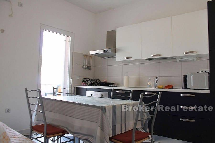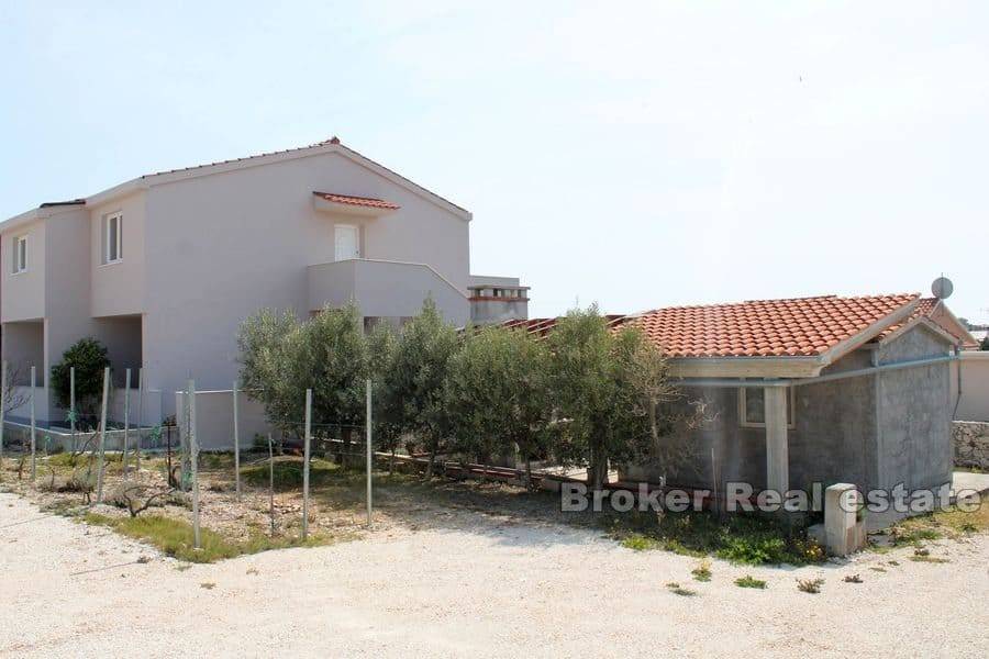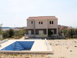 The house consists of 2 floors with a living area of 235 m2 and 1,430 m2 of land. On the first floor there are 2 apartments, each of which consists of 1 bedroom, bathroom, kitchen, balcony, living room and dining room. The 2nd floor is unfinished and consists of two bedrooms, two bathrooms, a balcony, two terraces, and a spacious living room with kitchen and dining area. The terrace offers a beautiful sea view. The property is equipped with a swimming pool, garage, and air conditioning. The house is located near all necessary facilities such as restaurants, cafe bars, grocery stores, beaches.