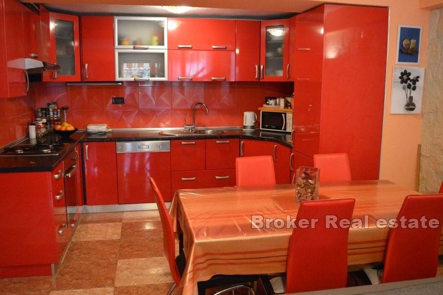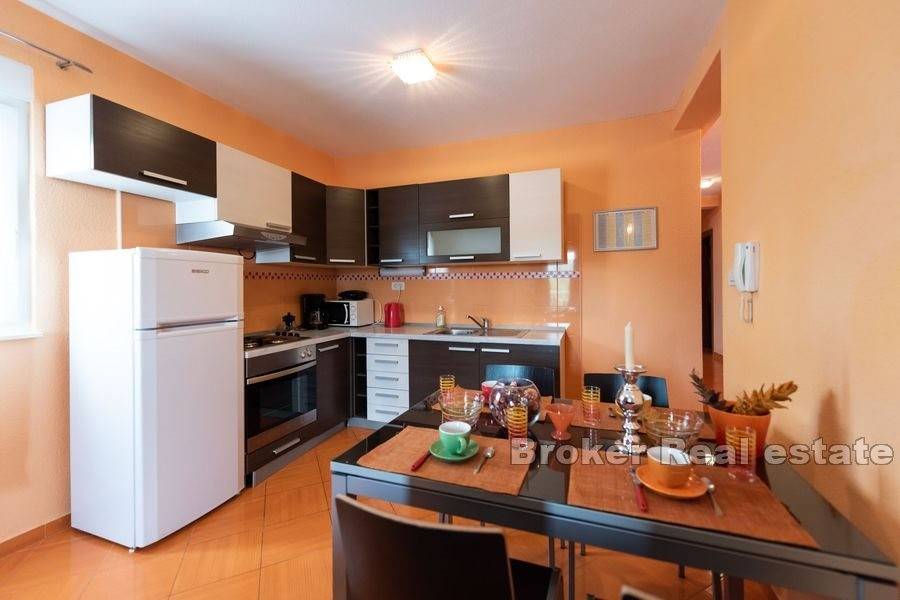 This idyllic apartment house with pool is located in a small village only 20 kilometers west of Trogir. The property consists of 6 modern apartments on 3 floors with a total living area of 549 m2 and a swimming pool on a plot of 1584 m2 The apartments are divided into 2 one-bedroom apartments and 2 two-bedroom apartments with balconies and two three-bedroom apartments equipped with a spacious terrace and balcony. All apartments have air conditioning, a living room, a fully equipped modern kitchen and a private bathroom. The beautifully landscaped garden includes an attractive heated pool, barbecue, outdoor storage and parking for 20 vehicles. Located in a quiet neighborhood that provides peace and privacy with excellent road connections with surrounding places such as Trogir, Marina and the city of Split. The first beaches are a few minutes walk from the house while the relaxing spa and wellness center is located 15 km from the property. Positioned in a quiet Dalmatian town, this beautiful house is offered as an excellent option for seasonal rentals or everyday life.