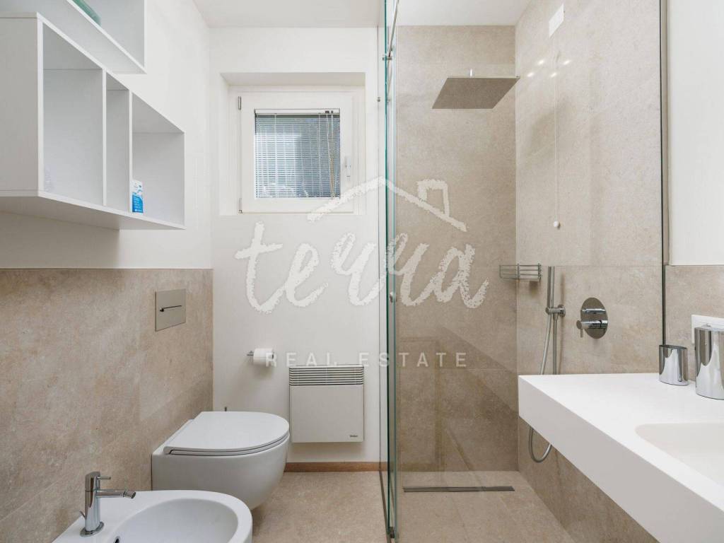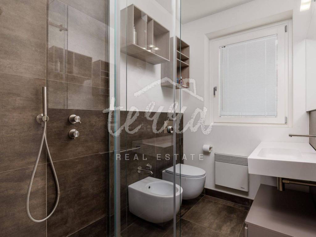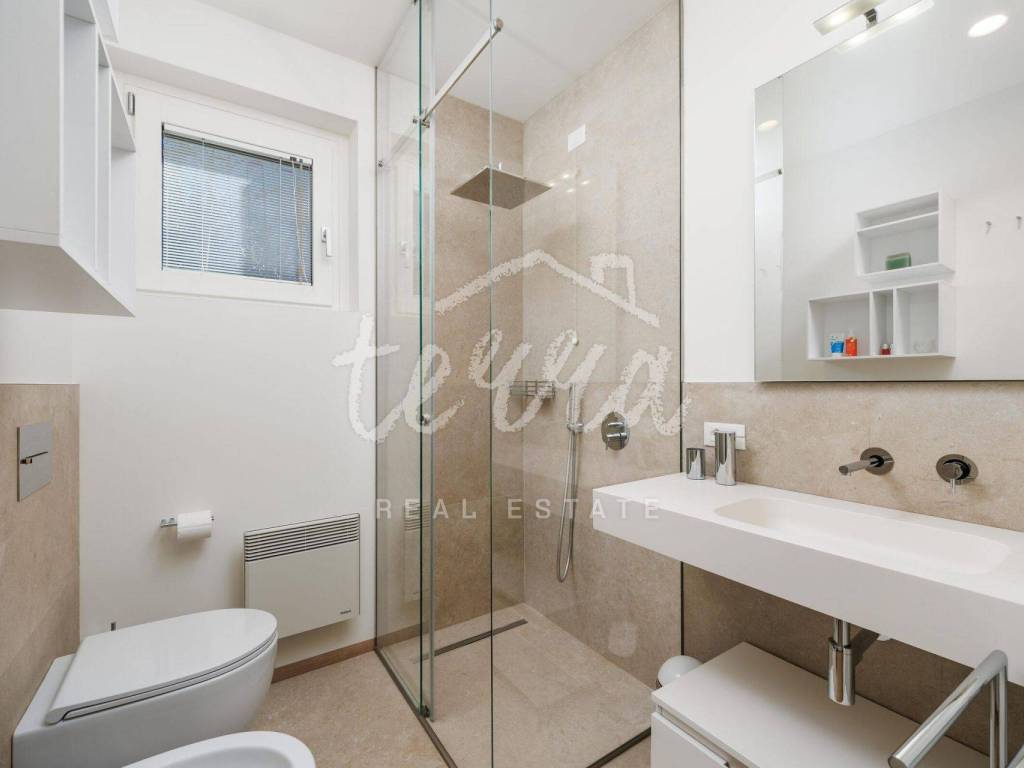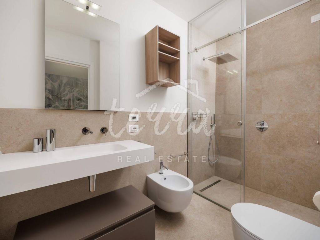 Modern bathrooms with tinted glass (visible from the inside to the outside and complete privacy from the outside) equipped with Radamonti sanitary systems.