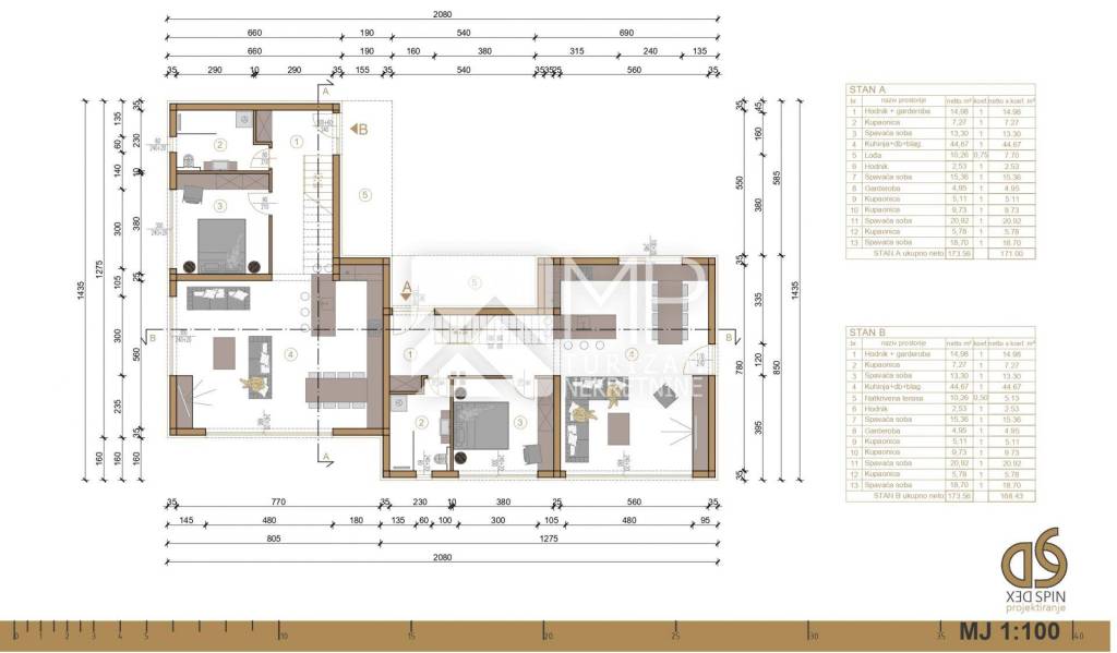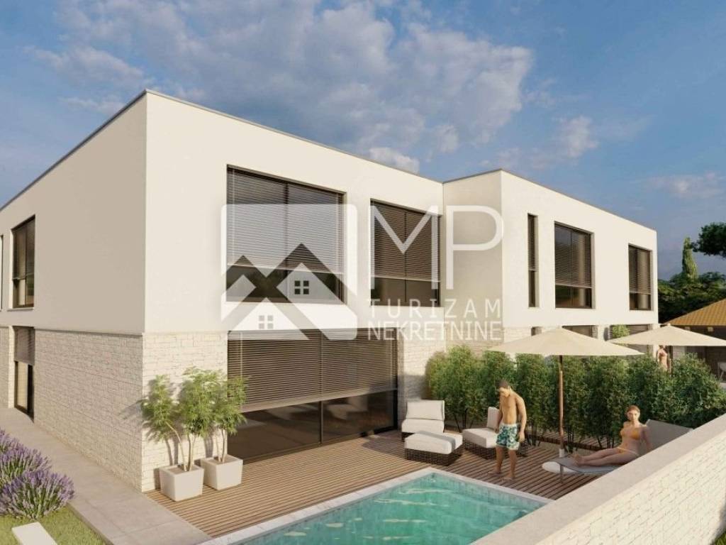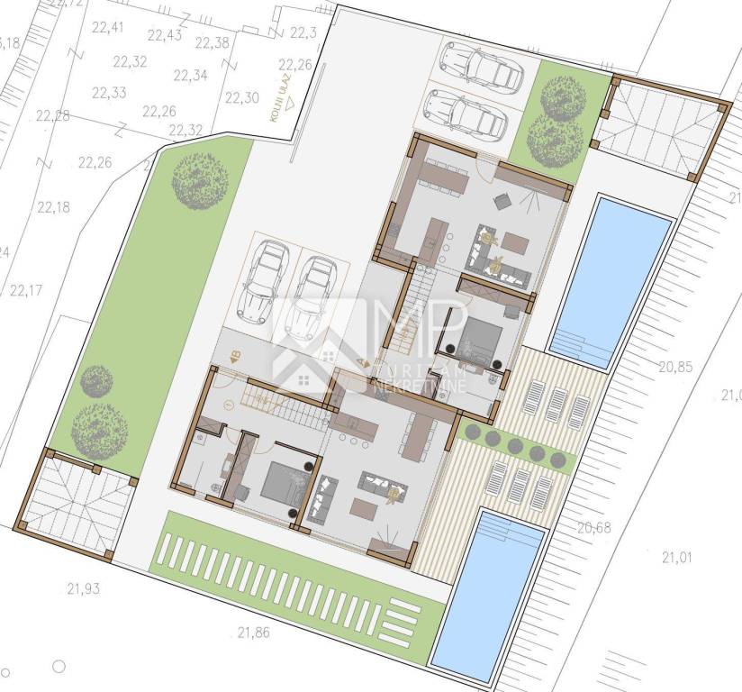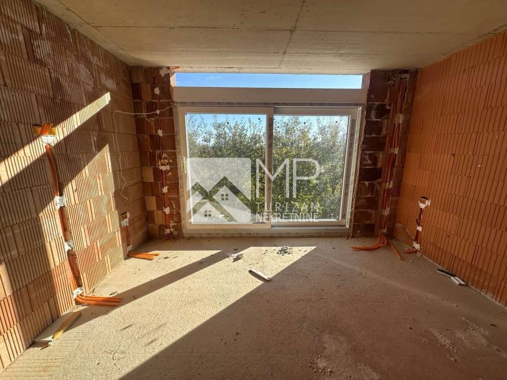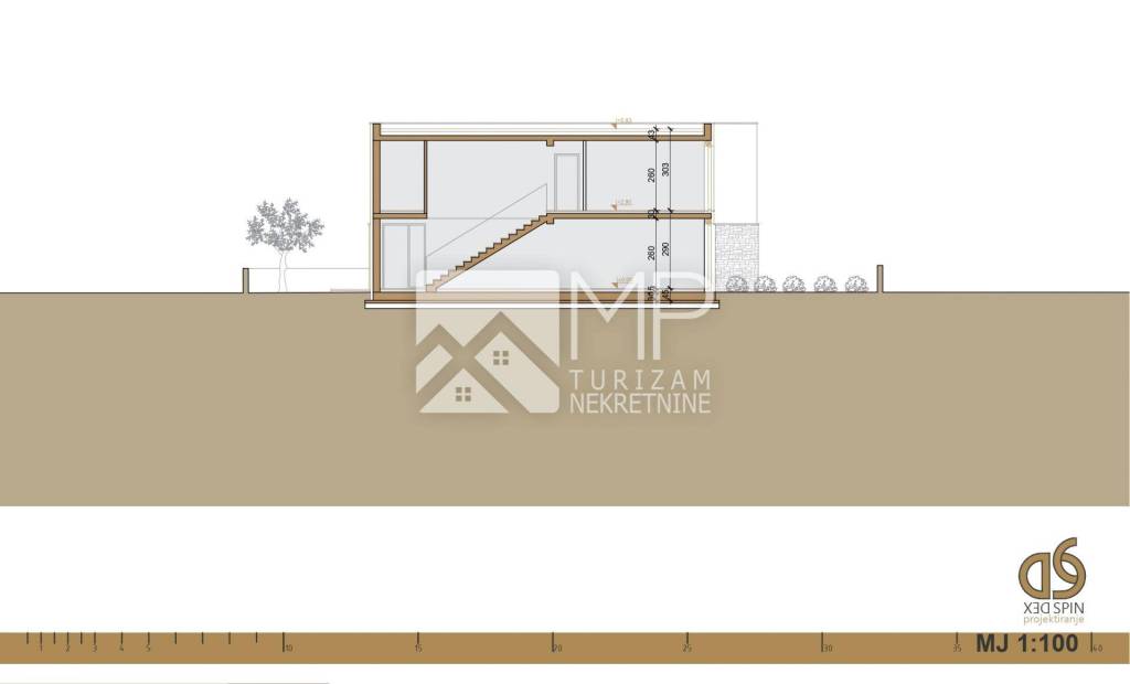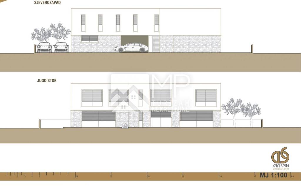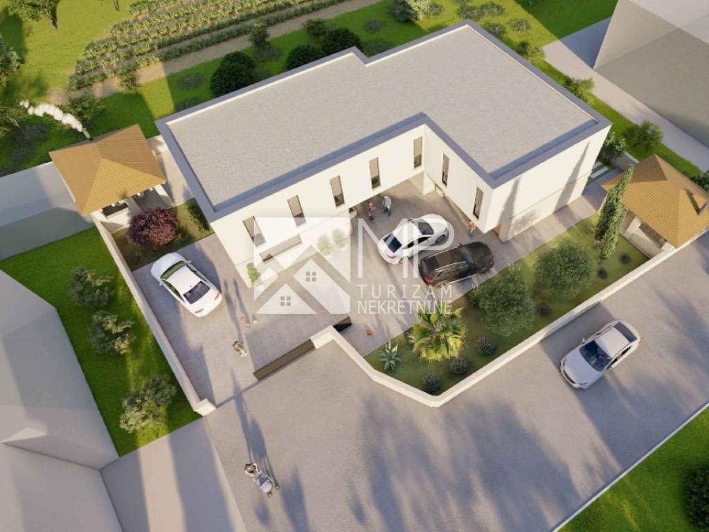 A modern semi-detached villa for sale in Ližnjan, located just 1 km from beautiful beaches, in a peaceful and attractive environment. The villa has a ground floor and an upper floor, connected by internal stairs, with a total net area of ​​173.56 m².