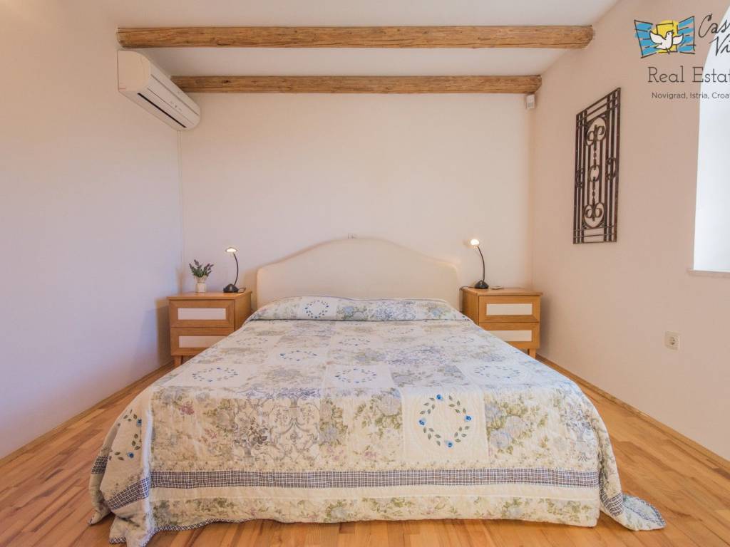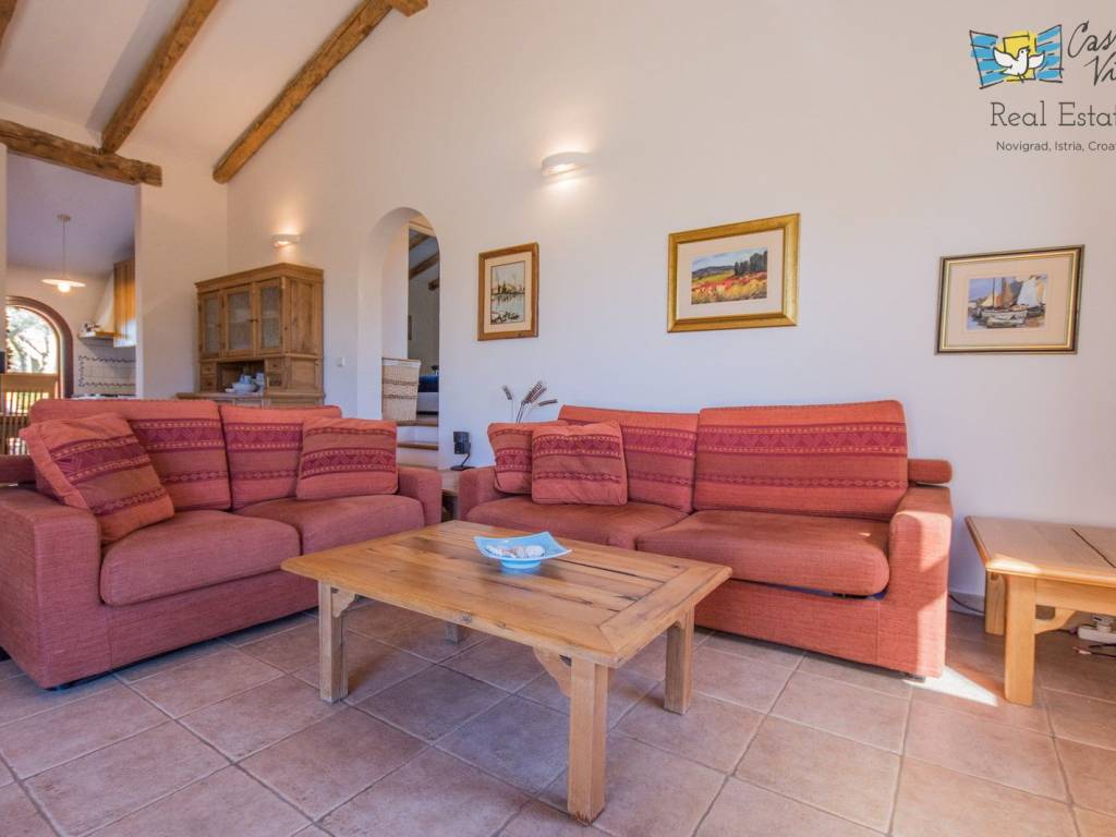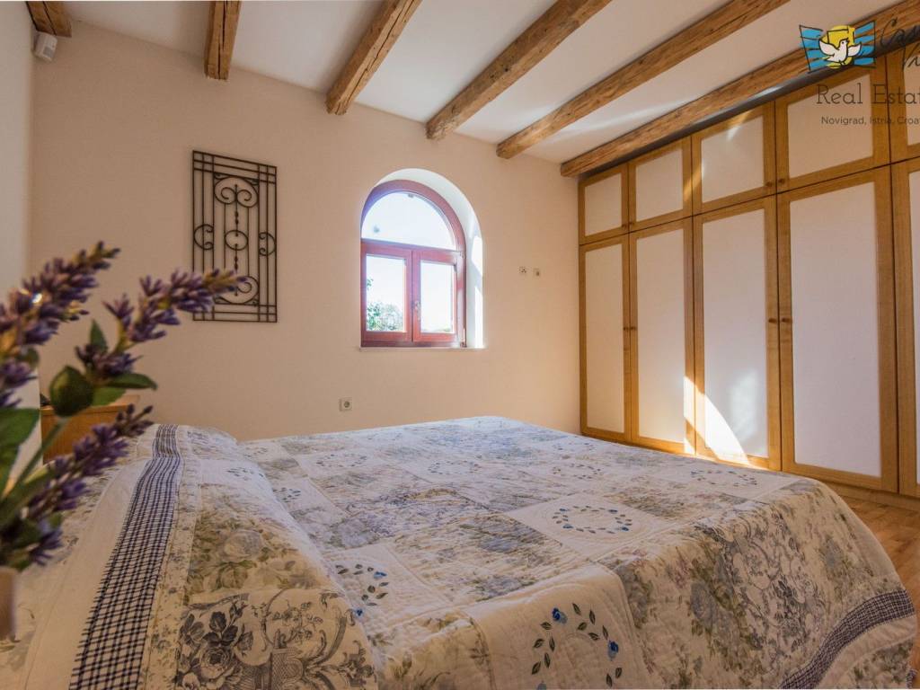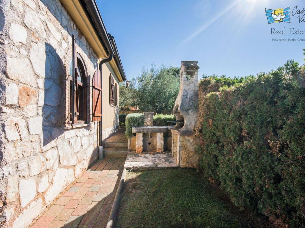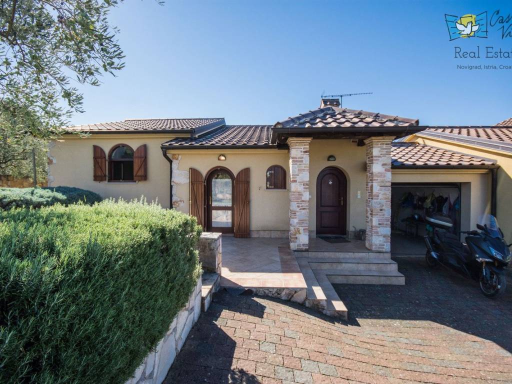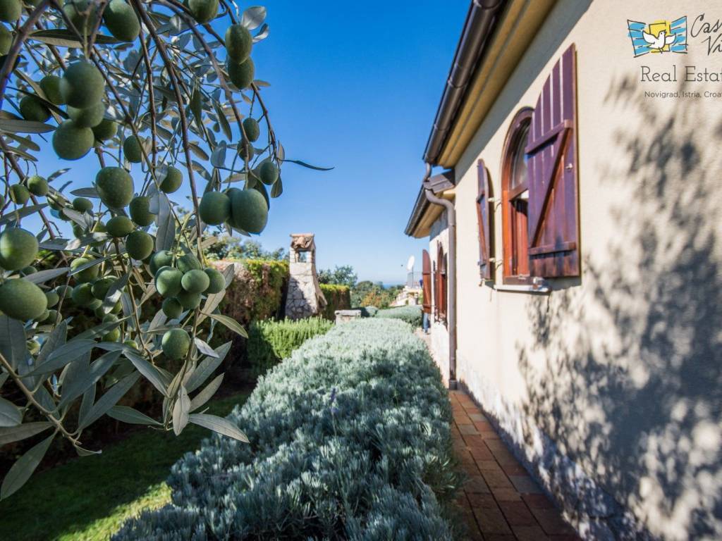 A beautiful and charming small single-story house of 100 m2 is for sale, located on a hill in a small Istrian town not far from Poreč. It was built in 2007, on a plot of 400 m2. The house is semi-detached but has a completely independent access and entrance to the yard compared to the other house. It is oriented southwest. It consists of an entrance hallway, guest WC, a large living area (kitchen, dining room, and living room) from which you exit to the terrace and barbecue area, offering an unobstructed panoramic sea view. The rest of the house leads to two bedrooms and a bathroom with a shower cabin. The hallway and yard provide access to the garage, where a newly purchased Finnish sauna is installed. Heating/cooling is regulated via air conditioning, and there is also a fireplace in the living room. The joinery is wooden. The garden is partly landscaped with Mediterranean plants and lawn, and a paved area intended for parking spaces. The house represents an opportunity for everyday living or for tourist rental, as there is the possibility to build a small pool.
