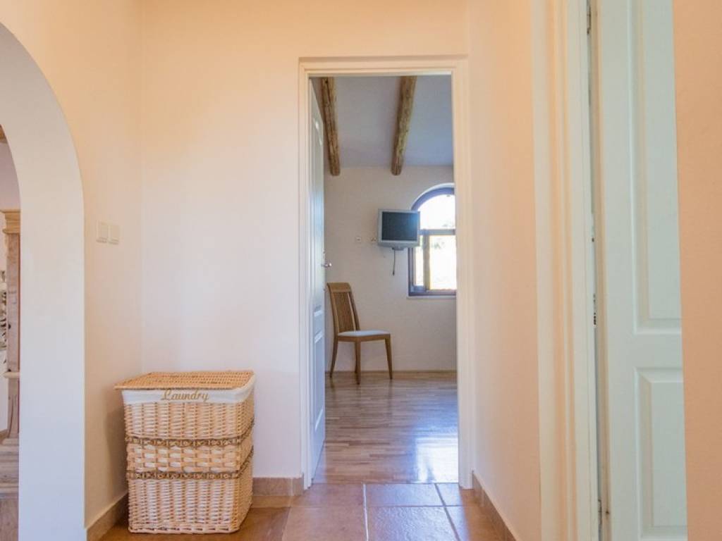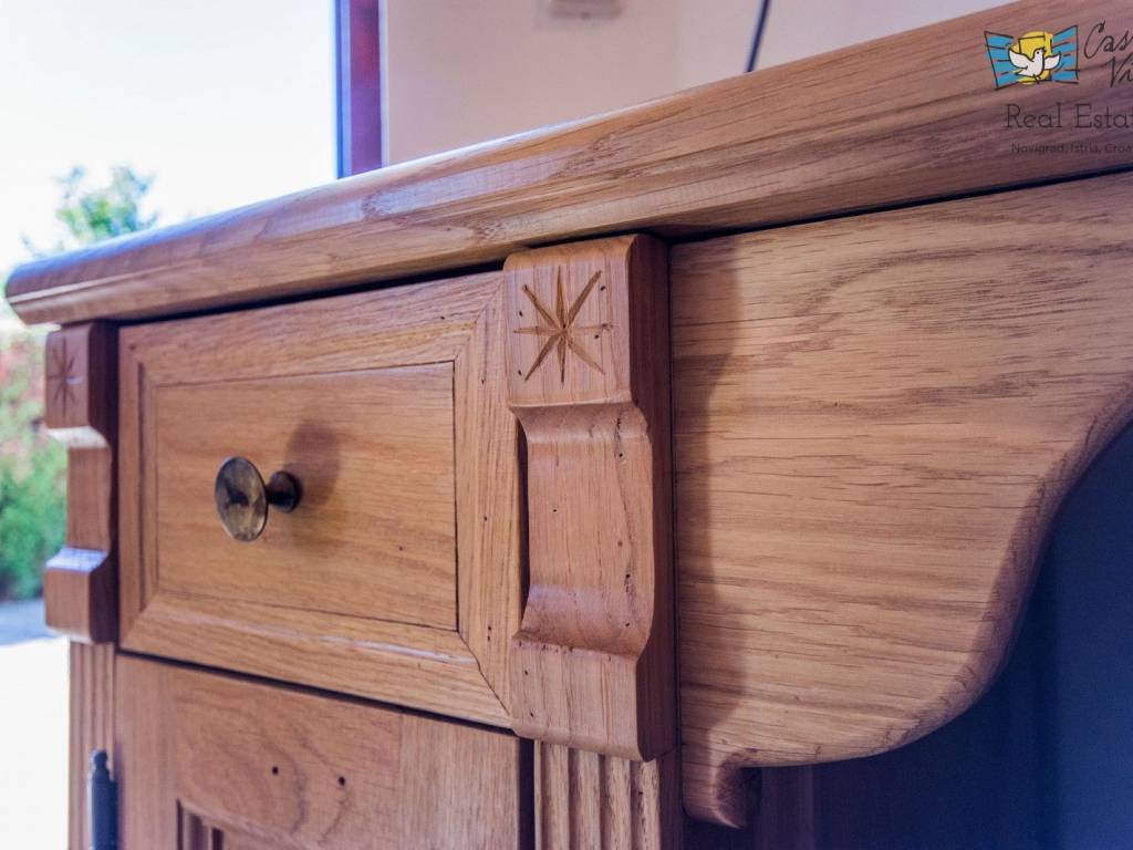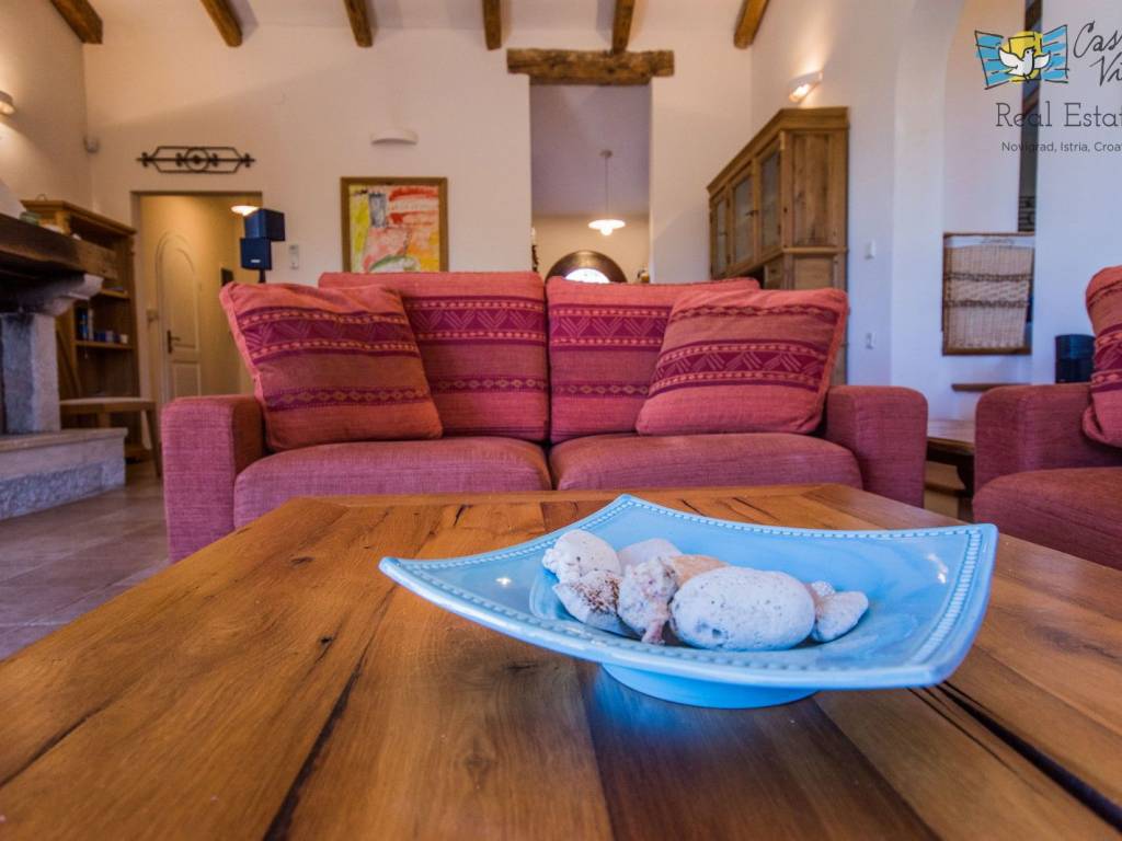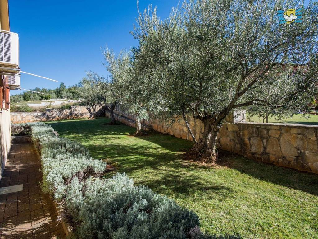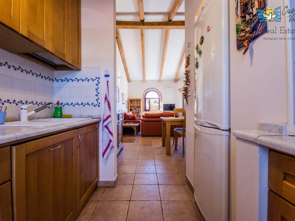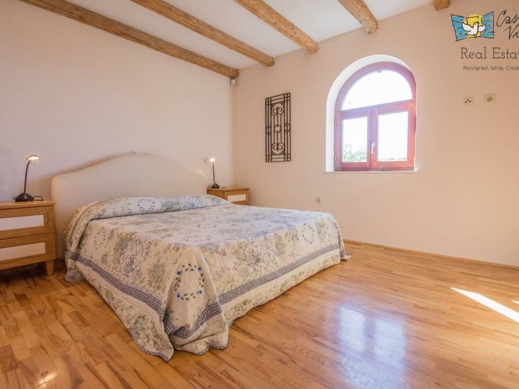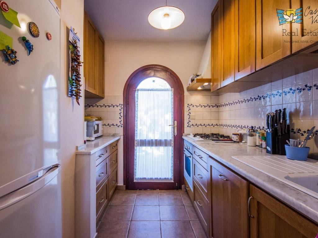 A beautiful and charming small single-story house of 100 m2 is for sale, located on a hill in a small Istrian town not far from Poreč. It was built in 2007, on a plot of 400 m2. The house is semi-detached but has a completely independent access and entrance to the yard compared to the other house. It is oriented southwest. It consists of an entrance hallway, guest WC, a large living area (kitchen, dining room, and living room) from which you exit to the terrace and barbecue area, offering an unobstructed panoramic sea view. The rest of the house leads to two bedrooms and a bathroom with a shower cabin. The hallway and yard provide access to the garage, where a newly purchased Finnish sauna is installed. Heating/cooling is regulated via air conditioning, and there is also a fireplace in the living room. The joinery is wooden. The garden is partly landscaped with Mediterranean plants and lawn, and a paved area intended for parking spaces. The house represents an opportunity for everyday living or for tourist rental, as there is the possibility to build a small pool.