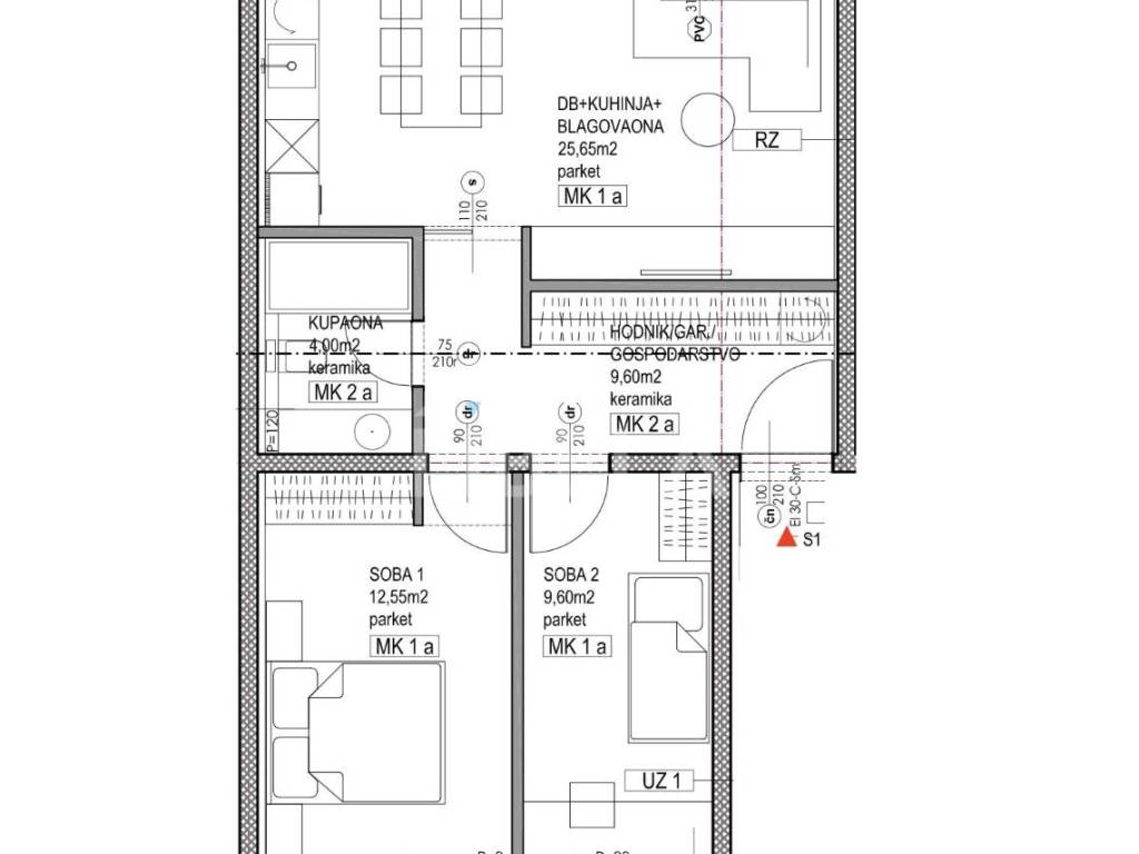 Prodaje se trosobni stan neto obračunske površine 89.77 m2 na 1. katu novogradnje bez lifta.