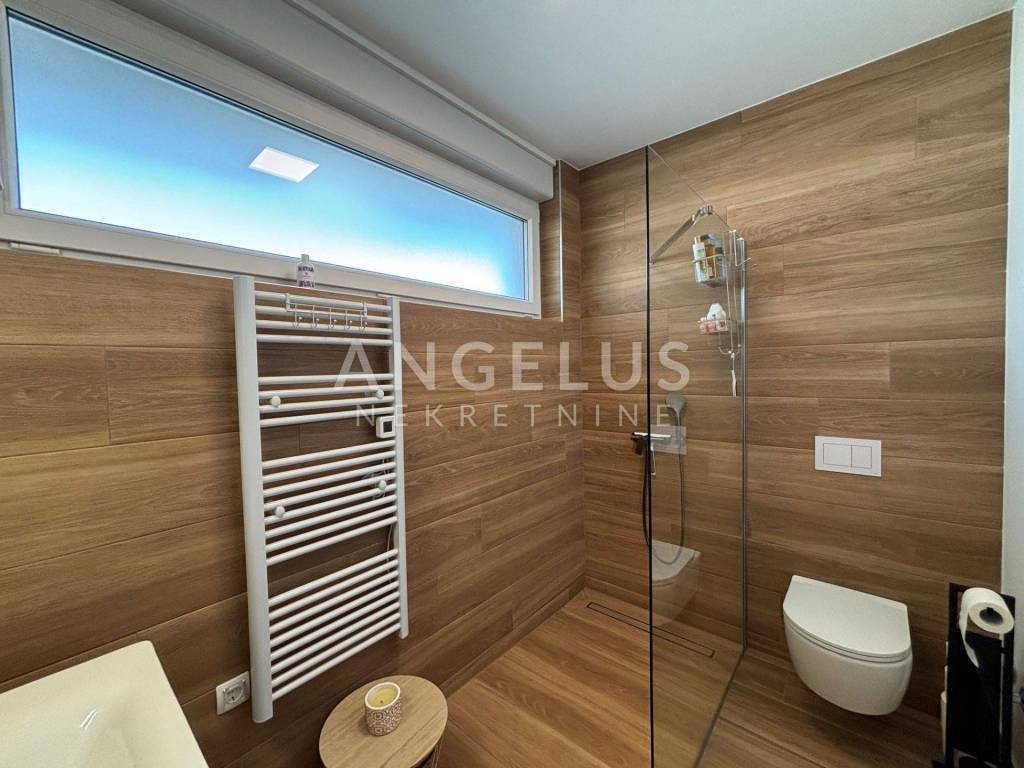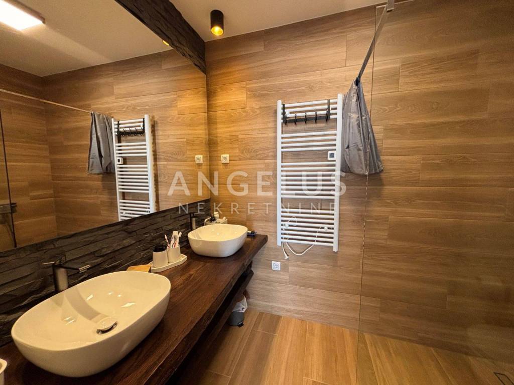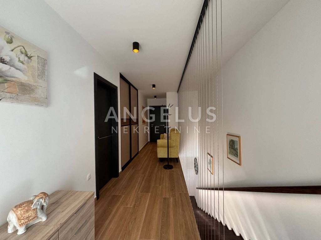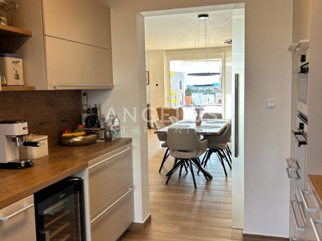 The ground floor is designed as an impressive open-space concept consisting of a spacious living room filled with natural light, an exclusive and modernly designed kitchen with top-quality equipment and an elegant bathroom with a refined design. The living room has direct access to a private oasis with a swimming pool. The living room and bathroom have underfloor heating, which ensures comfort throughout the year. Another special feature of this house is the spacious terrace, which can be accessed directly from the kitchen. During hot summer days, it becomes a favorite place to stay, as it provides pleasant shade and freshness. On the first floor there is an intimate privacy zone with two luxurious bedroom suites. Each room has its own bathroom with underfloor heating, as well as private terraces, each with an open view. On the upper floor there are also three built-in wardrobes and a laundry room. The floors are interconnected by internal wooden stairs, of perfect design and elegance. This villa was decorated with great care and love. With its irresistible architecture and beautiful exterior with a swimming pool and a surrounded landscaped terrace, it fully satisfies the imperative of complete pleasure and relaxation. Additional value to this beautiful property is given by the spacious garage, as well as the possibility of parking two cars in front of its own garage. At the top of the house there is a walk-through terrace where all solar installations are brought, and in the storage room next to the garage, all the necessary installations for the heat pump are brought.