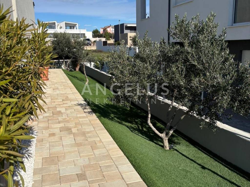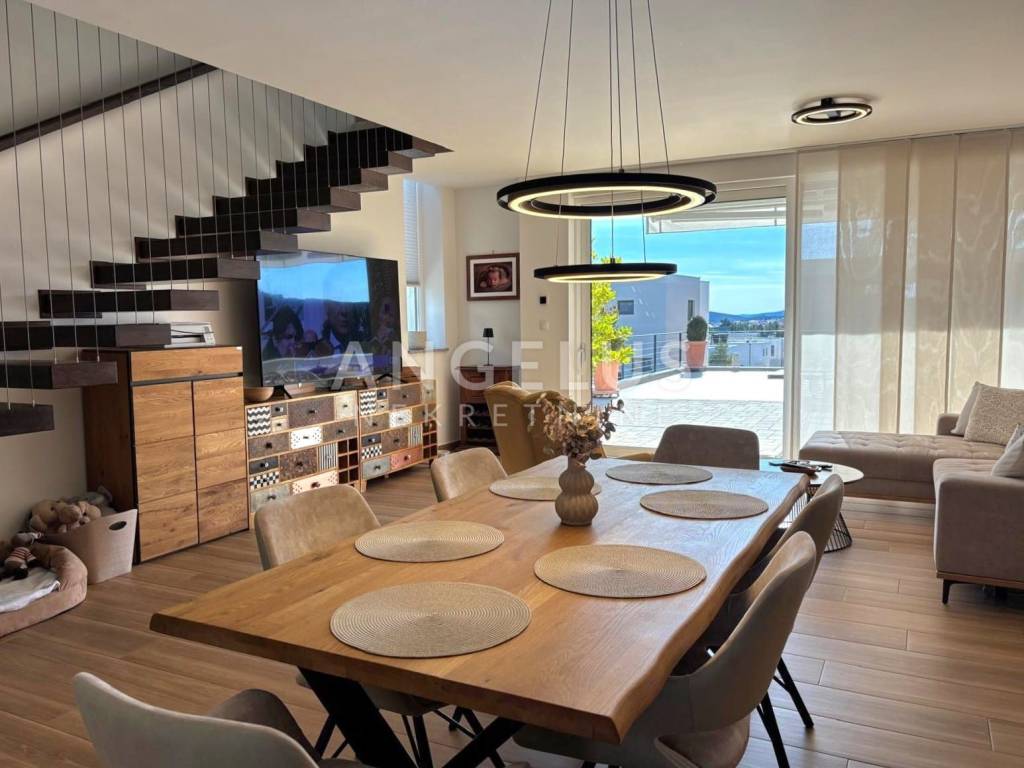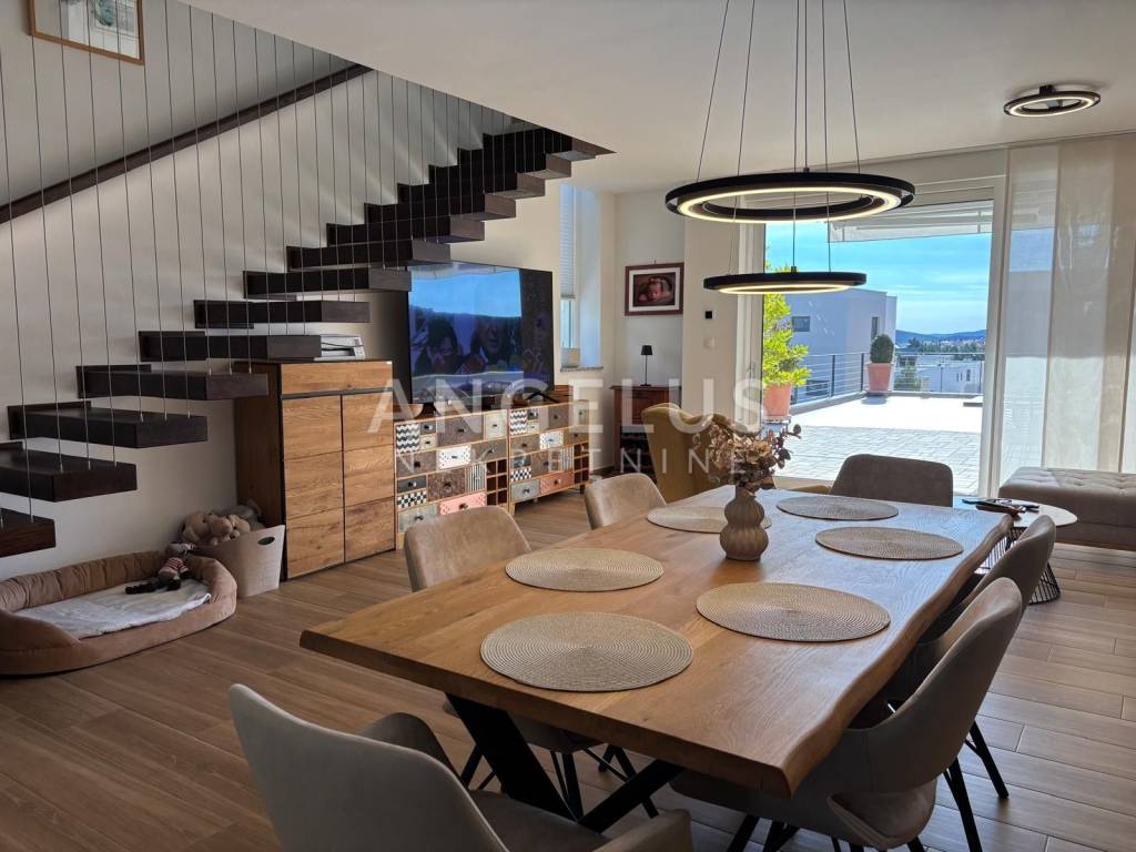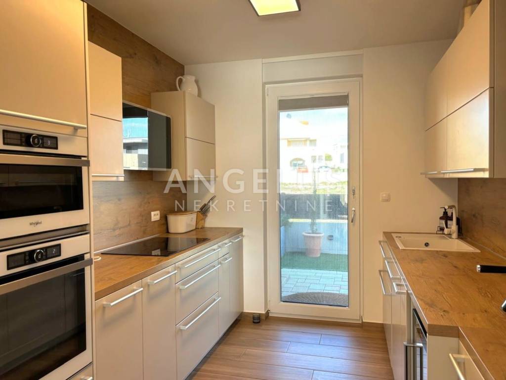 The ground floor is designed as an impressive open-space concept consisting of a spacious living room filled with natural light, an exclusive and modernly designed kitchen with top-quality equipment and an elegant bathroom with a refined design. The living room has direct access to a private oasis with a swimming pool. The living room and bathroom have underfloor heating, which ensures comfort throughout the year. Another special feature of this house is the spacious terrace, which can be accessed directly from the kitchen. During hot summer days, it becomes a favorite place to stay, as it provides pleasant shade and freshness. On the first floor there is an intimate privacy zone with two luxurious bedroom suites. Each room has its own bathroom with underfloor heating, as well as private terraces, each with an open view. On the upper floor there are also three built-in wardrobes and a laundry room. The floors are interconnected by internal wooden stairs, of perfect design and elegance. This villa was decorated with great care and love. With its irresistible architecture and beautiful exterior with a swimming pool and a surrounded landscaped terrace, it fully satisfies the imperative of complete pleasure and relaxation. Additional value to this beautiful property is given by the spacious garage, as well as the possibility of parking two cars in front of its own garage. At the top of the house there is a walk-through terrace where all solar installations are brought, and in the storage room next to the garage, all the necessary installations for the heat pump are brought.