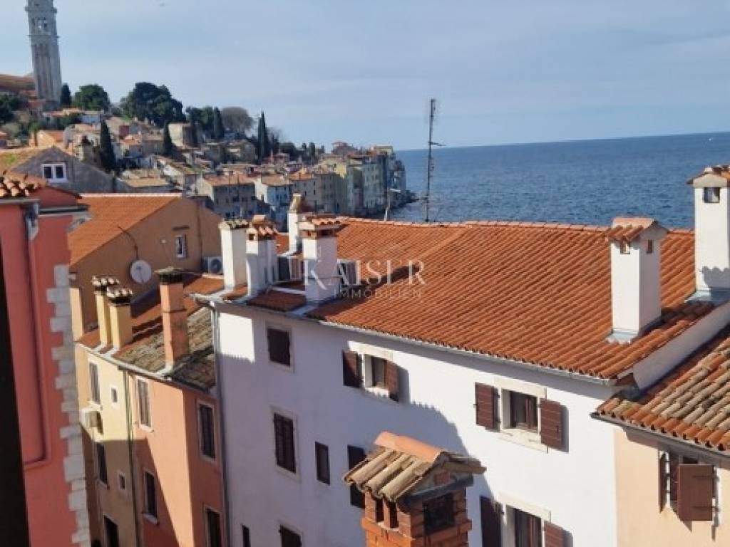 In the very heart of Rovinj, in the romantic pedestrian zone of the old town core, is located this beautiful, charming apartment with a captivating sea view. From the first step, you can feel the special atmosphere of Mediterranean life, where the smell of salt and the sound of waves merge with the warmth of the stone streets under the window.