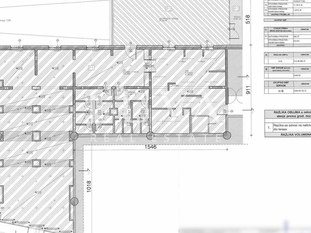 Unutarnja površina prostora iznosi 283m2, a vanjska iznosi 67m2(natkrivena i nenatkrivena terasa), te prostoru također pripada i spremište veličine cca 20m2.