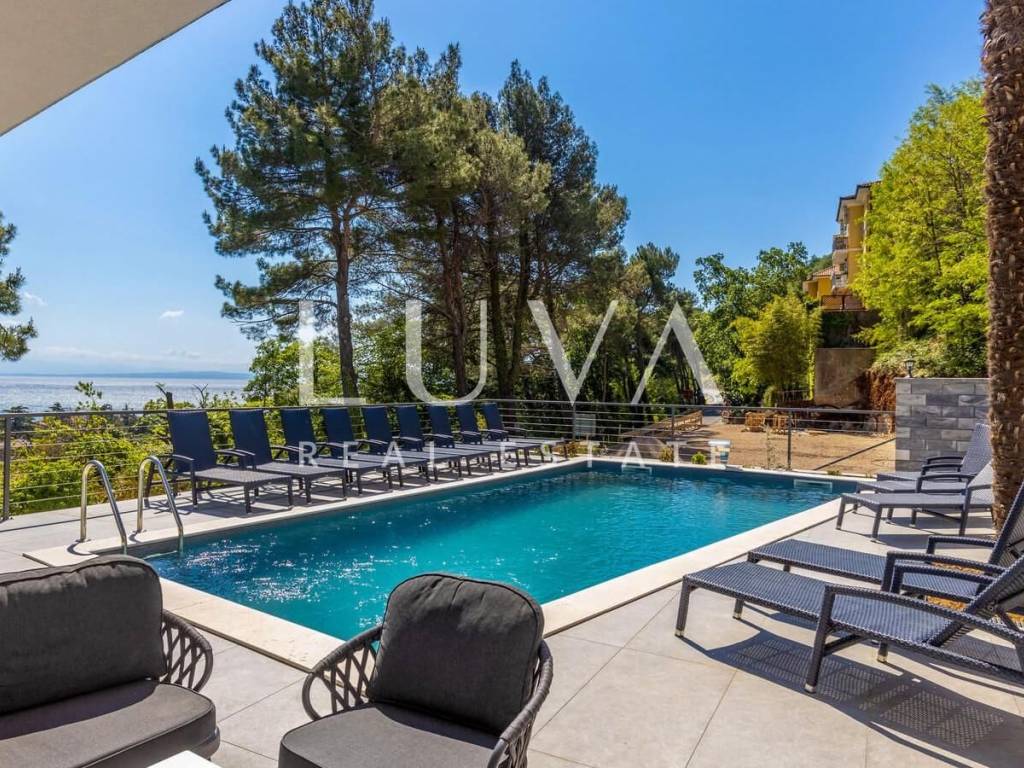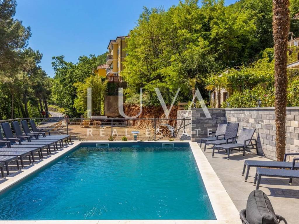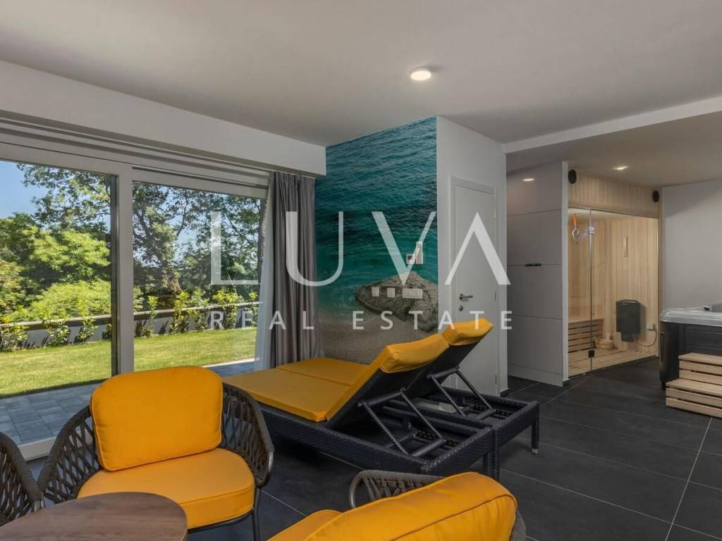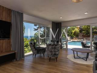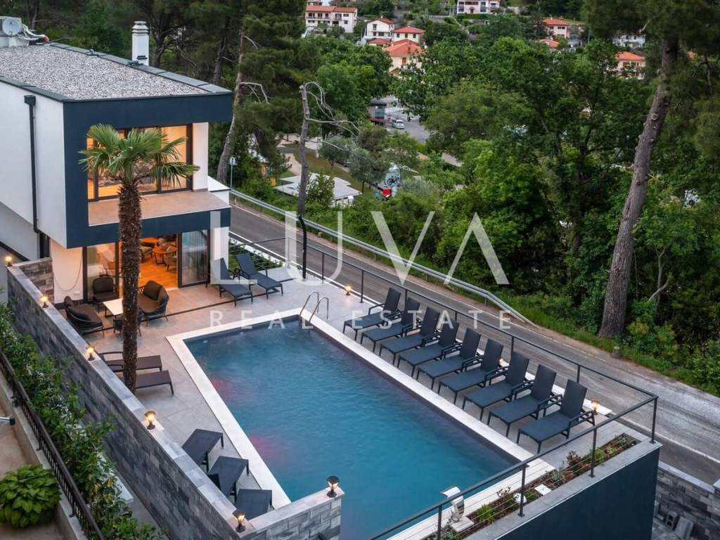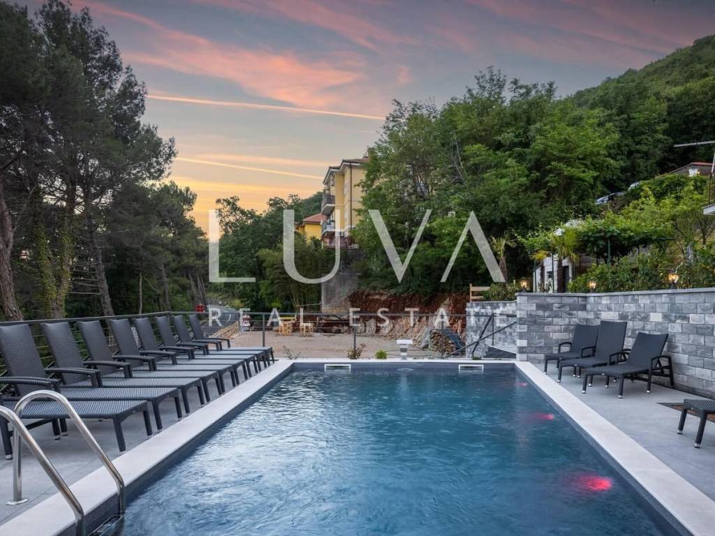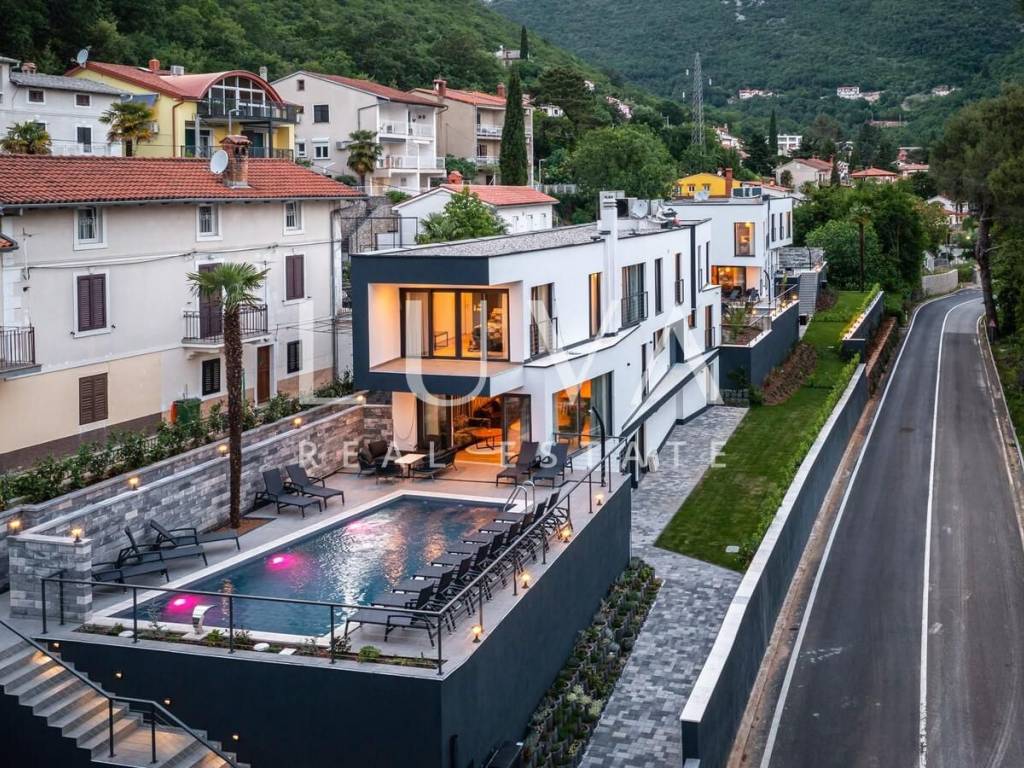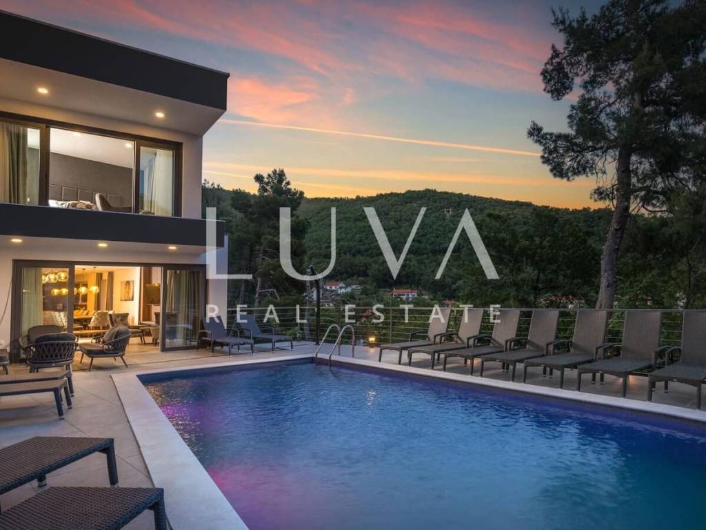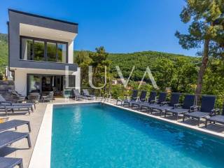 A luxury villa with a pool for sale in Mošćenička Draga, near Opatija. This modern luxury villa was built in 2022 and is located very close to the sea. It has 400 m² spread over 3 floors. The villa features a spacious living room, a fully equipped kitchen, 6 bedrooms, 8 bathrooms, and a wellness room with a sauna and Jacuzzi. The entire property is fully fenced and includes parking for 6 cars.