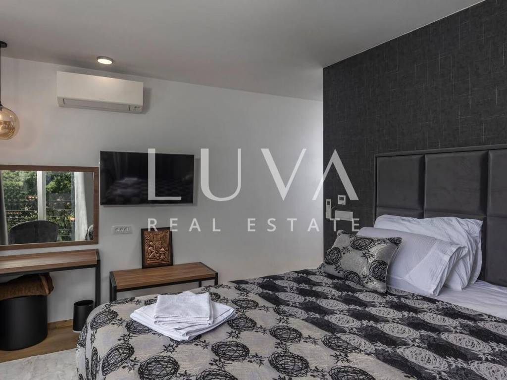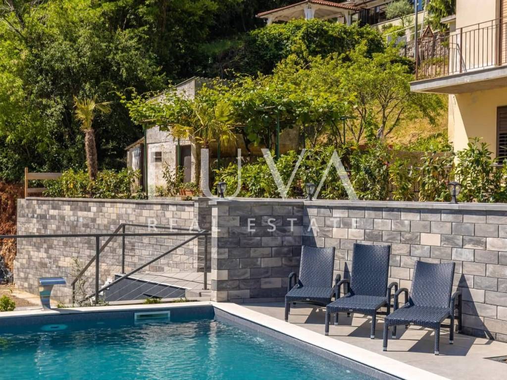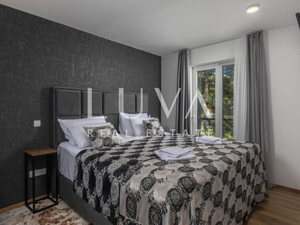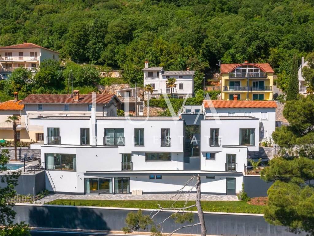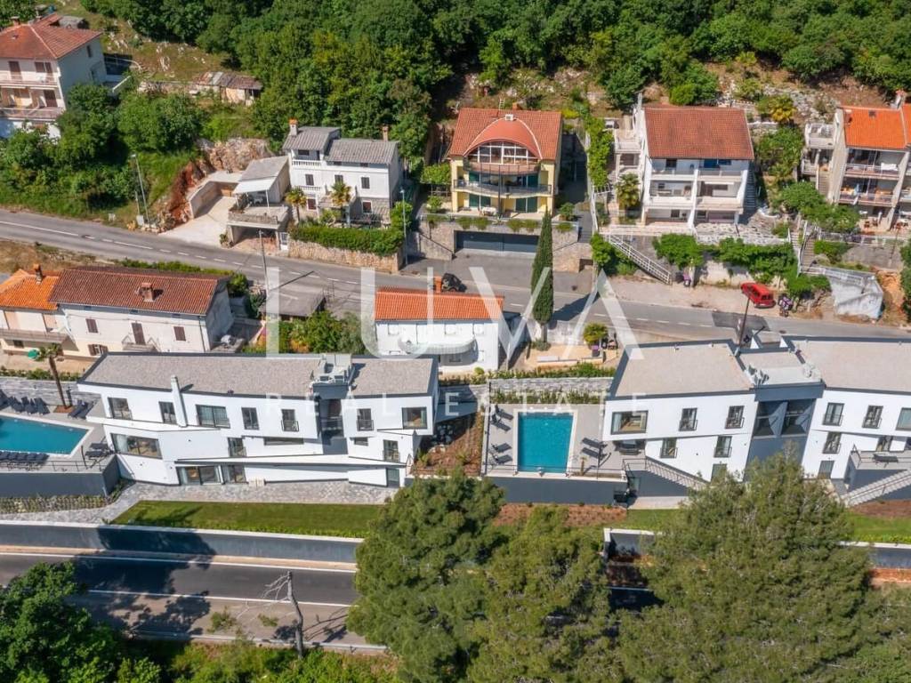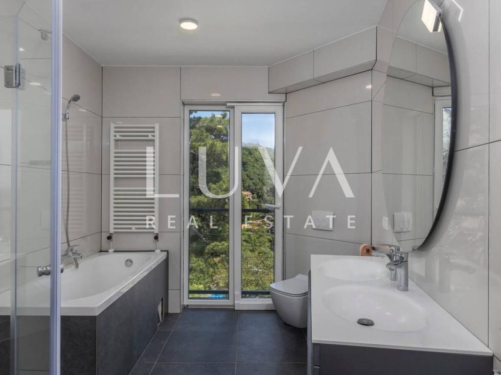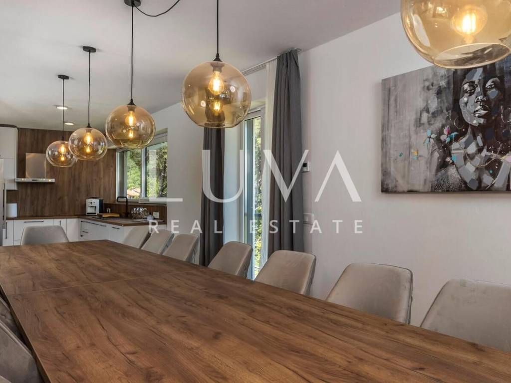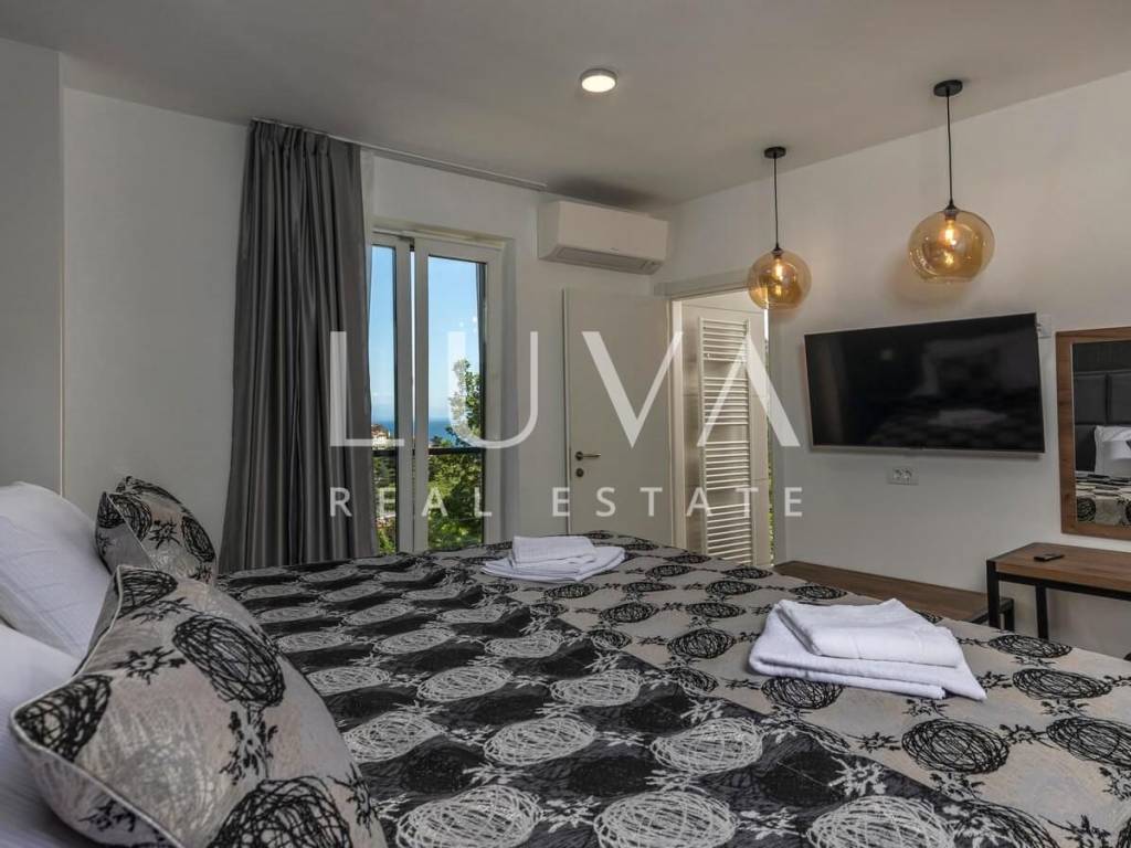 A luxury villa with a pool for sale in Mošćenička Draga, near Opatija. This modern luxury villa was built in 2022 and is located very close to the sea. It has 400 m² spread over 3 floors. The villa features a spacious living room, a fully equipped kitchen, 6 bedrooms, 8 bathrooms, and a wellness room with a sauna and Jacuzzi. The entire property is fully fenced and includes parking for 6 cars.