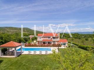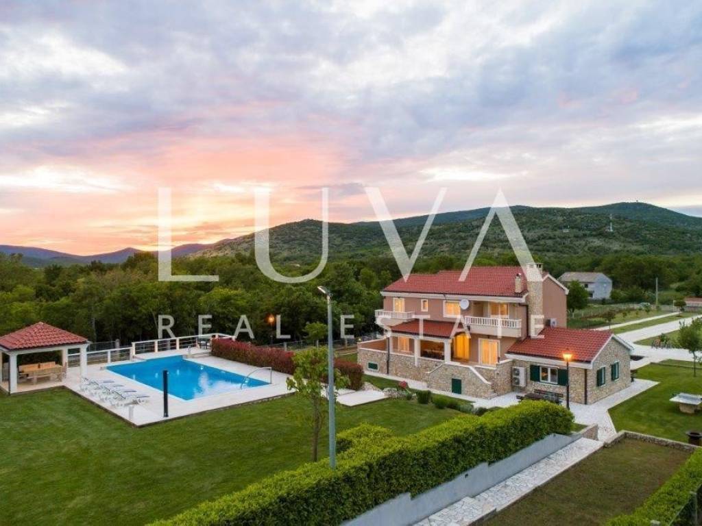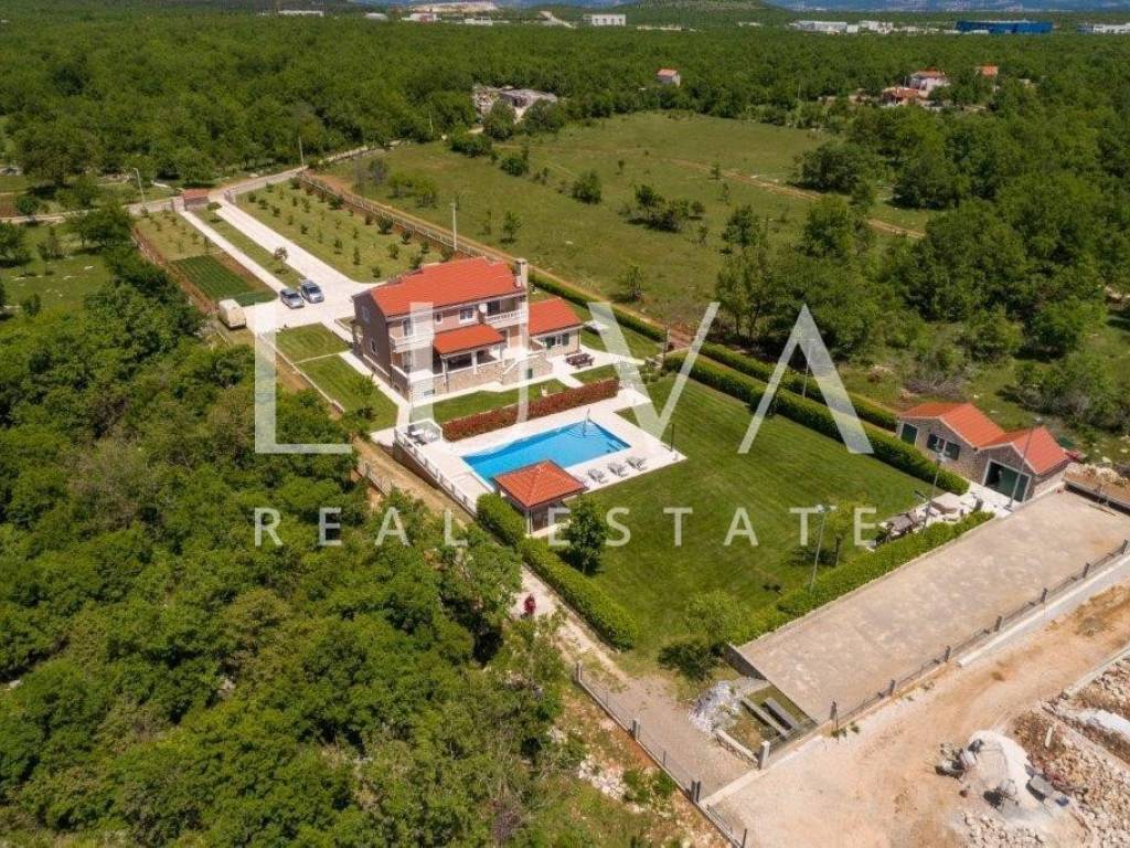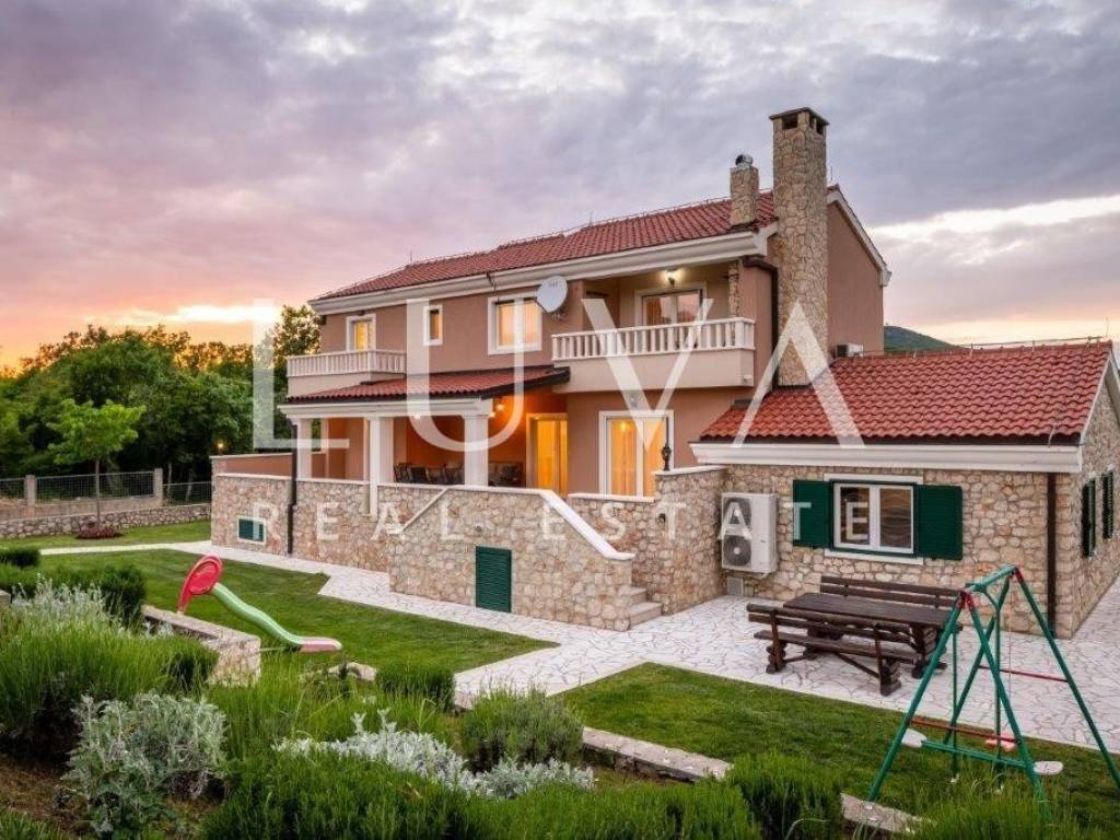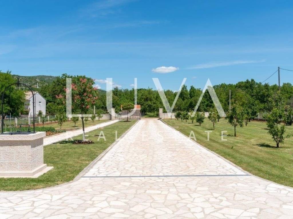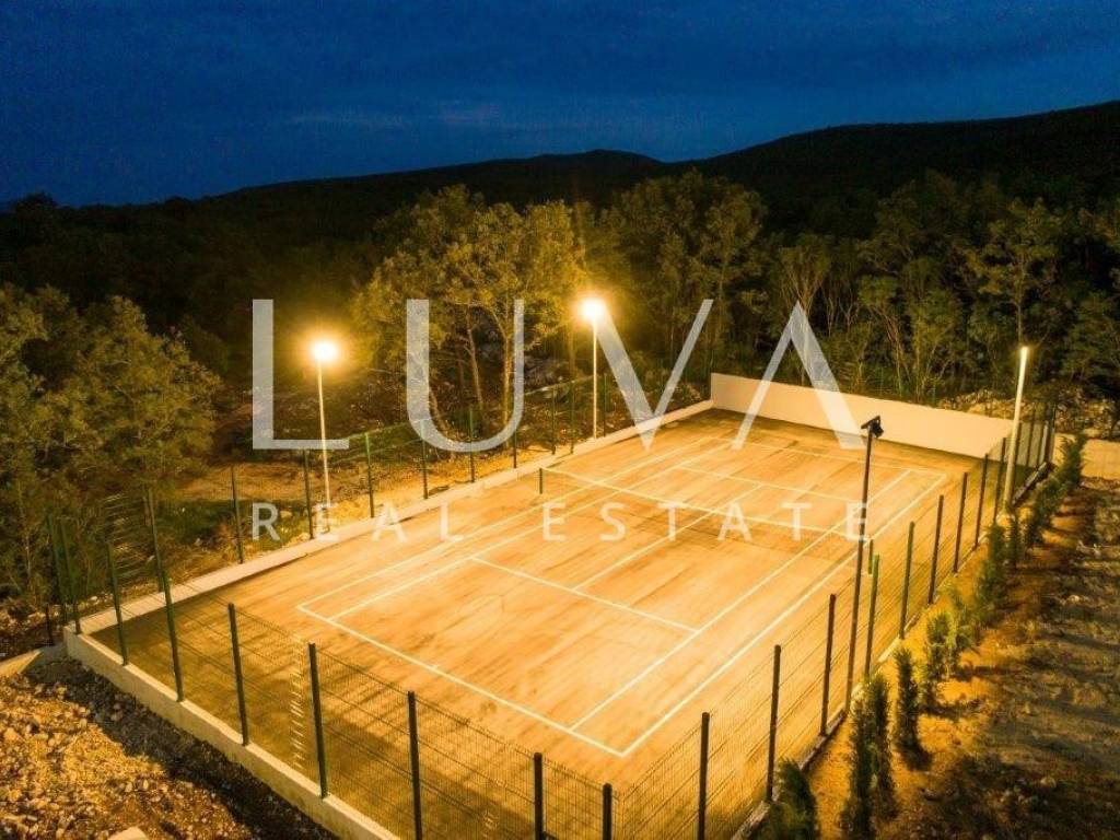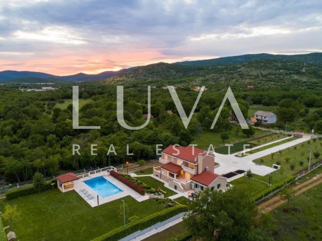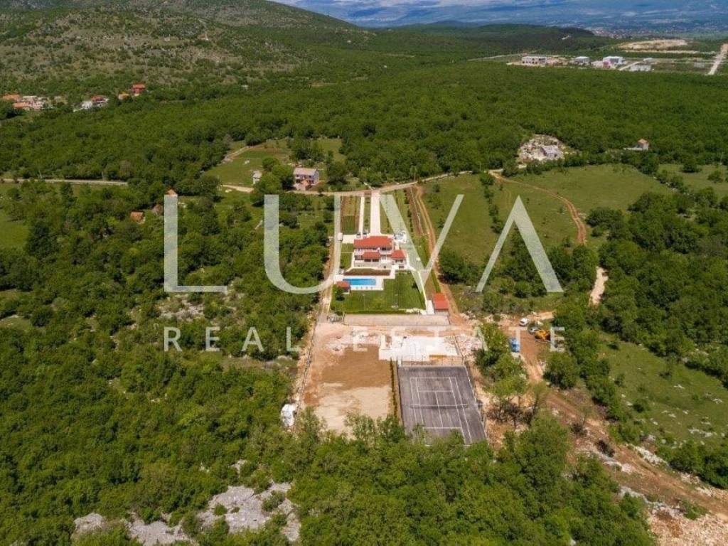 A holiday house is for sale, located on a large estate in Dicmo. Dicmo is a charming village in the Dalmatian hinterland, well connected to Split and just a few minutes' drive from the highway. The house is situated on an exceptionally large estate of 13,092 m², fully fenced, ensuring peace and privacy for its residents. Built in 2014, the house has a surface area of 270 m² and spans 3 floors. It features 6 bedrooms, 4 bathrooms, and 2 toilets. In front of the house, there is a large outdoor pool and a covered terrace with a dining table, while the back of the house provides ample parking space and a garage for 2 cars. In front of the pool, there is also a tennis court, and the estate has enough space for additional playgrounds, making it ideal for sports enthusiasts.