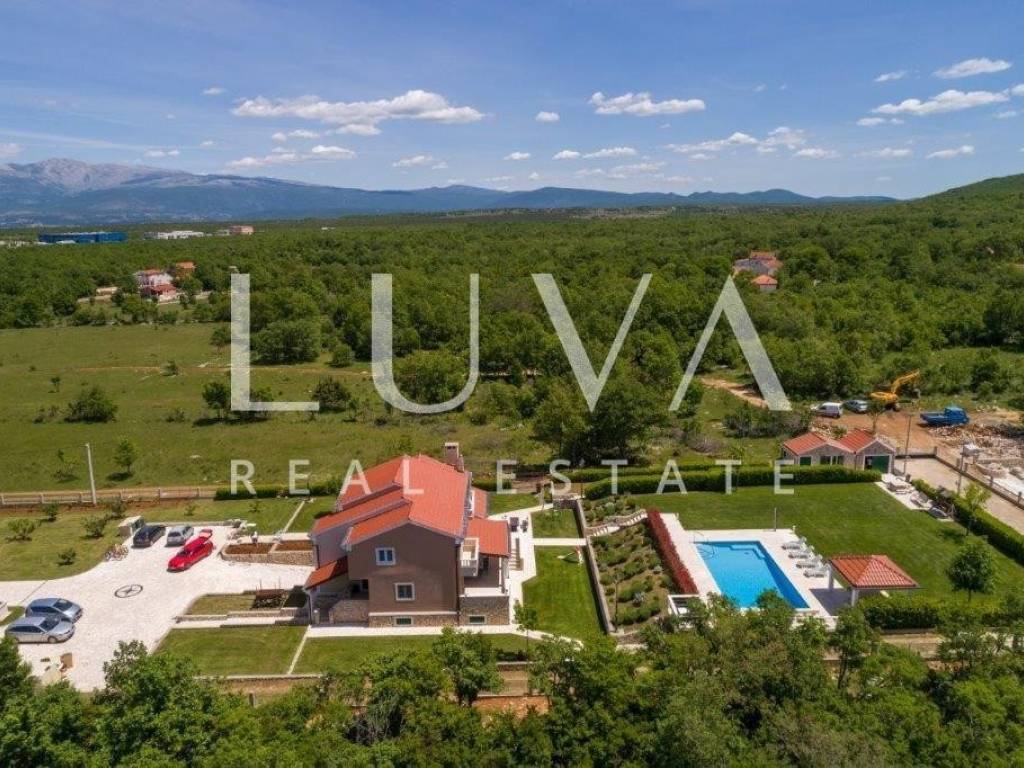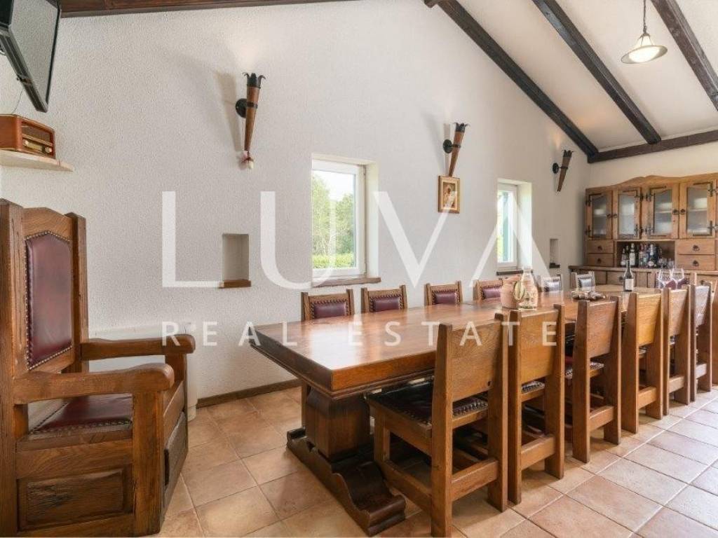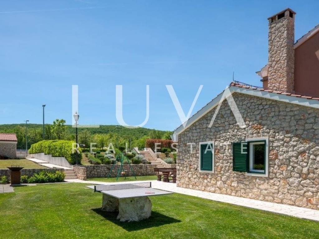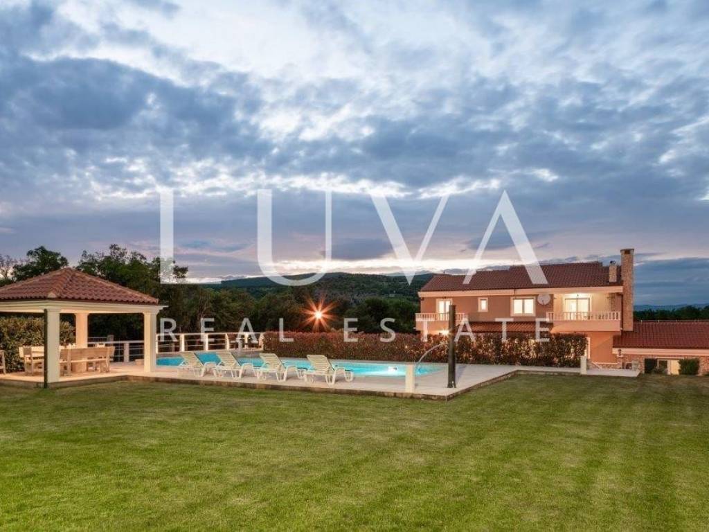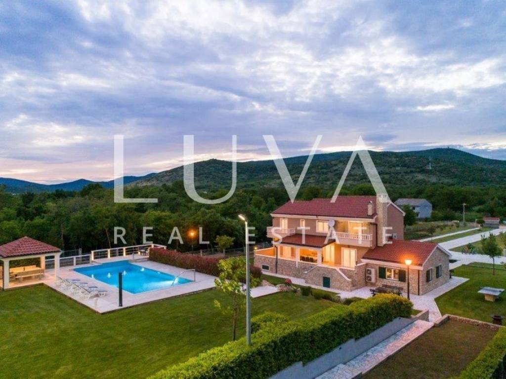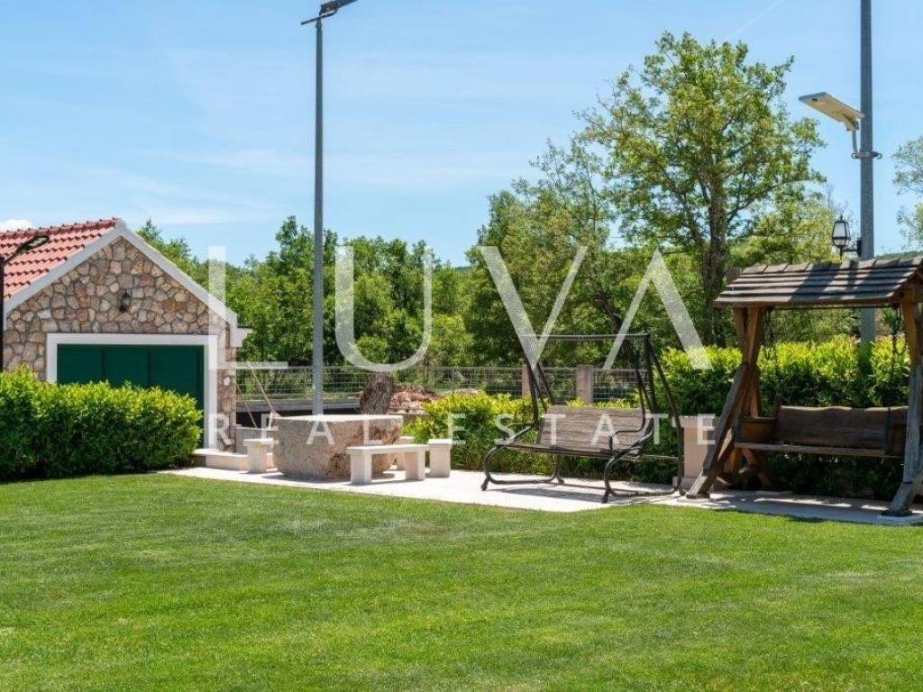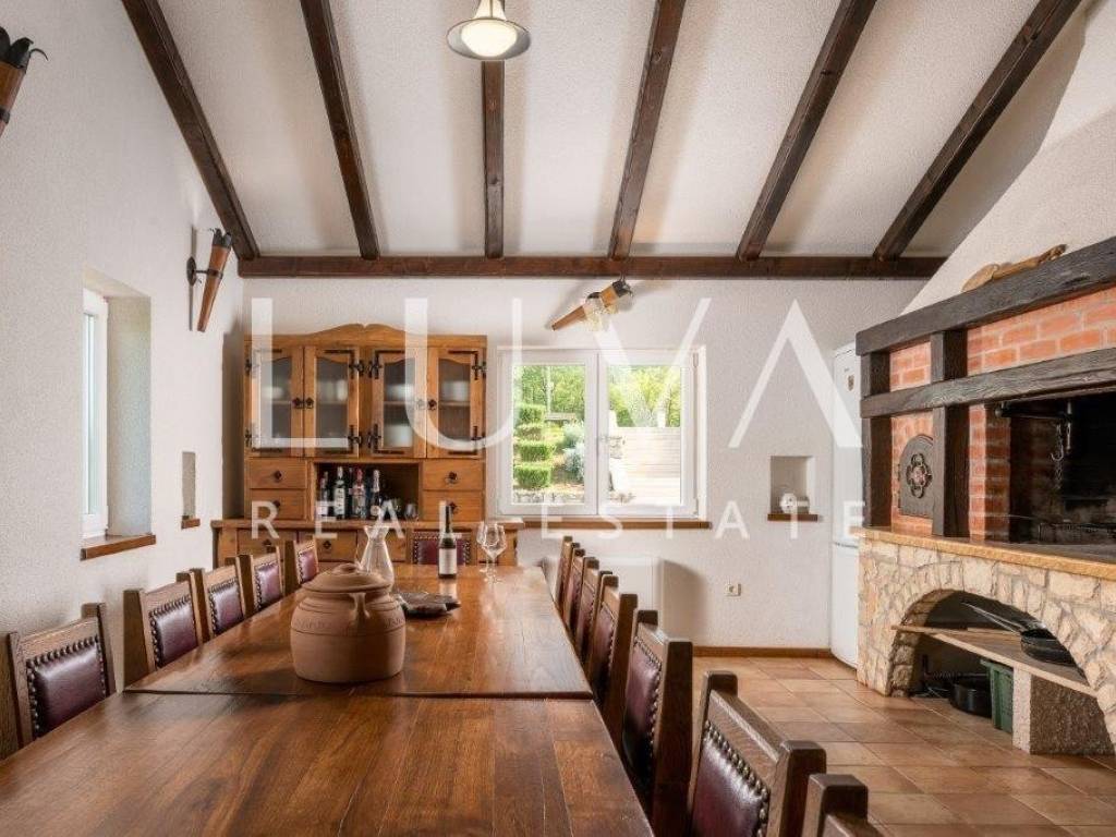 A holiday house is for sale, located on a large estate in Dicmo. Dicmo is a charming village in the Dalmatian hinterland, well connected to Split and just a few minutes' drive from the highway. The house is situated on an exceptionally large estate of 13,092 m², fully fenced, ensuring peace and privacy for its residents. Built in 2014, the house has a surface area of 270 m² and spans 3 floors. It features 6 bedrooms, 4 bathrooms, and 2 toilets. In front of the house, there is a large outdoor pool and a covered terrace with a dining table, while the back of the house provides ample parking space and a garage for 2 cars. In front of the pool, there is also a tennis court, and the estate has enough space for additional playgrounds, making it ideal for sports enthusiasts.