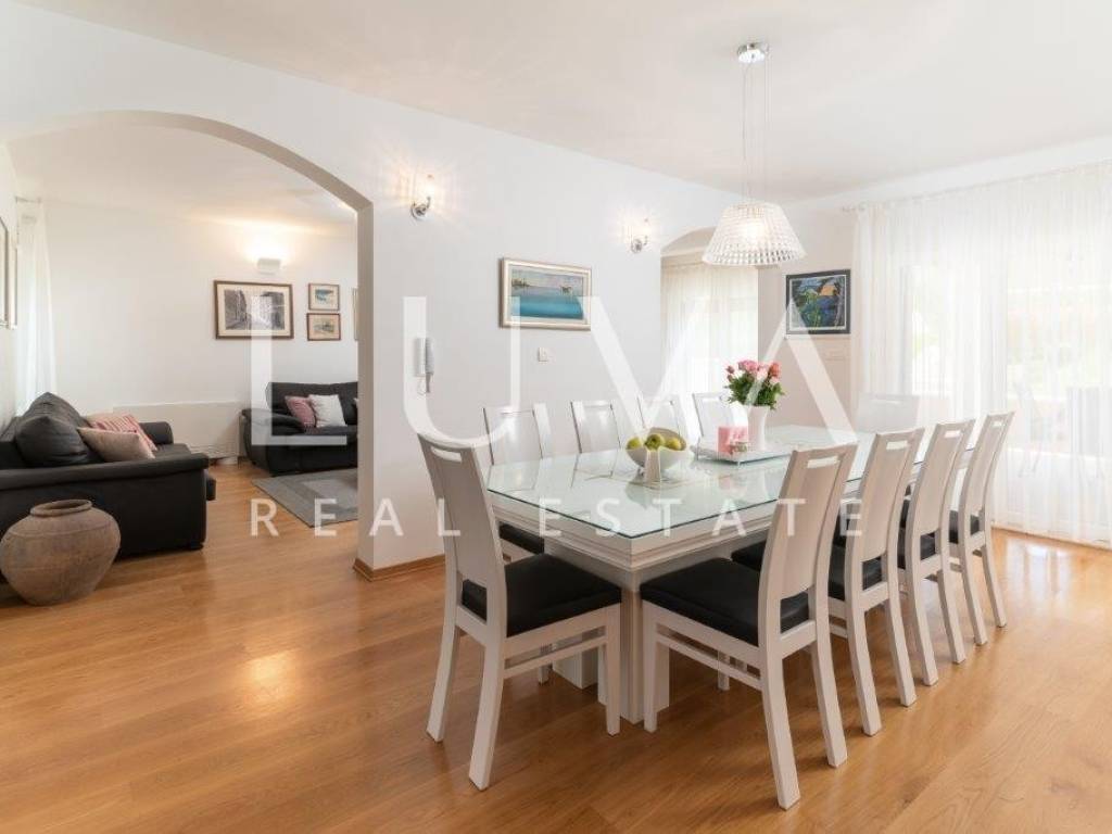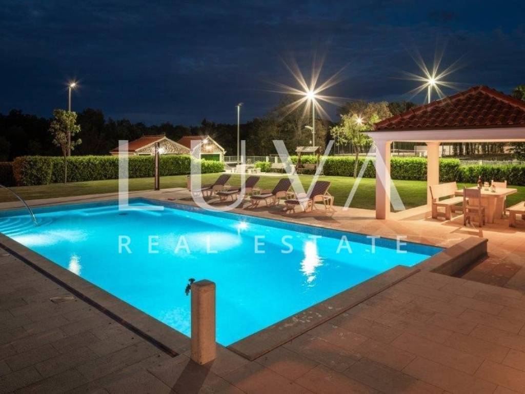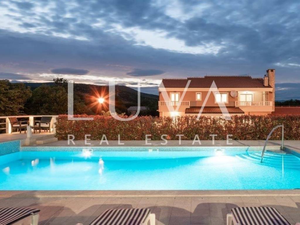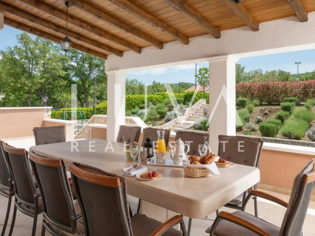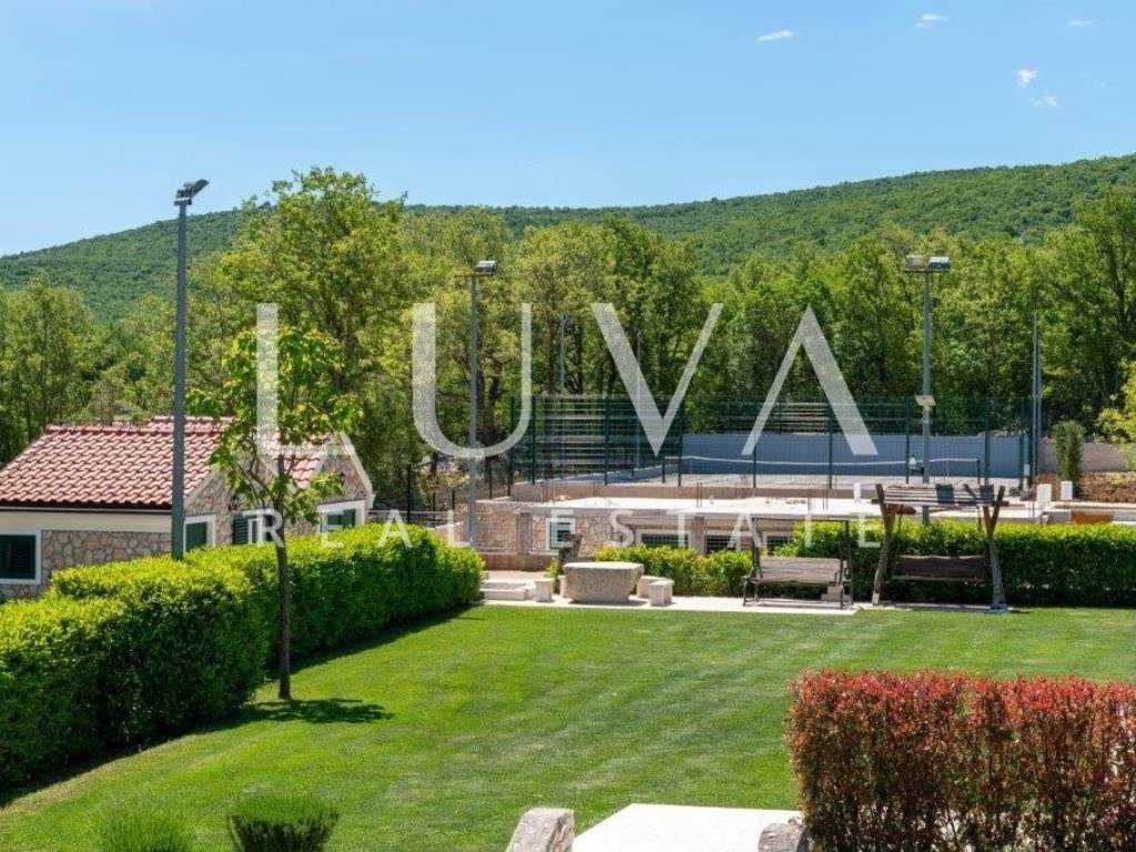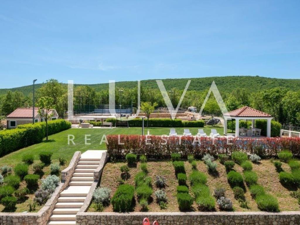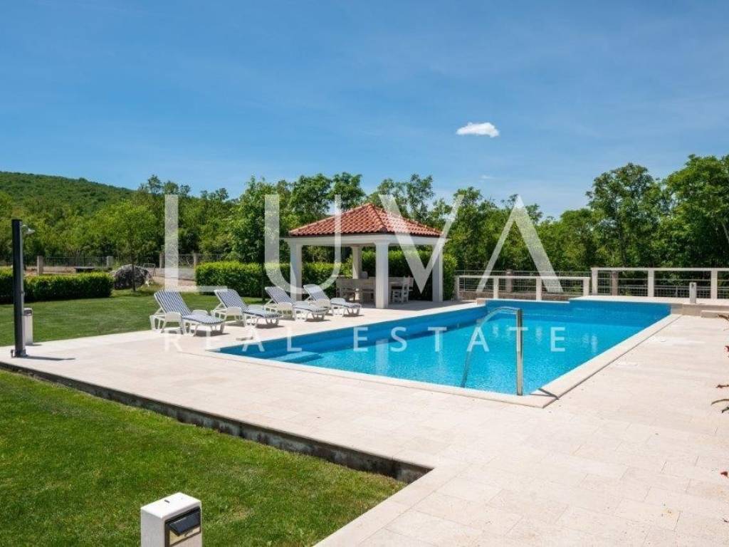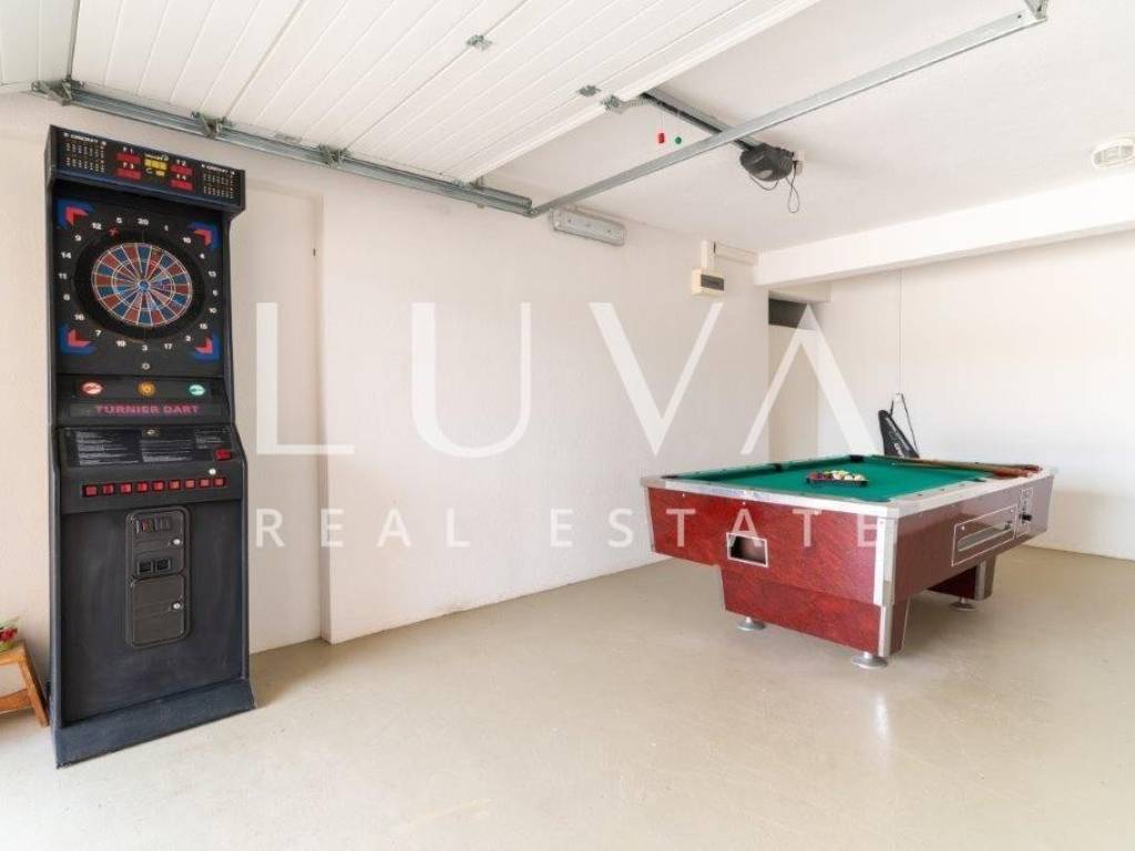 A holiday house is for sale, located on a large estate in Dicmo. Dicmo is a charming village in the Dalmatian hinterland, well connected to Split and just a few minutes' drive from the highway. The house is situated on an exceptionally large estate of 13,092 m², fully fenced, ensuring peace and privacy for its residents. Built in 2014, the house has a surface area of 270 m² and spans 3 floors. It features 6 bedrooms, 4 bathrooms, and 2 toilets. In front of the house, there is a large outdoor pool and a covered terrace with a dining table, while the back of the house provides ample parking space and a garage for 2 cars. In front of the pool, there is also a tennis court, and the estate has enough space for additional playgrounds, making it ideal for sports enthusiasts.