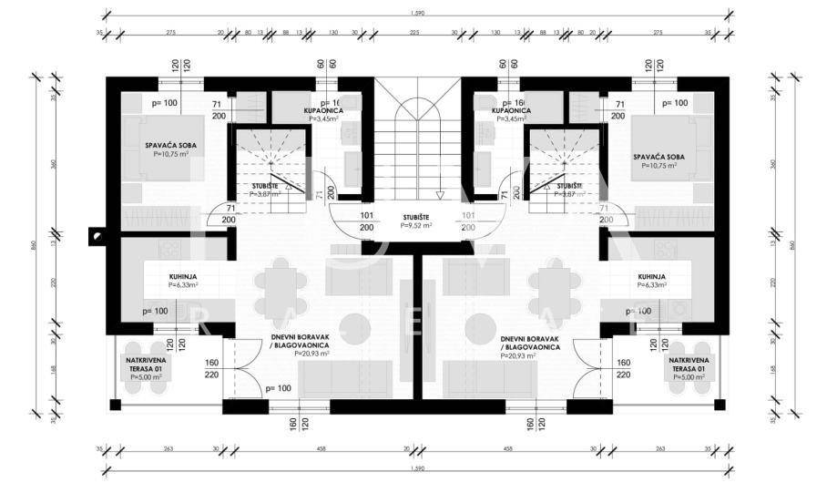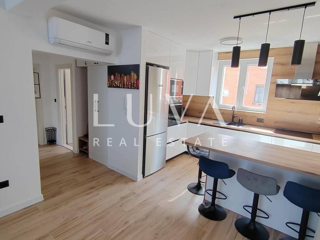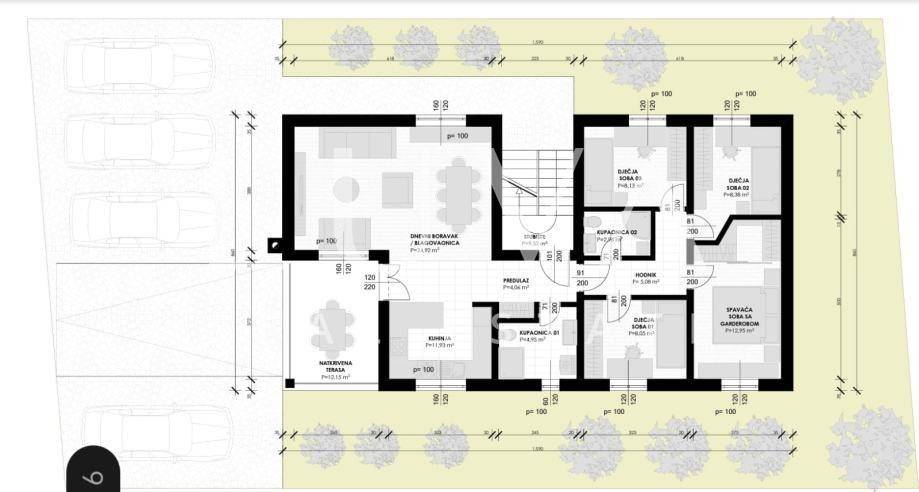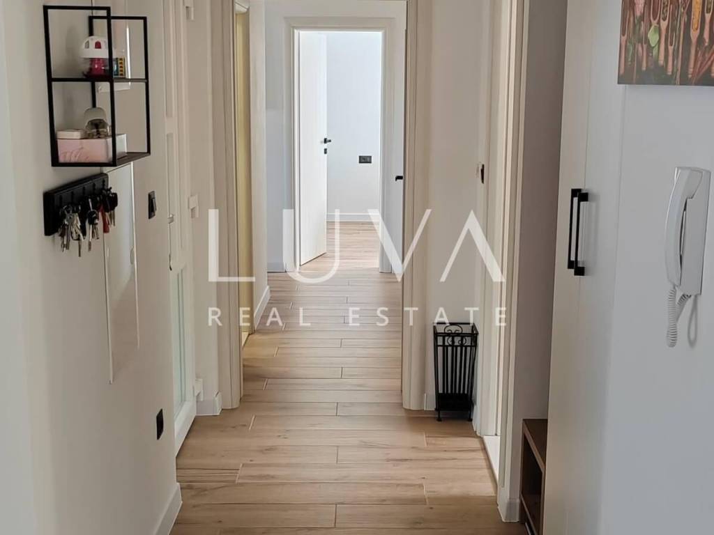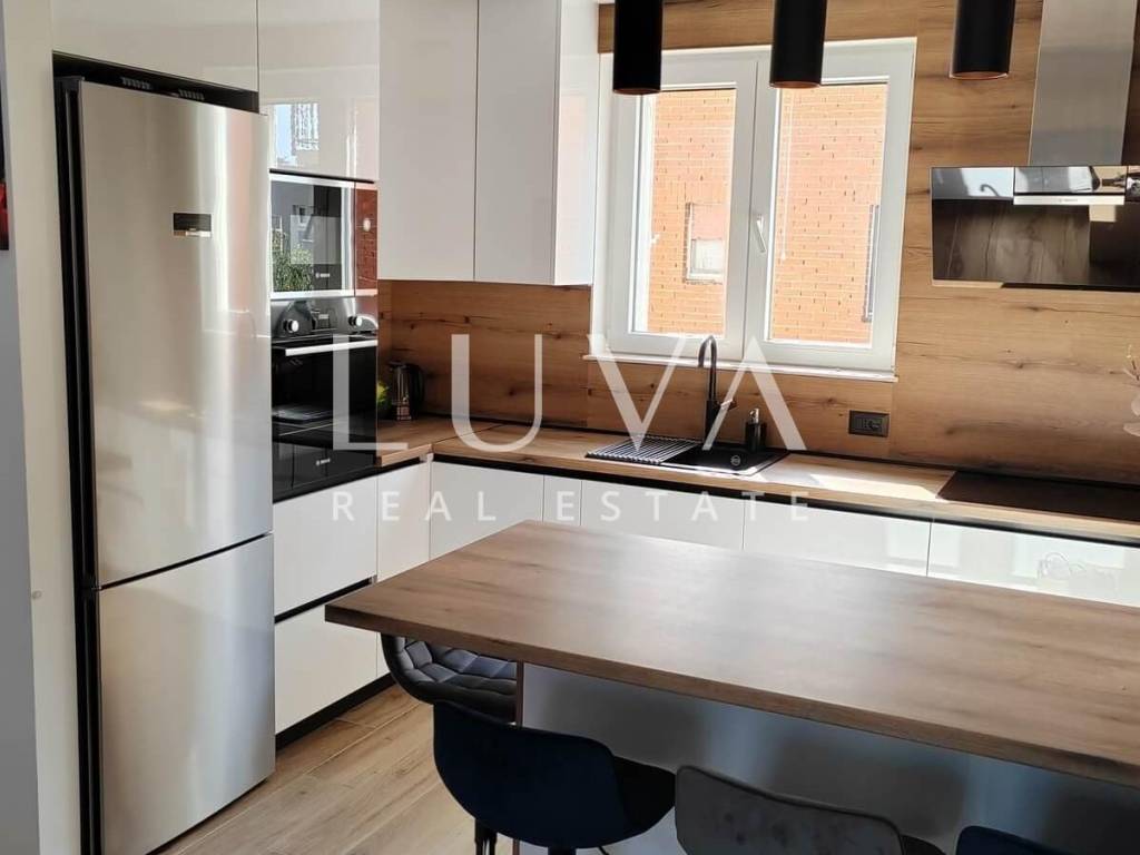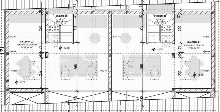 The apartment on the ground floor has underfloor heating throughout the entire apartment + air conditioners, the apartments on the first floor have underfloor heating in the toilets + air conditioners. The highest quality materials were used during construction: Aluminum shutters, Gelan 7-chamber windows with 3-layer glass, Velux windows with different opening models, 10 cm Styrofoam facade, partition walls built with 10 cm Porotherm bricks, Harman garage doors and internal garage spaces with provision for charging electric cars, on the roof storage preparation for solar panels. We are at your disposal for all additional questions