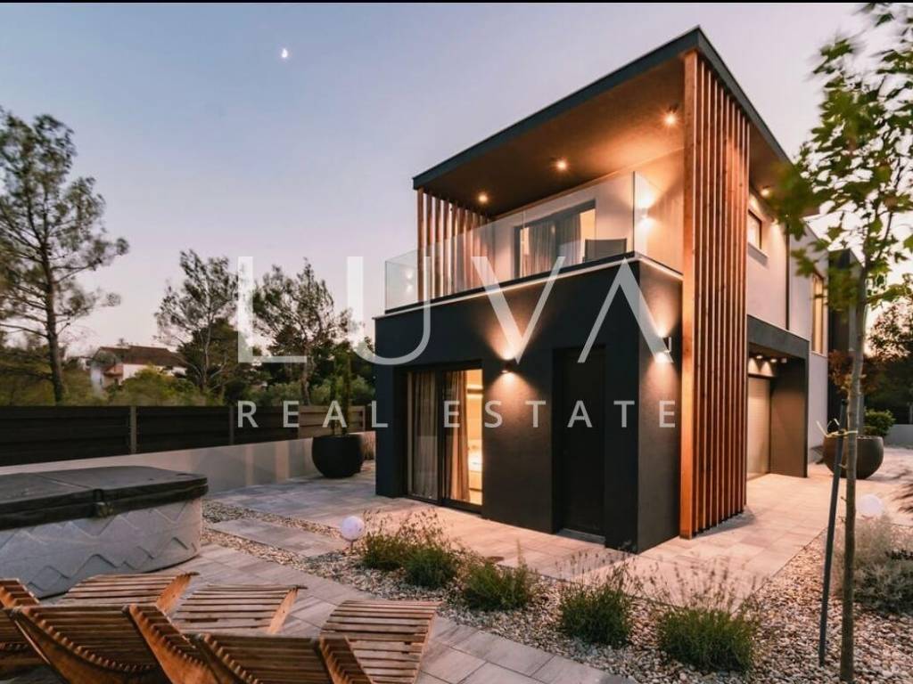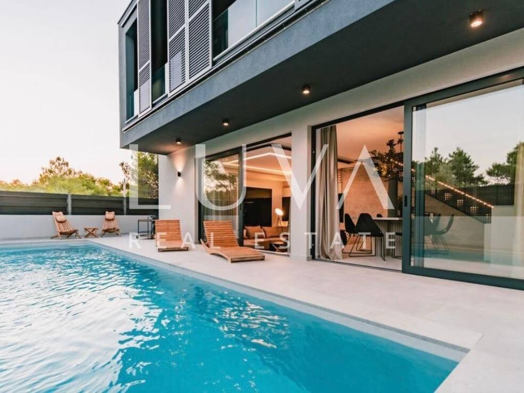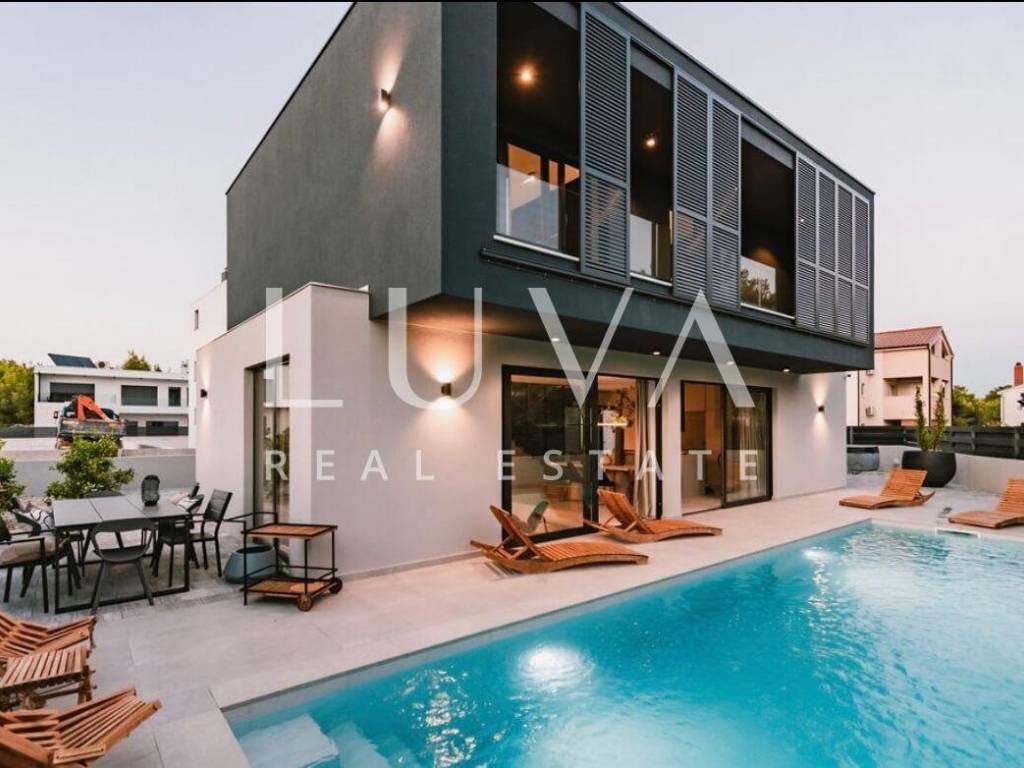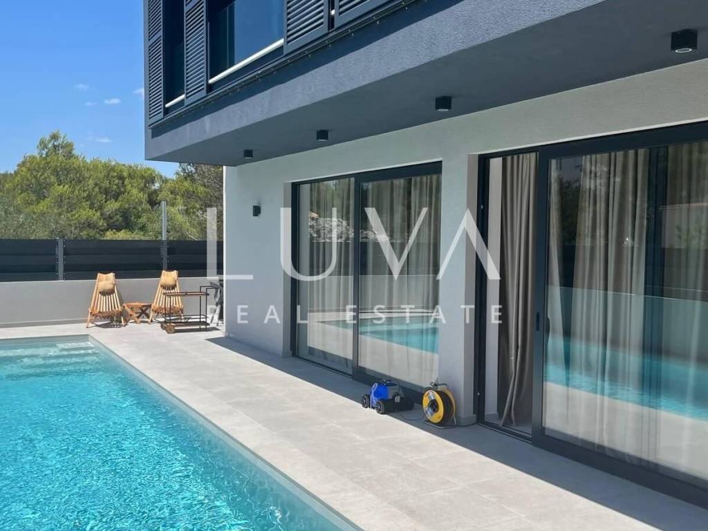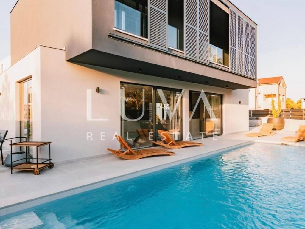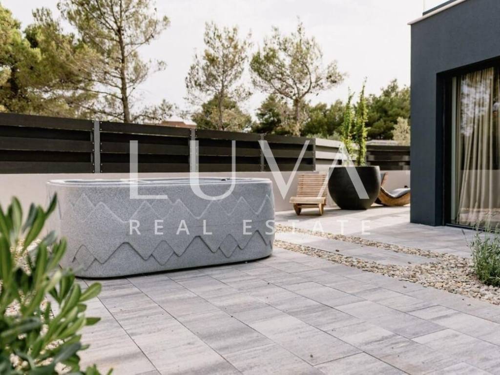 For sale: A luxury house with a pool in the quiet village of Srima, adjacent to the popular destination Vodice on the Dalmatian coast. The house is situated on a fully enclosed 200 m² estate, just a short distance from the sea. Completed in 2018, the house spans 200 m² across two floors and is designed in a modern style. In front of the house is an outdoor pool, with a Jacuzzi and dining table on the side.